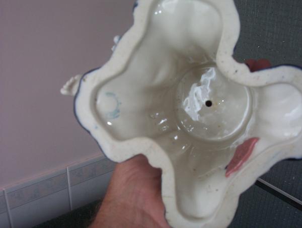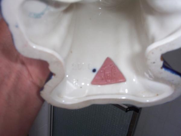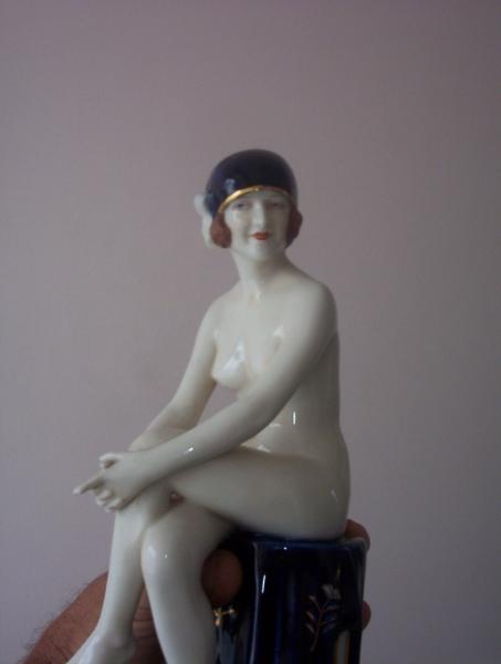 Art Nouveau? Royal Dux Figurine.. Nude, seated cross legged on a stand with cobalt blue drapery & gilt accents.. Cobalt blue cap with gilt trim, brown hair. Has 'ROYAL DUX BOHEMIA' pink triangle with an acorn with an 'E' therein. On the LHS of the triangle, next to the blue 'test spot', is the number '2998'. There is also a blue stamp to the LHS of that. In excellent condition, no cracks, crazing or repairs.. All the gilt is in superb condition.. It came to me from my Grandfather, who was an avid collector of Royal Doulton figurines (all delicate 'girly' stuff tho). Whilst I could have chosen any of the Royal Doulton, this was the only one that caught my eye, I've loved her from the moment I laid eyes on her. I've no idea of her age or insurance value.. I did choose 1 piece of Royal Doulton, more 'Manly' than the ballerinas, etc. It's a large (15"), heavy wall plate, showing an embossed/raised picture of the 'HMS VICTORY' under full sail. The plate is brown in colour. I've been told that it is called a 'Charger', but once again, I'm not sure of this, or it's insurance value.. Can anyone help?..