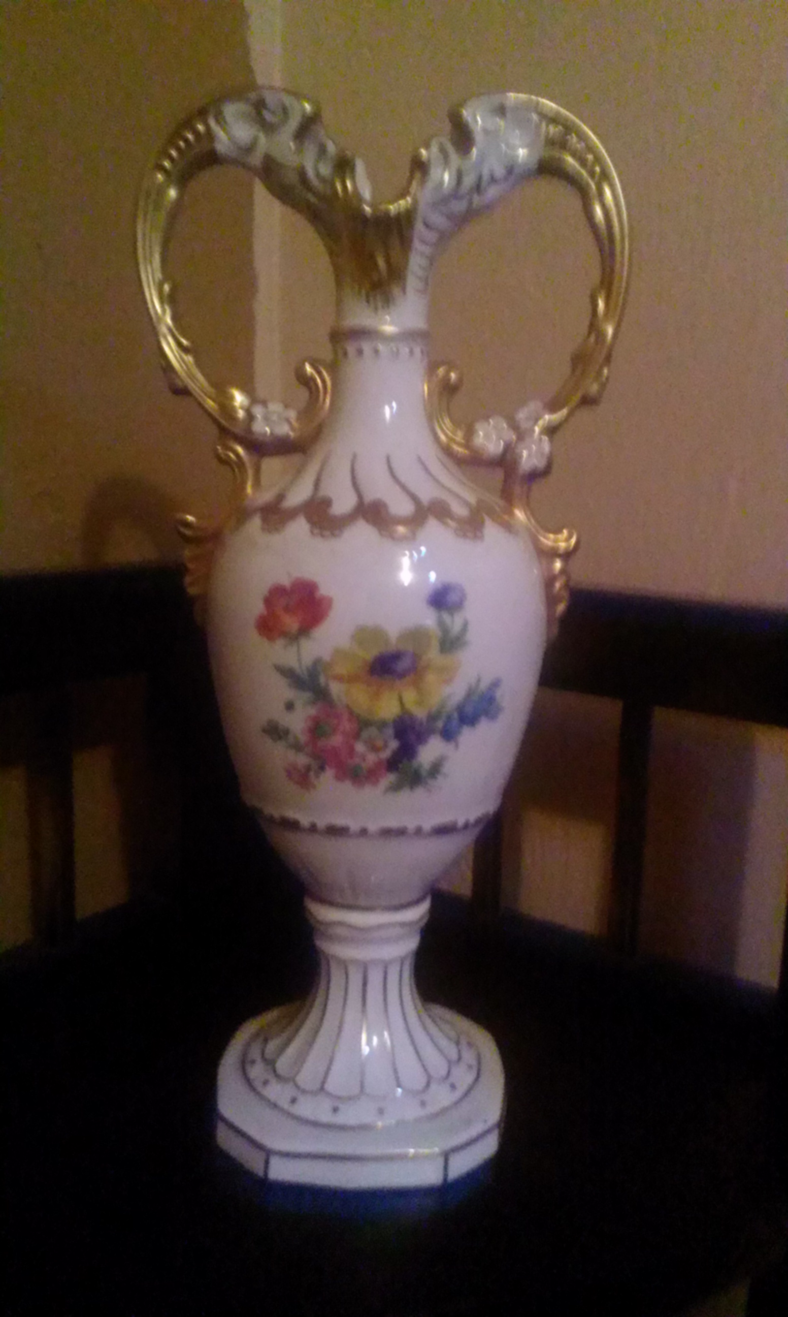 THIS BEAUTIFUL VASE HAS NO CRACKS, SCRATCHES OR REPAIRS ITS OFF WHITE WITH GOLD TRIM AND FLOWERS ON BOTH SIDES,