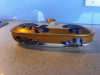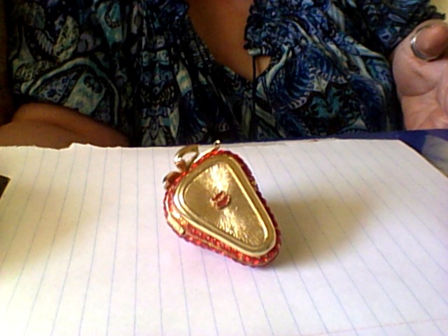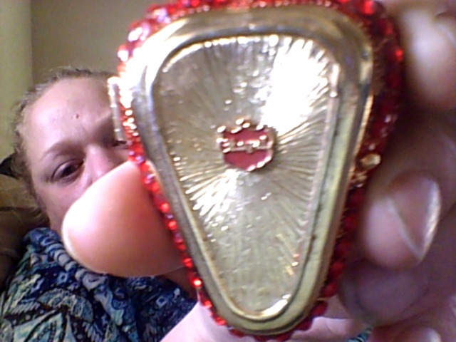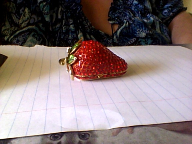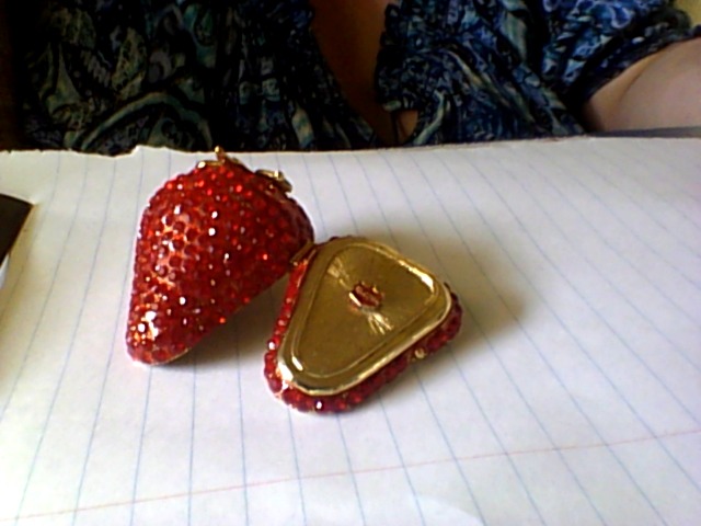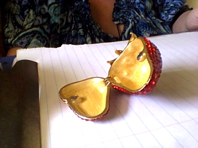 it is in the spape of a strawberry but flat on one side it opens up it is covered in red crystals with a gold trim and green leaves it has a emblem on it that says Royal. when u open it it has a brilliant yellow swirl coloring .