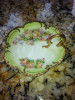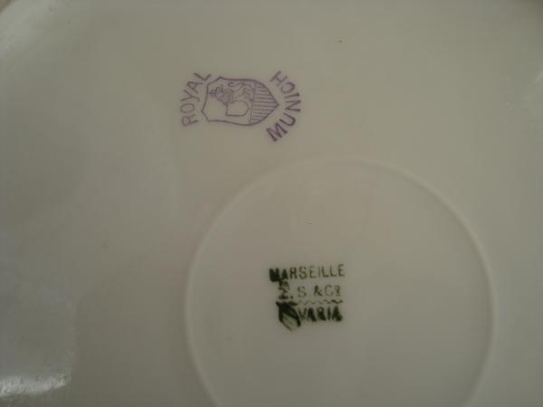 10 inch round sculptured plate with gold around edge. Large pink roses. Two handles on each side built into plate. Two stamps on back of plate. One says Royal Munich with a crest between those two words. The second says Marseille Z.S&C Varia