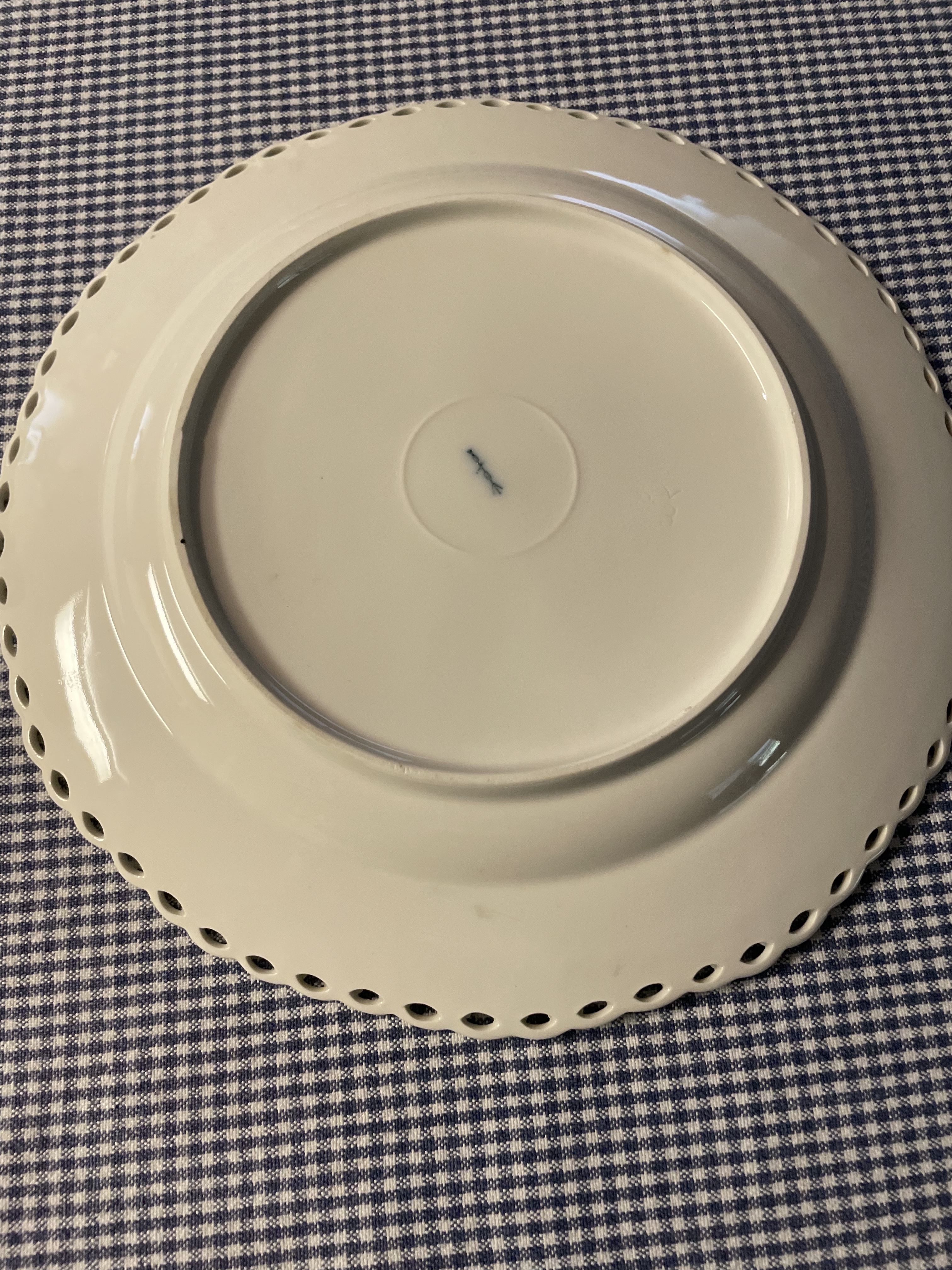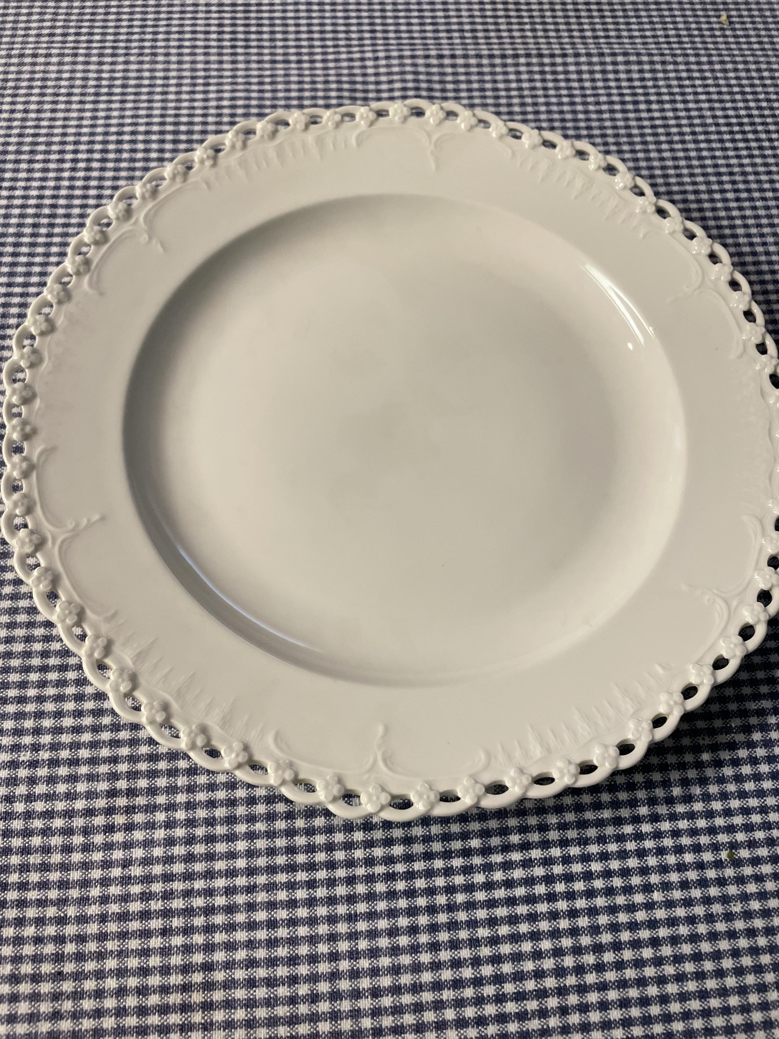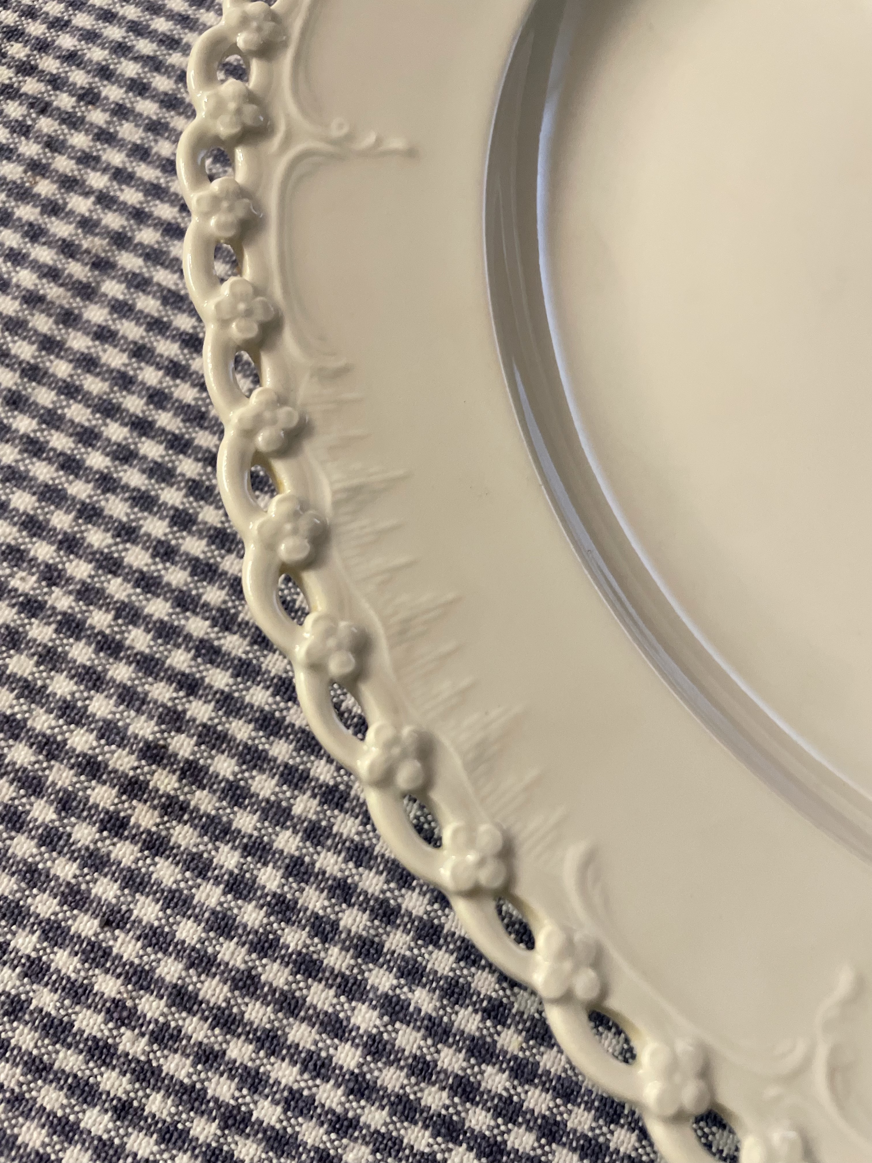 Set of six, white plates with reticulated edge.