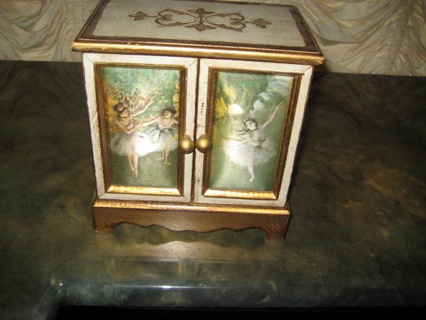 WOODEN JEWEL BOX WITH MUSICAL CHIME GREENSLEEVES I BELIEVE LINE RED VELVET DRAWERS ALL WOOD GILDED