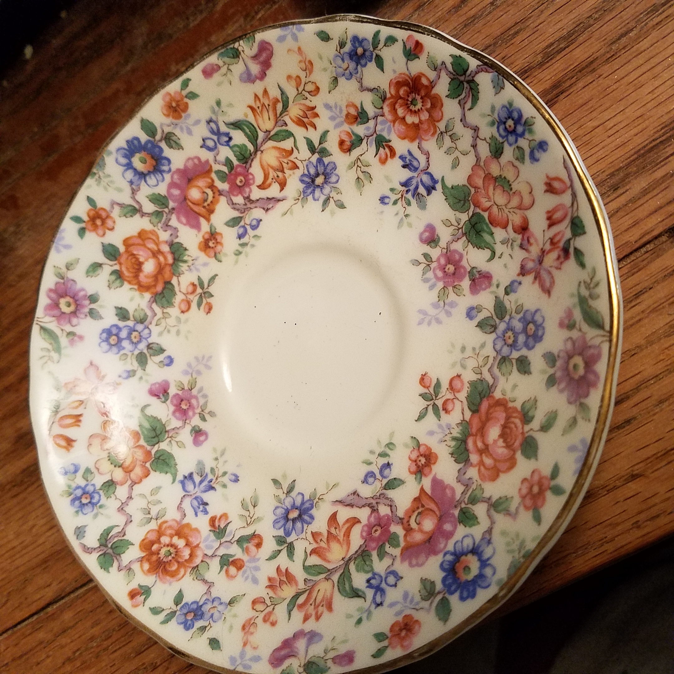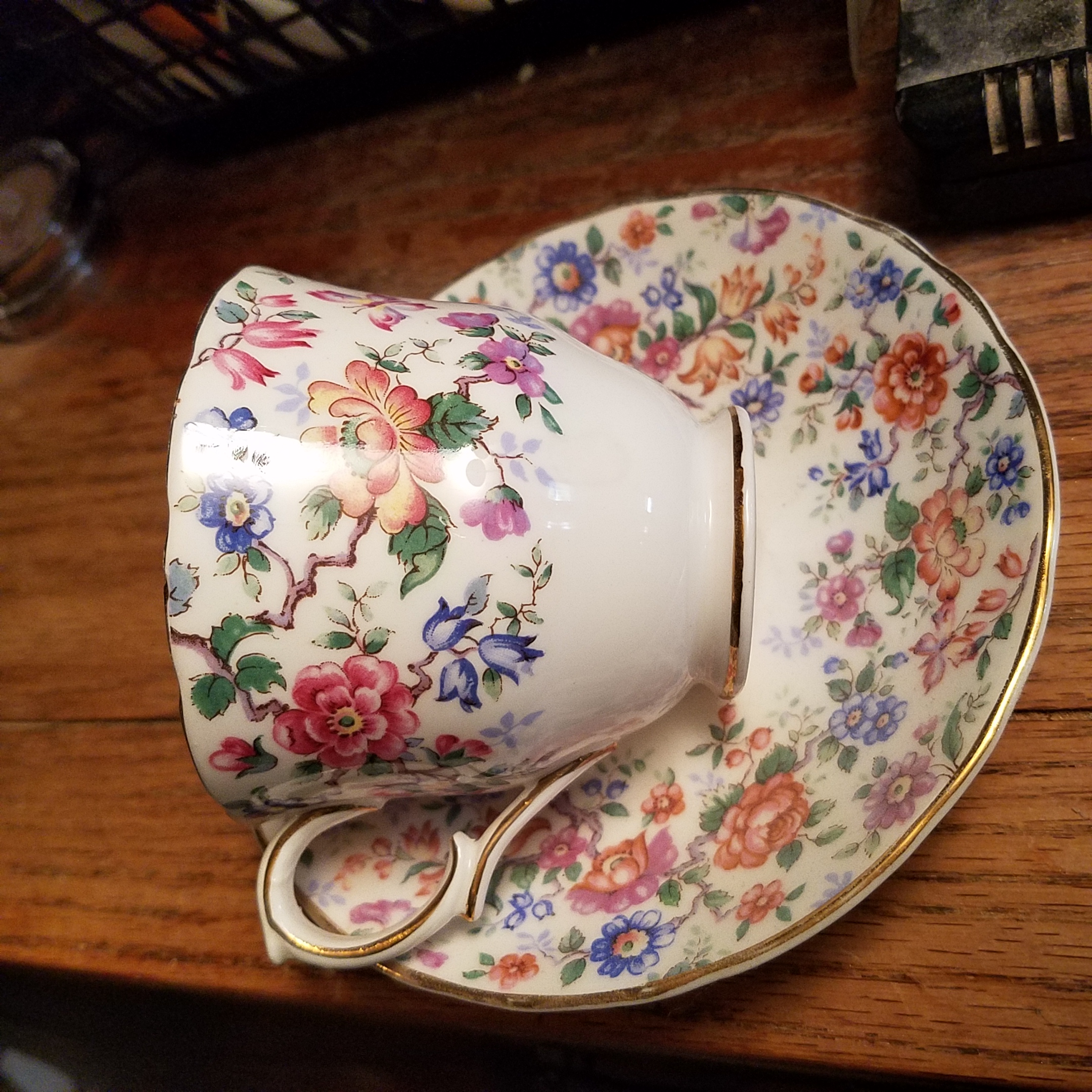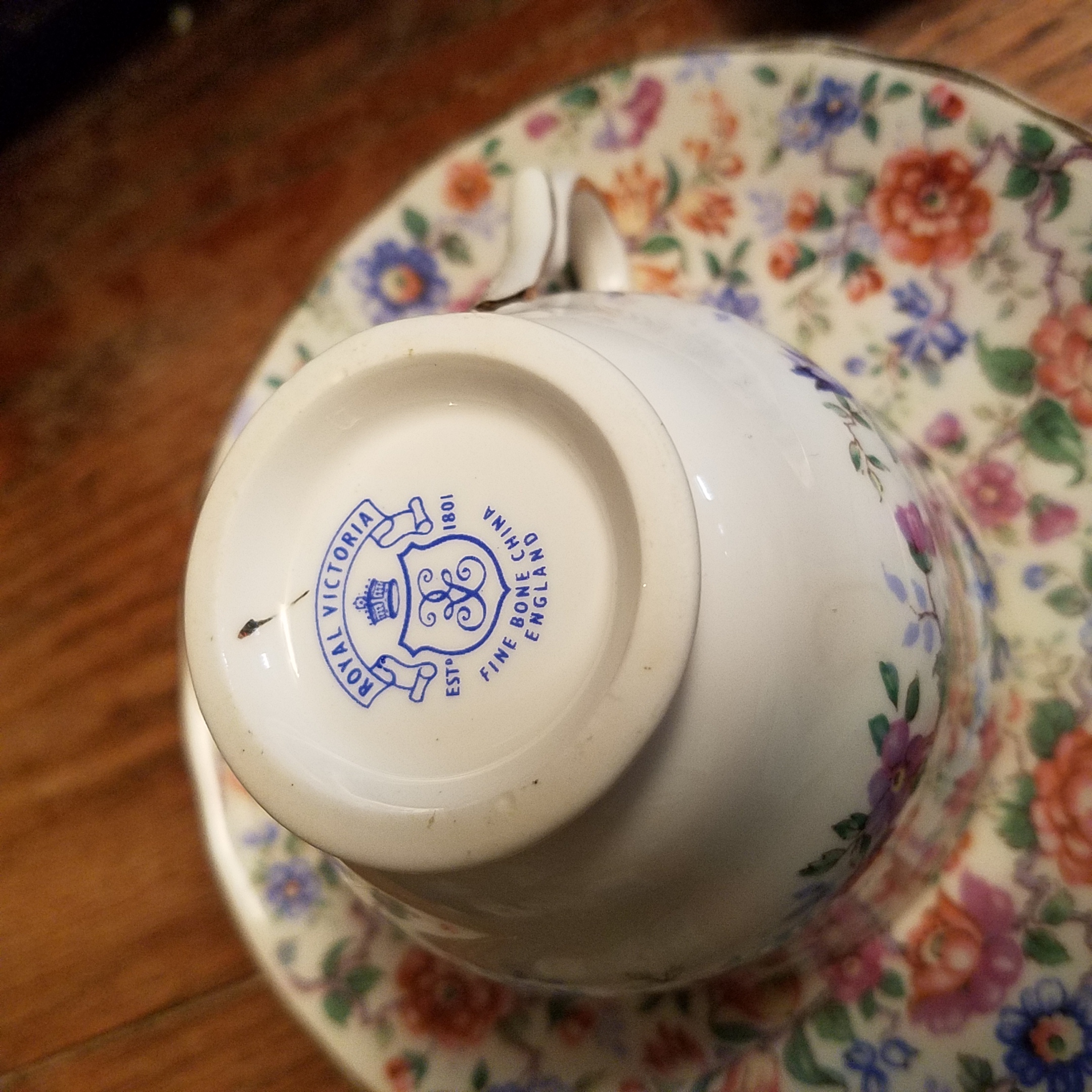 Royal Victoria Fine Bone China England Teacup and saucer set with blue, purple and pink flowers.