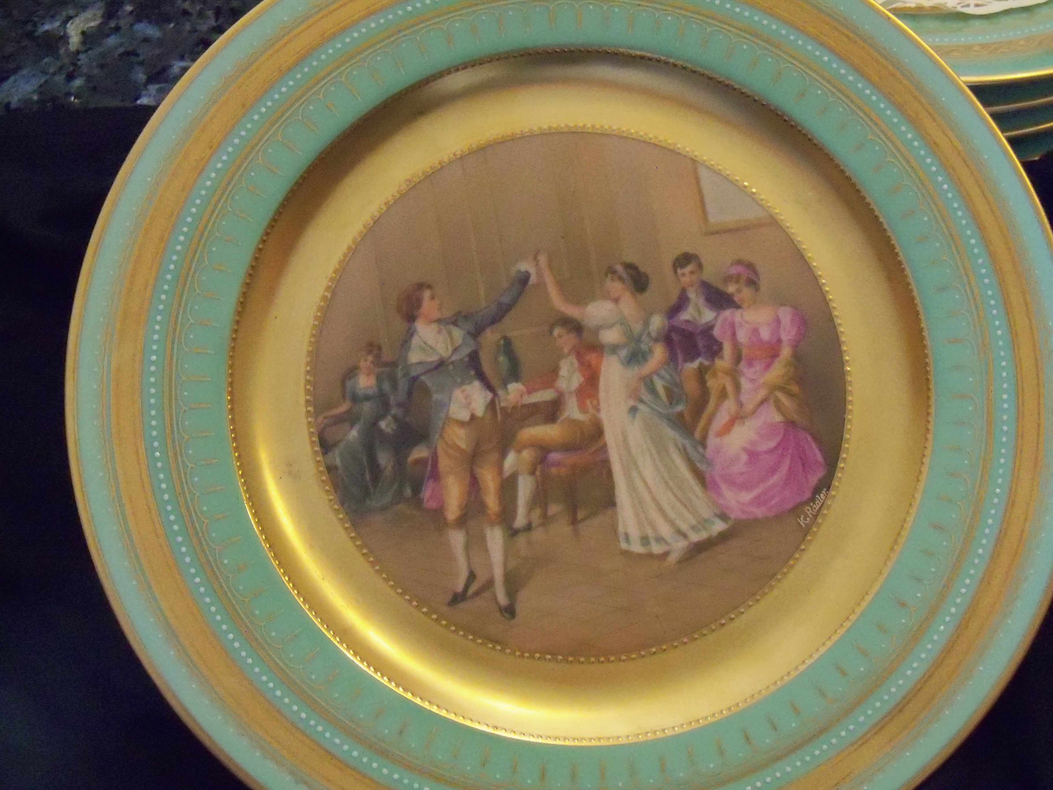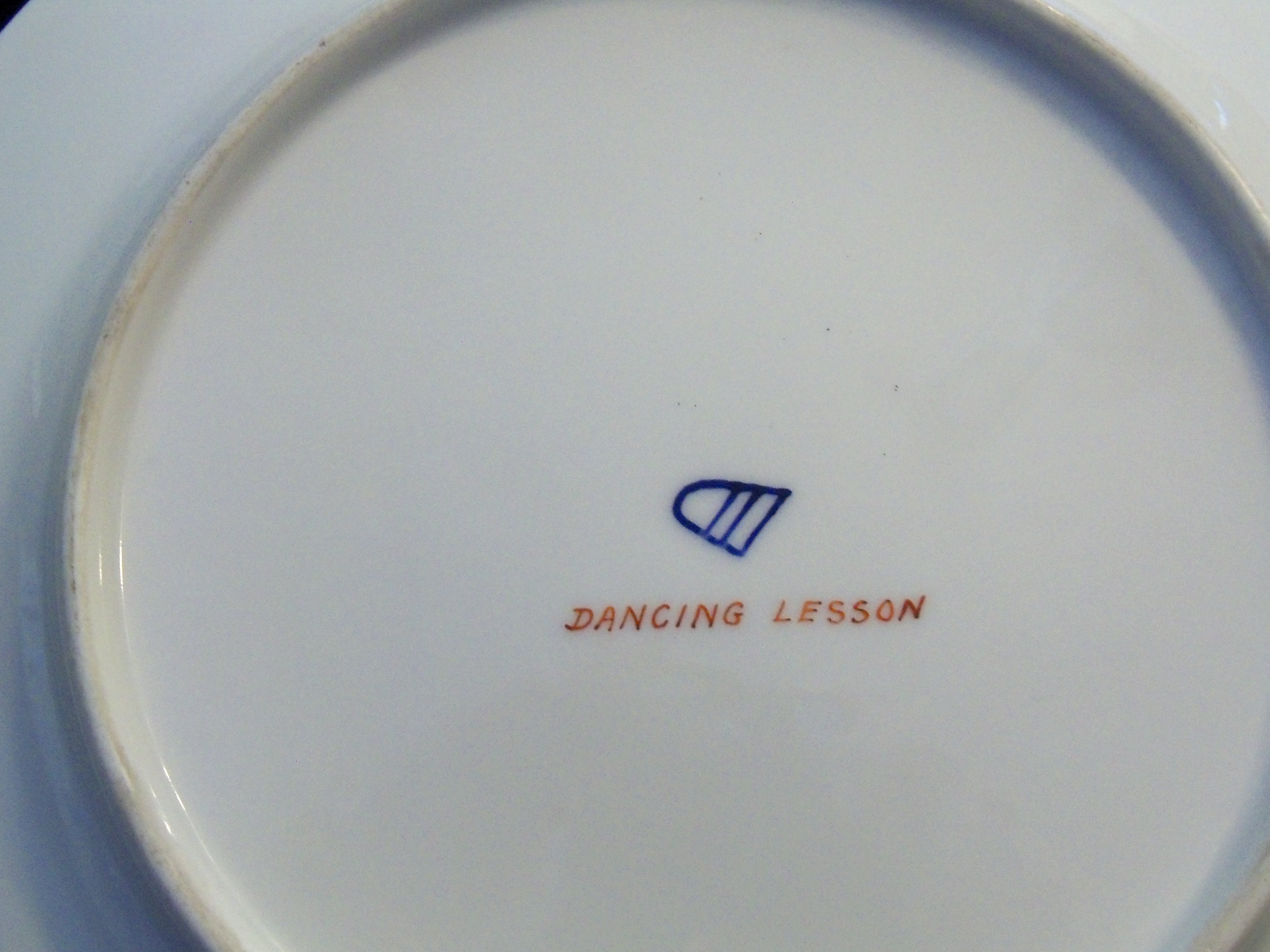 Porcelain plate entitled " Dancing Lesson" has Royal Vienna beehive mark and title on back. Excellent condition...no blemishes. I have a number of other plates in this pattern with different titled scenes.