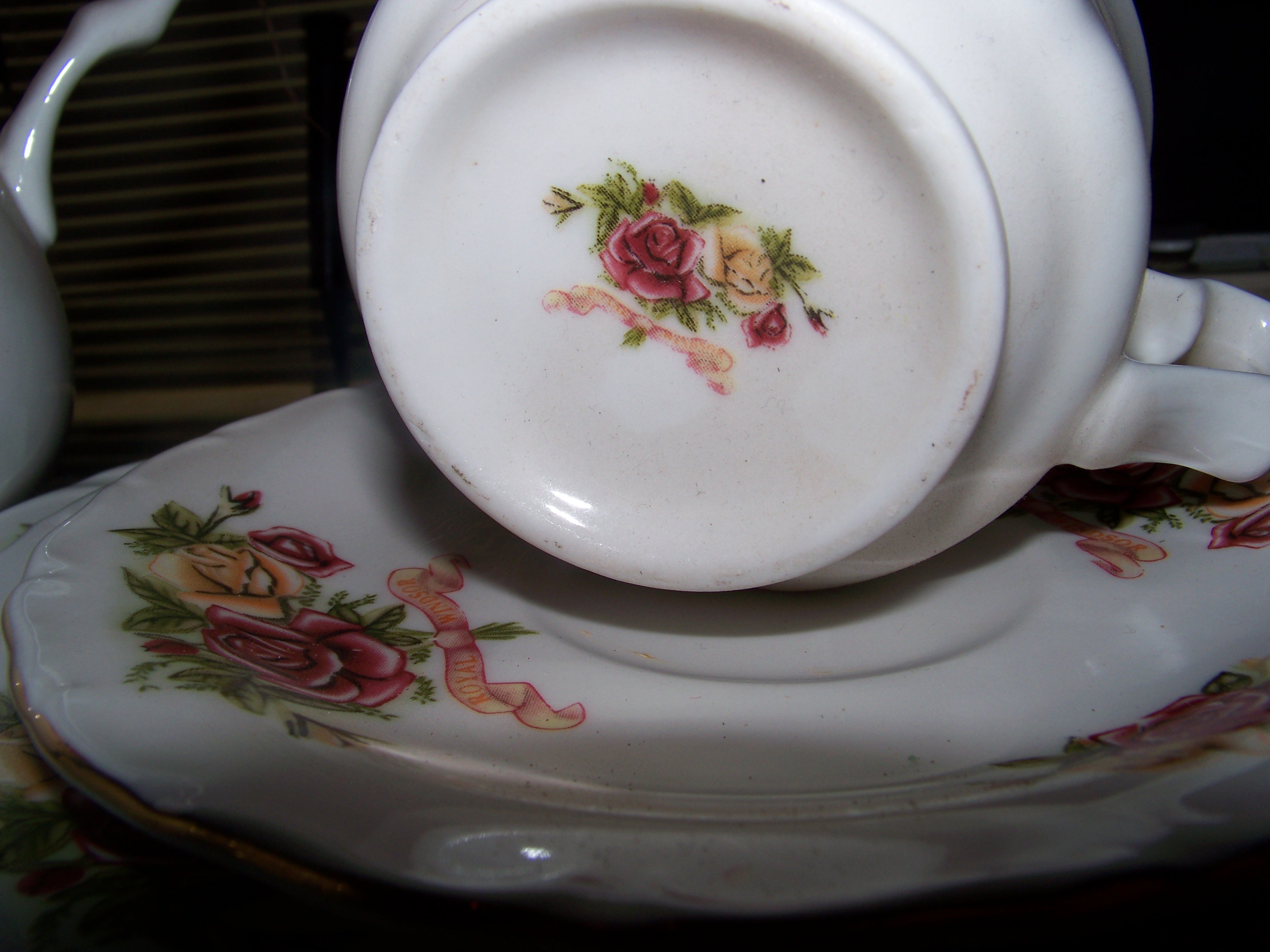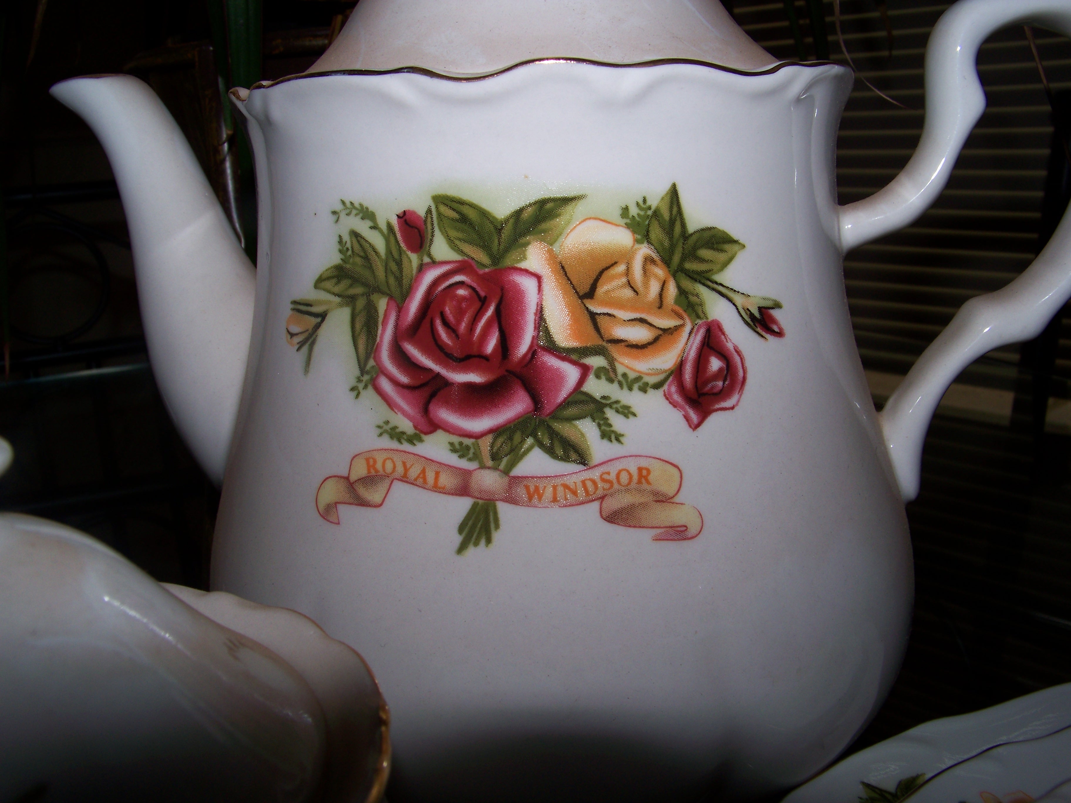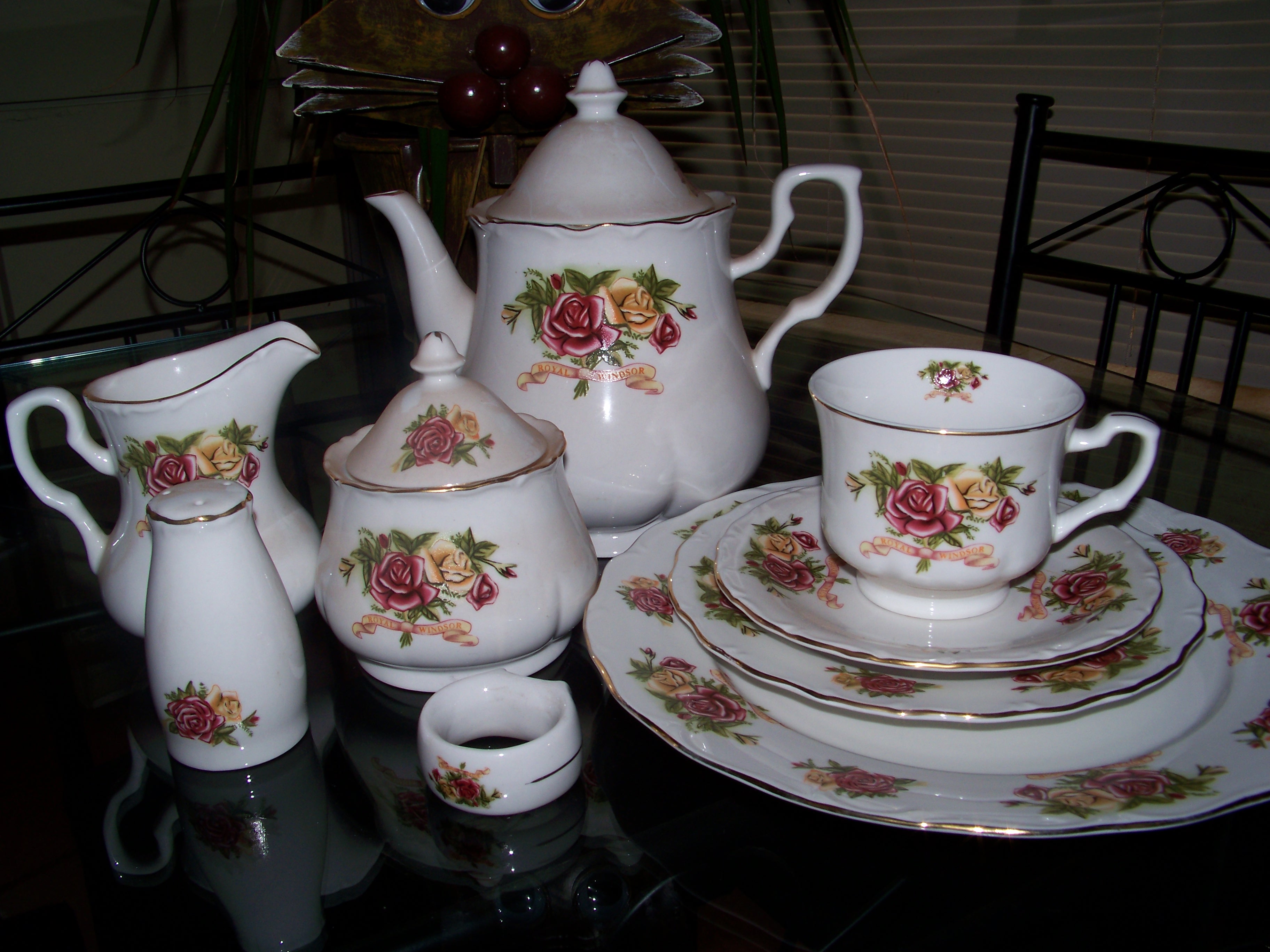 62 PIECE ROYAL WINDSOR. ORIGAN UNKNOWN. YELLOW AND PINK MOTIVE ON PIECES.