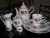 Coffee cups with gold trim top bottom and handles. Art on both sides. one side features a man wearing a george washington wig laying in the grass pussing a swing for a woman in a pink dress. the other side is a woman in the same era it seems with a hat carrying fruits and whatnot going down the stairs with a child that she is feeding grapes while a man in a white wig watches, possibly is spying. on the bottom of the mugh it says Royal Windsor fine bone china england and the numbers 17004 or 77004 are written in gold. there are 3 cups