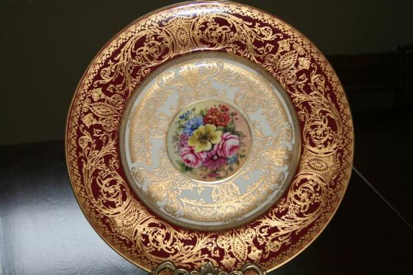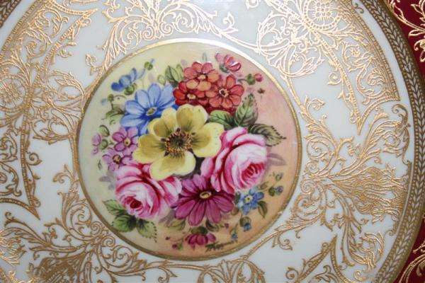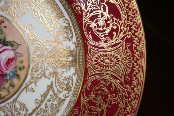 This plate is made by Royal Worcester on fine white porcelain and all hand painted with a stunning floral centerpiece and surrounded by a 2" darkish pink border and adorned with a tremendous amount of very intricately done gold gilting. A true masterpiece for sure. Inherited in 2003. People were probably born late 1800's New York & Texas & Immigrants from Sweden. That is all I know about it. It may be for sale once I get a history and value for the piece.