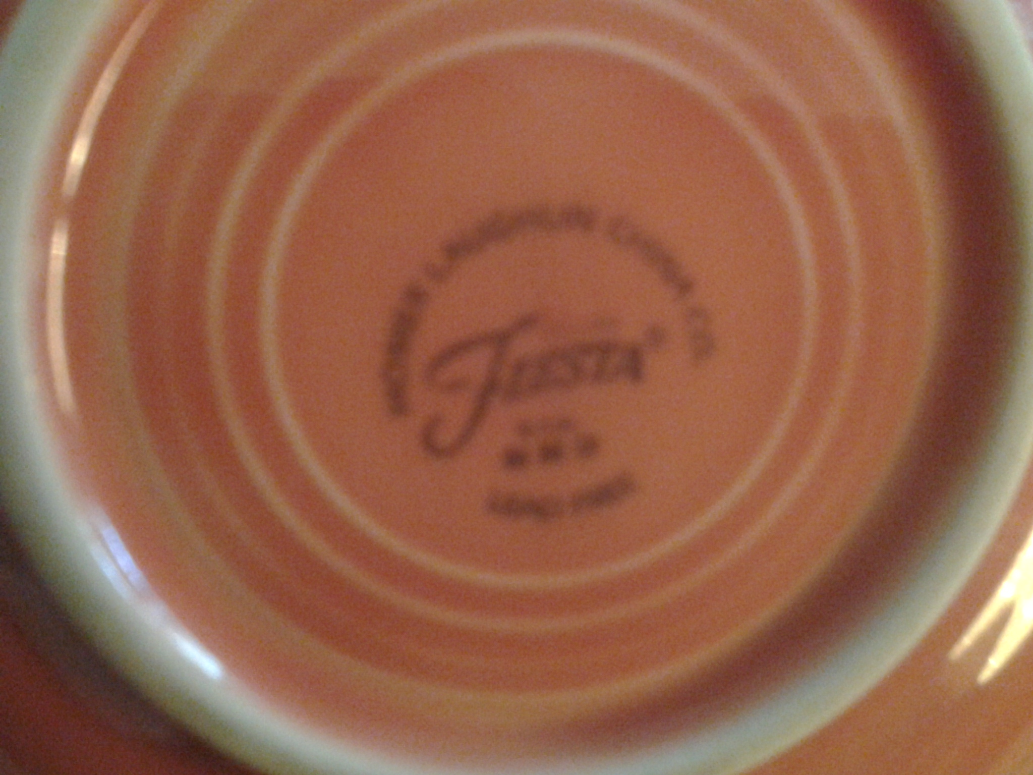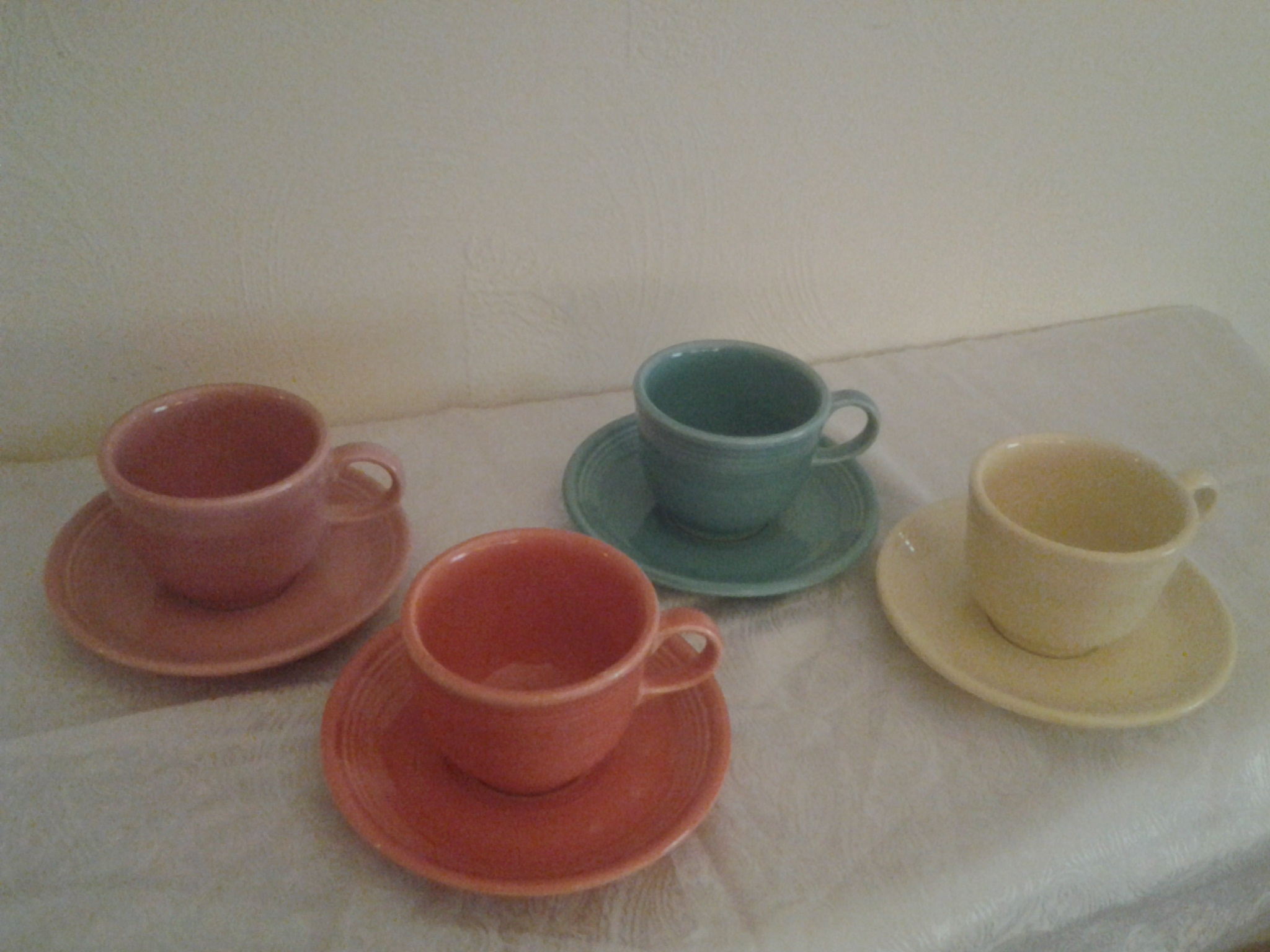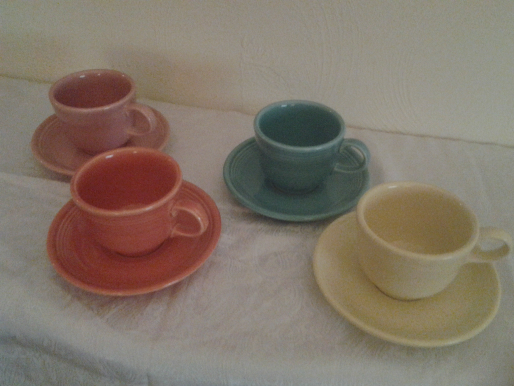 I have a 16 piece Fiestwaer cup and saucer set. Colors are pink, yellow, teal and presimmon orange. The logo on the bottom is done in a capital F. They have identifer letters on the bottom, pink cup NNB, saucer NNC. Teal cup NNC, saucer NNC. Yellow cup MMN, saucer NNB. Orange cup NNC, saucer NND.