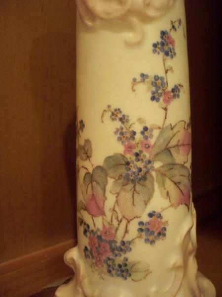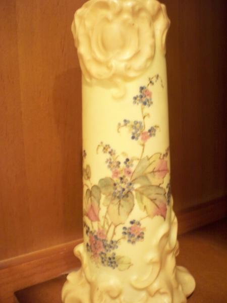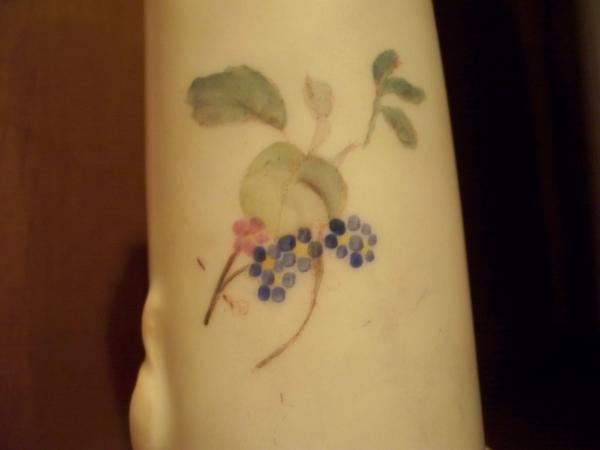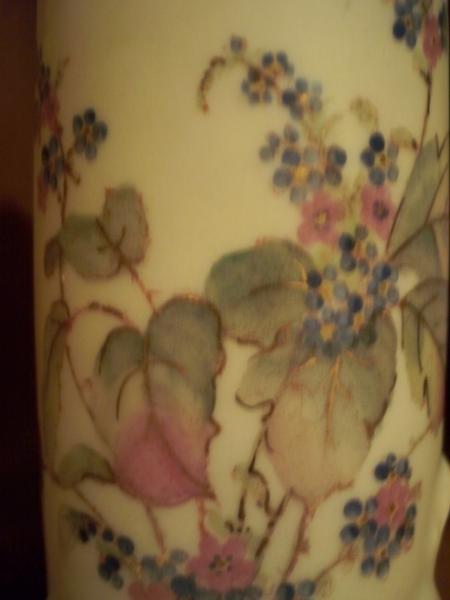 Beautiful cream colored porcelain with painted flowers and leaves,all trimmed in a fine line of gold.It is 6 1/2 inches high.There is a "crown" mark with the letters "RW".It is stamped 6232.