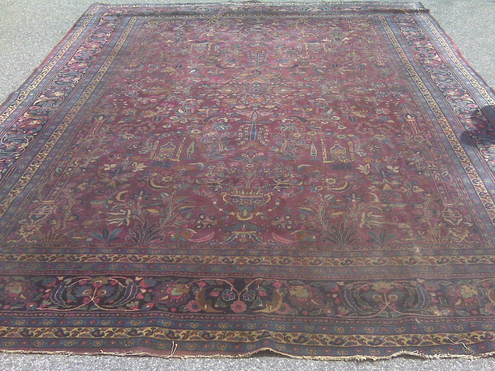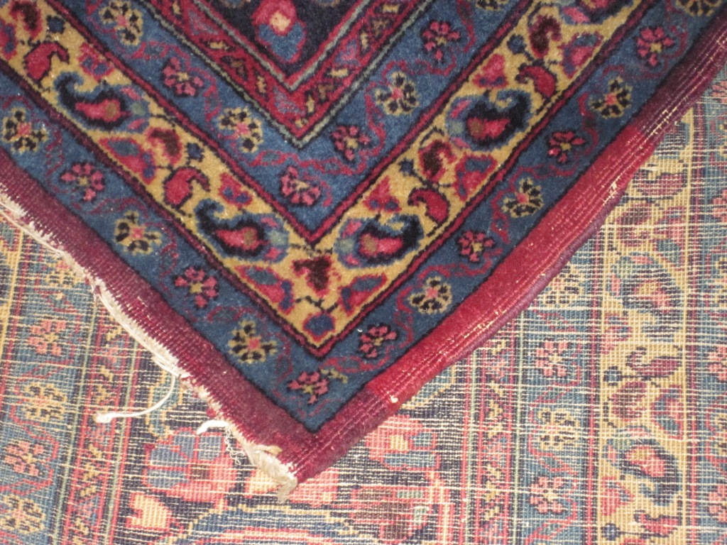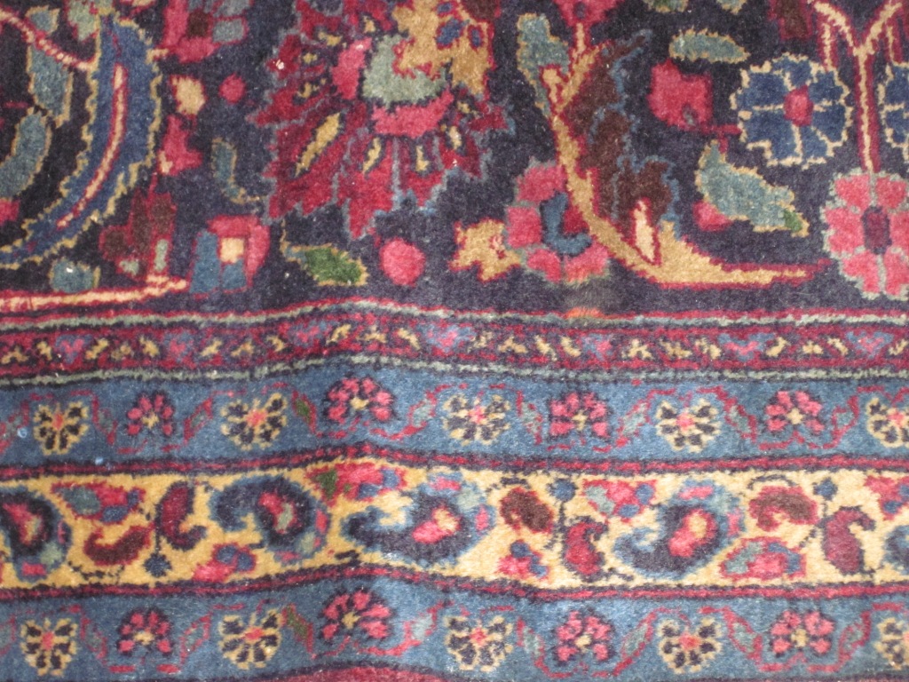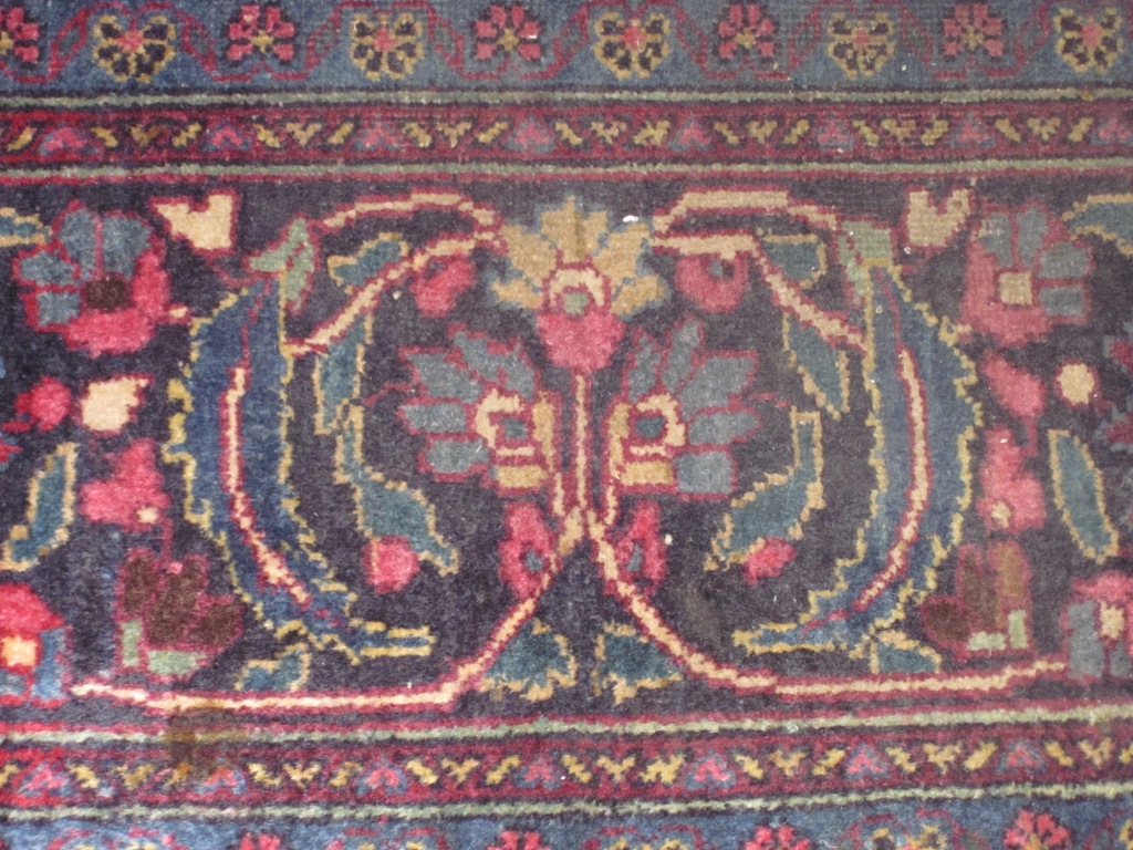 fringe recently removed by professional antique rug cleaner,  good condition - no tears, holes or rips. main color in purple family, also reds blues and yellows - very vibrant, exceptional detail. Last picture included is for size - color is before cleaning. No stains on rugs - only shadows in pictures.