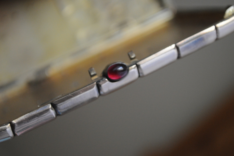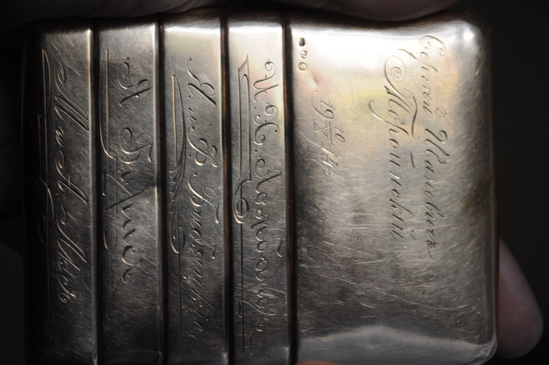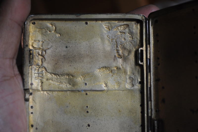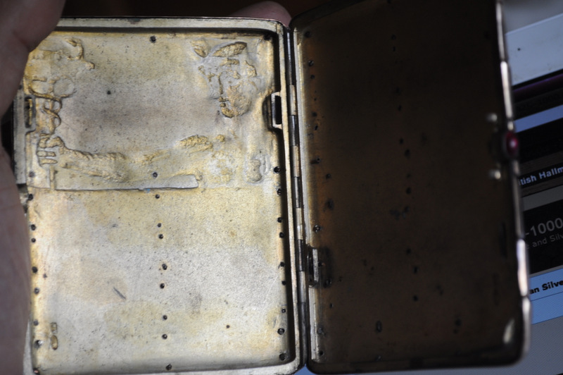 My mother recently gave me a cigarette box which was brought to this country by my great-grandfather. To my untrained eye, it is unusual in that it is a standard silver cigarette box from the period, but covered with a gold(maybe) shell. There is a Red stone latch. The gold is redder than I am used to and has some blackened areas ... not even sure that it is real.
