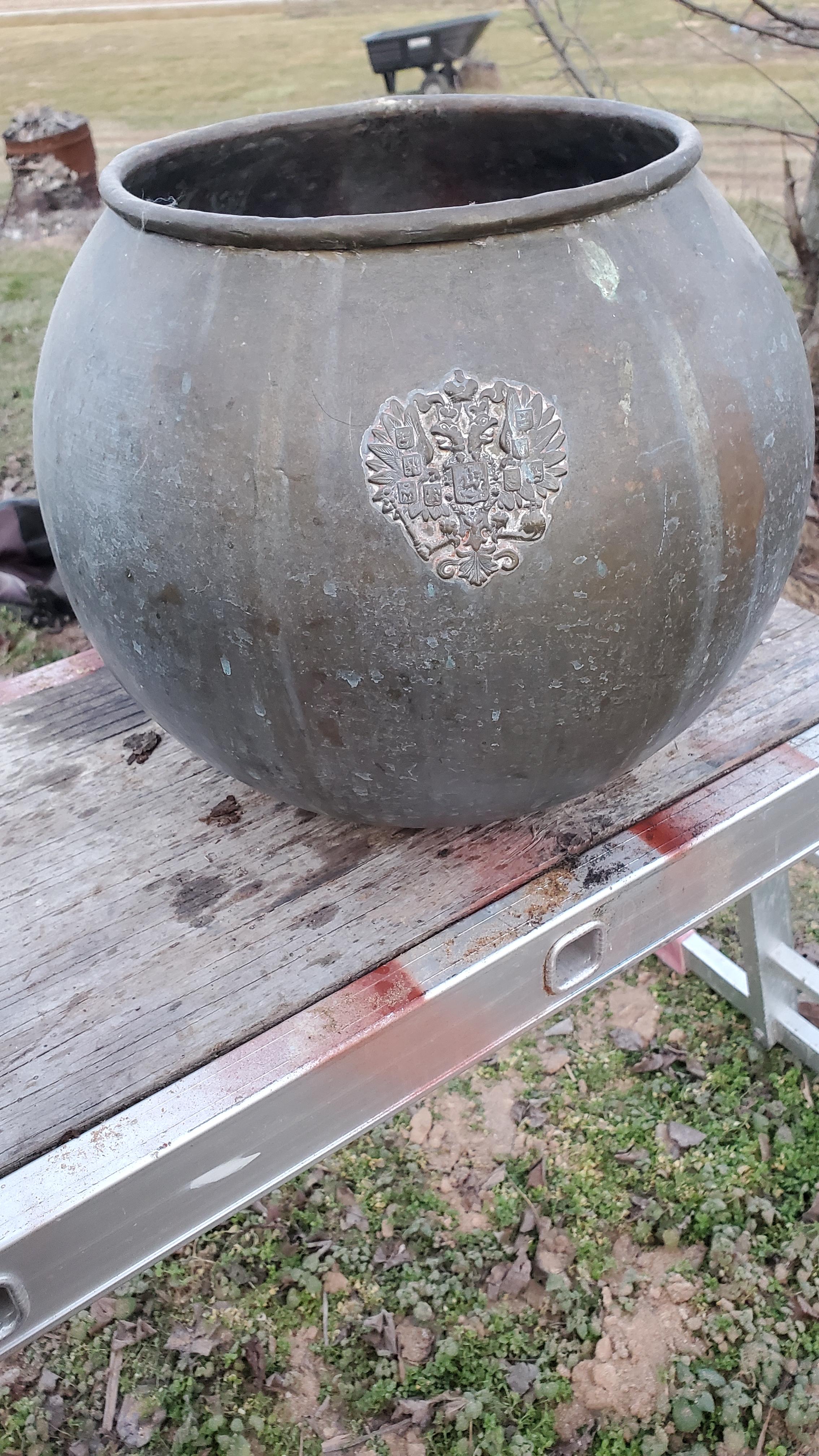 I believe to be a copper or bronze candy kettle. Has a Russian crest. See picture.