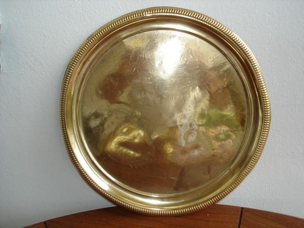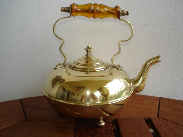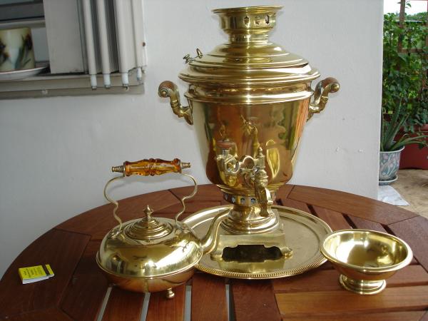 this beautiful set,has been in our family for years.Bright yellow brass,with wooden handles.The teapot has an amber handel.There is a seal on the front of the samovar which I can,t make out.The tray is ribbed and has a design.The bowl is also in perfect condition.Years ago I had it evaluated by a Christies Representative and the appraisel was at 7000USDLLS [aprox]I would like to know wether in the last 20 years this price would have gone up
