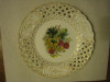 8 1/2 inch ceramic side/dinner plate with green leaves, red and purple flowers around the brim. On the back in a square pattern it has a leaf like branch on top of two wavy lines and 3nK etched into the back underneath that it has the no. 38. Have similar plate with the no. 42. Unfortunately Im unable to upload photos at the moment.