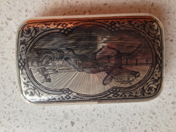 Russian silver box dated 1877 above date are initials B.C. to the right of this stamp, #84 to the right of this stamp a horse with a figure sitting on it. also it looks like intials A.N. or A.H. also stamped to the left of all the above stamps? 4inch L x 2 1/2 w