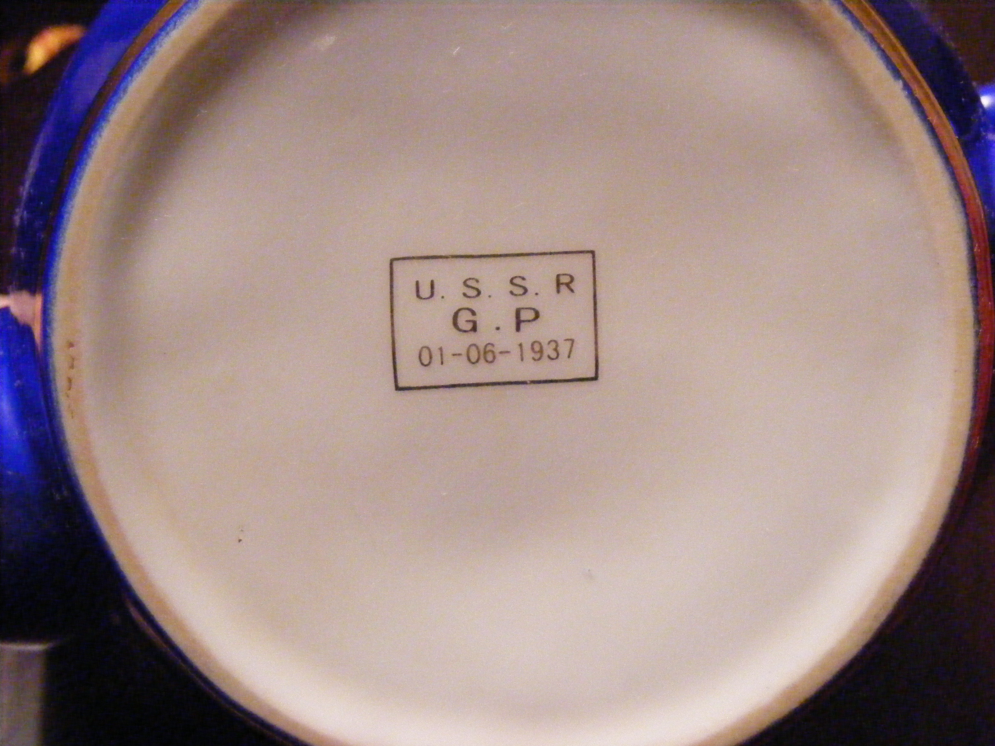 This is a blue porcelain teapot that originally came from Uzbekistan, former USSR. The bottom reads: "U.S.S.R. G.P 01-06-1937".