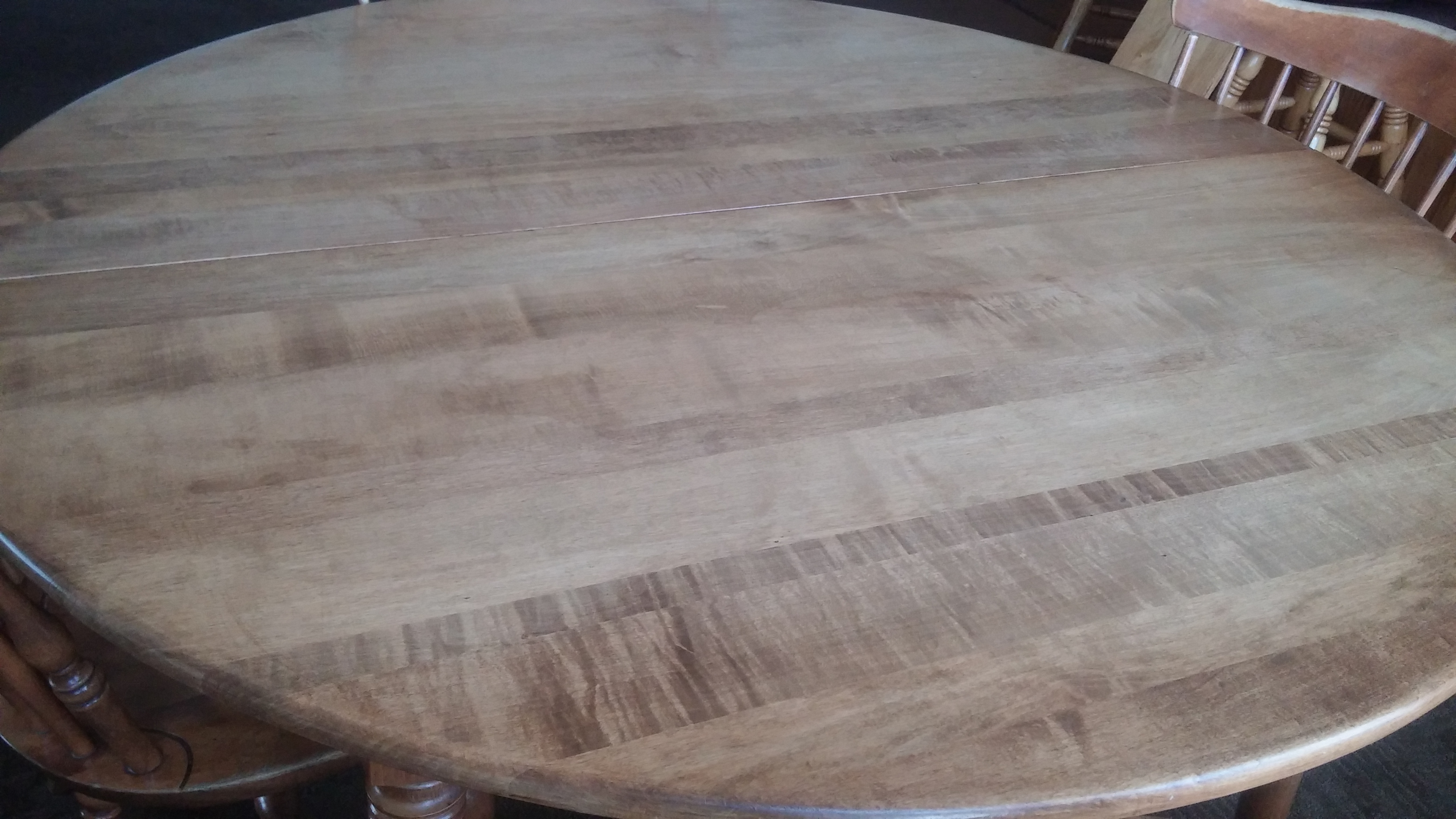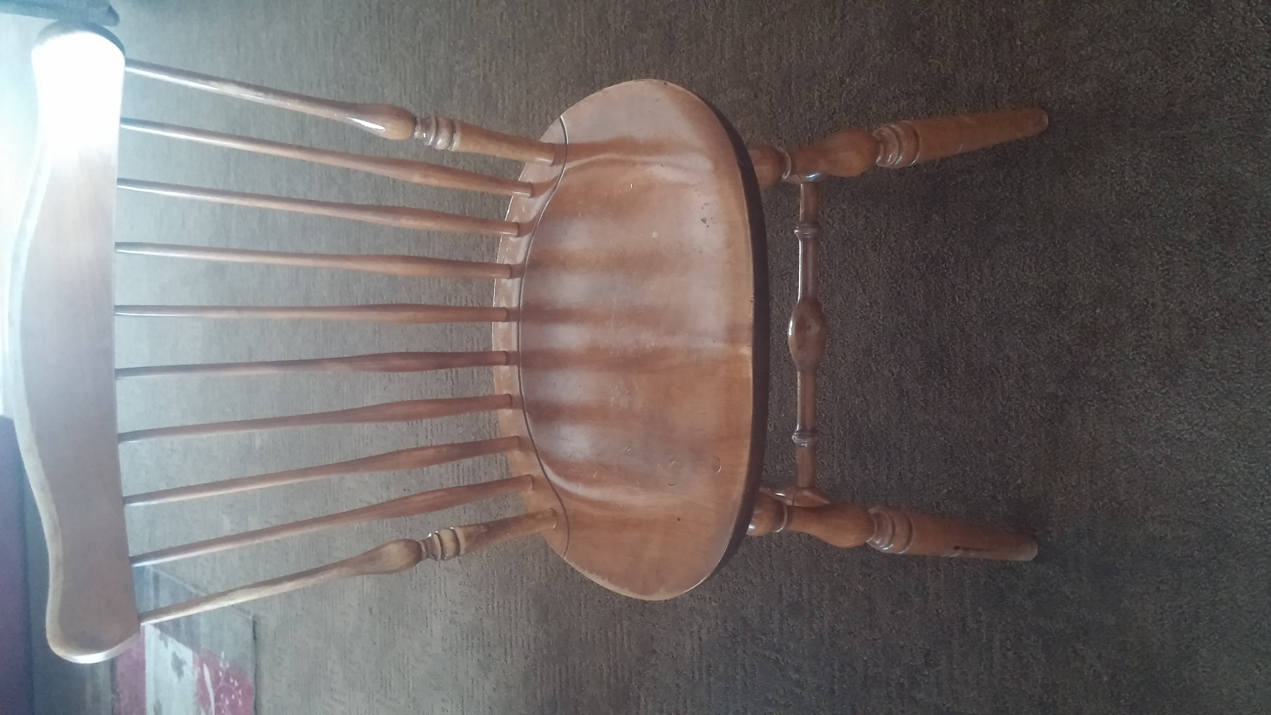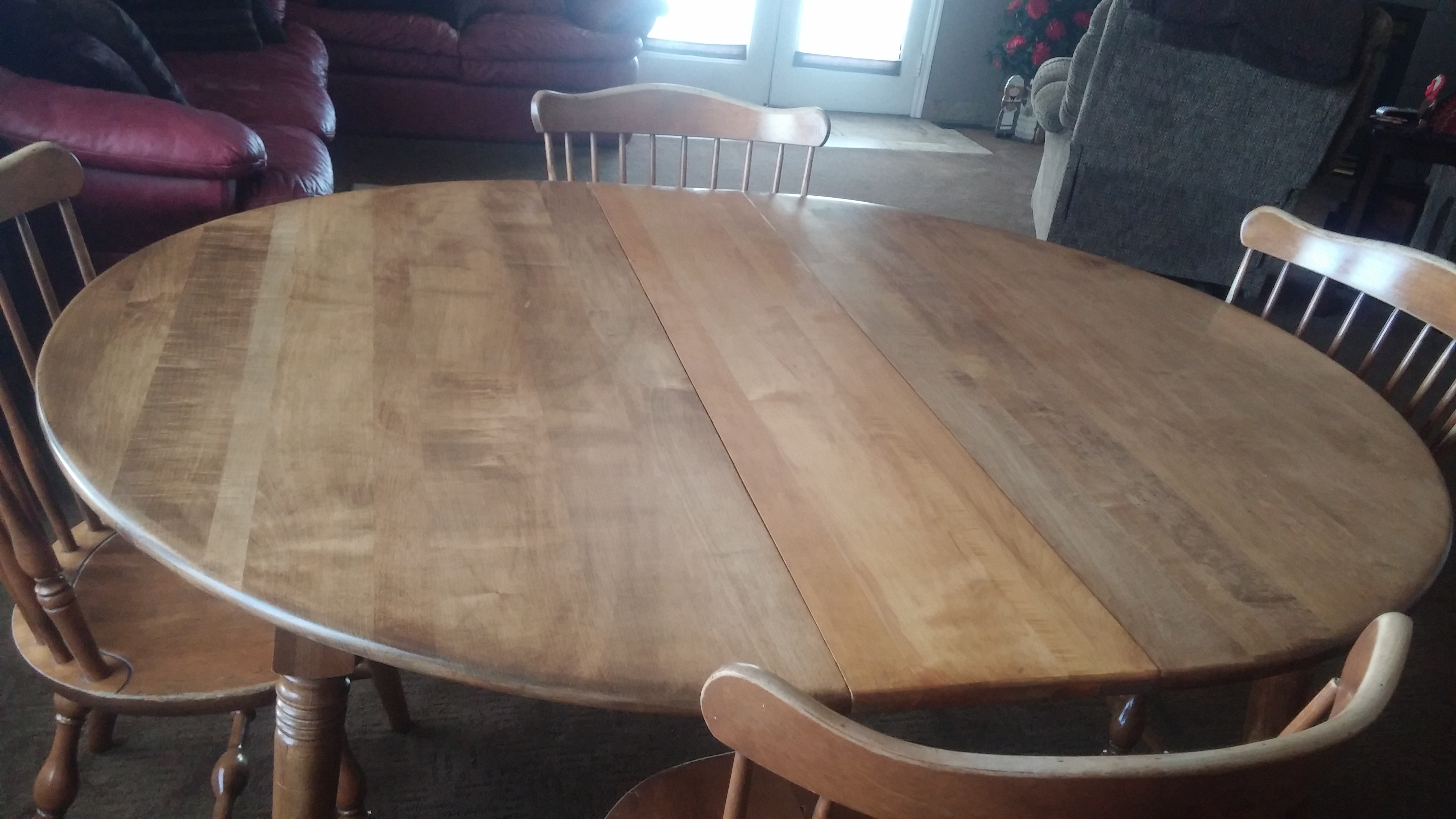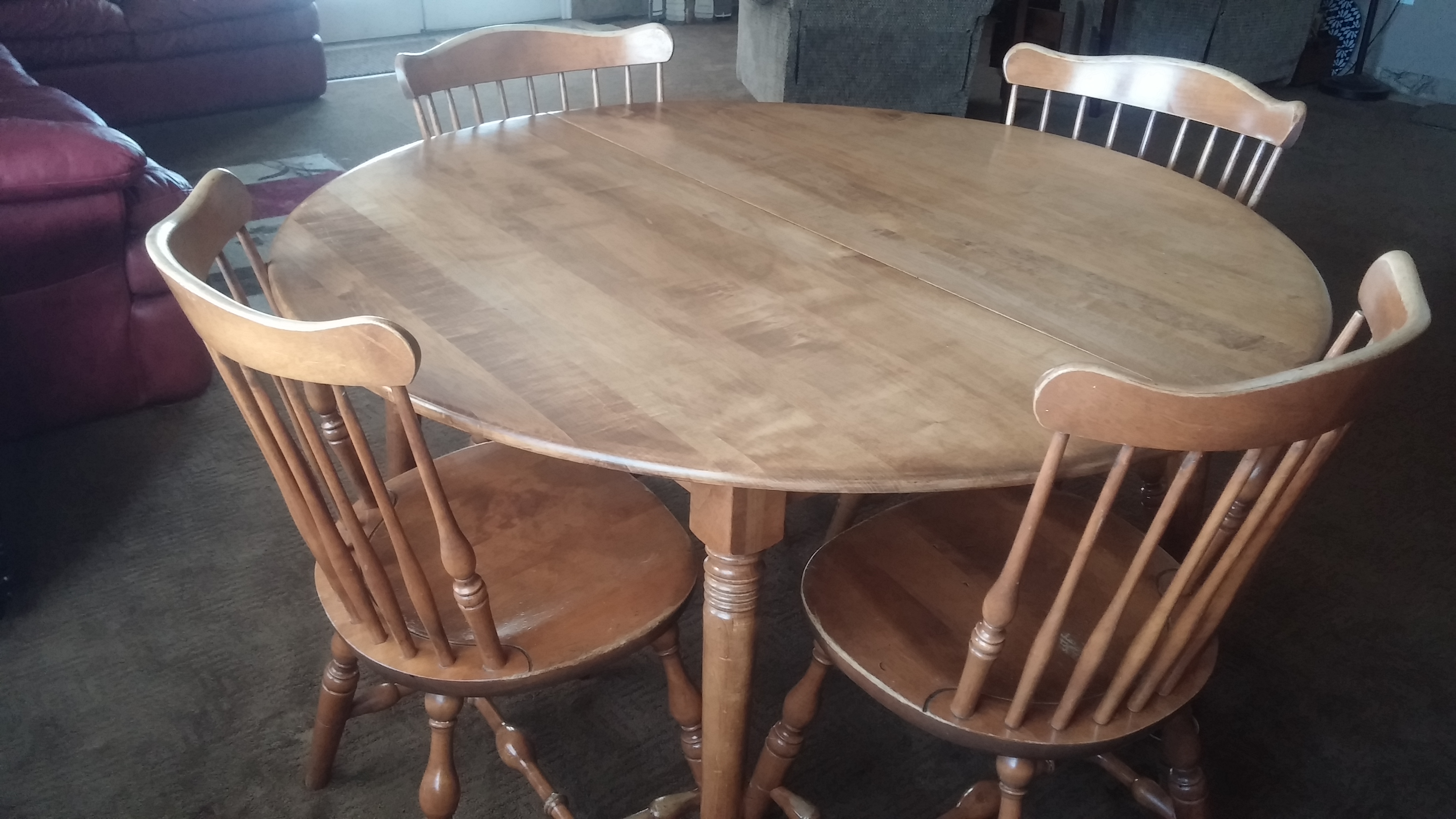 Solid maple S. Bent & Bros. vintage 1960's dining set with leaf and four Windsor chairs.  Table measures 49" round.  Leaf is 10" wide.  Normal 46 year wear. Tabletop is refinished - looks good.  Chairs in fair shape - still solid - finishing wearing off with scuffs and scratches.  Children's scribbles underneath tabletop.  Still has many years of use left.