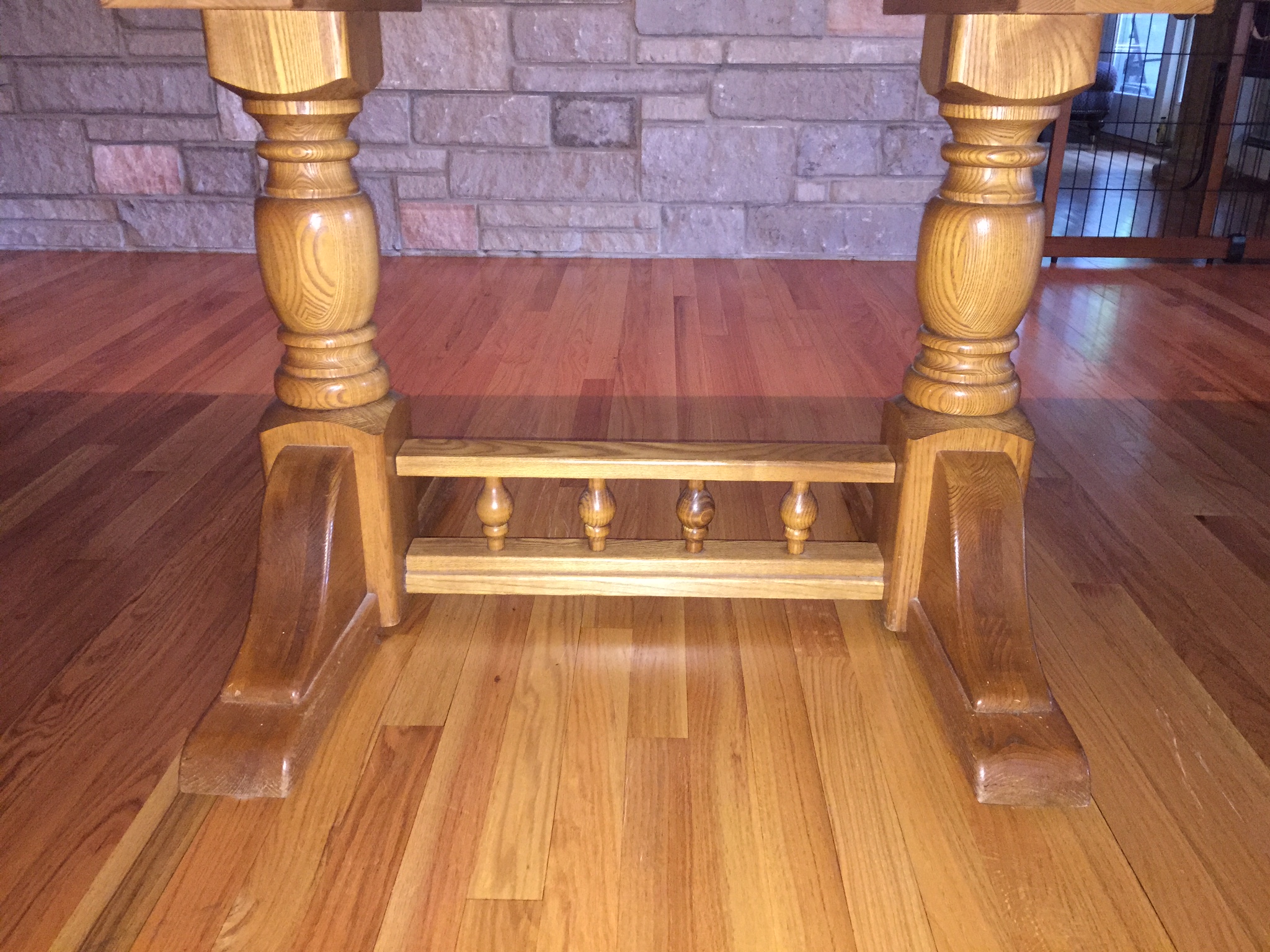Surface of table needs to be restored. Surface of 2 leaves is excellent. Each leaf is 12 inches. Table without leaves is 40x60.