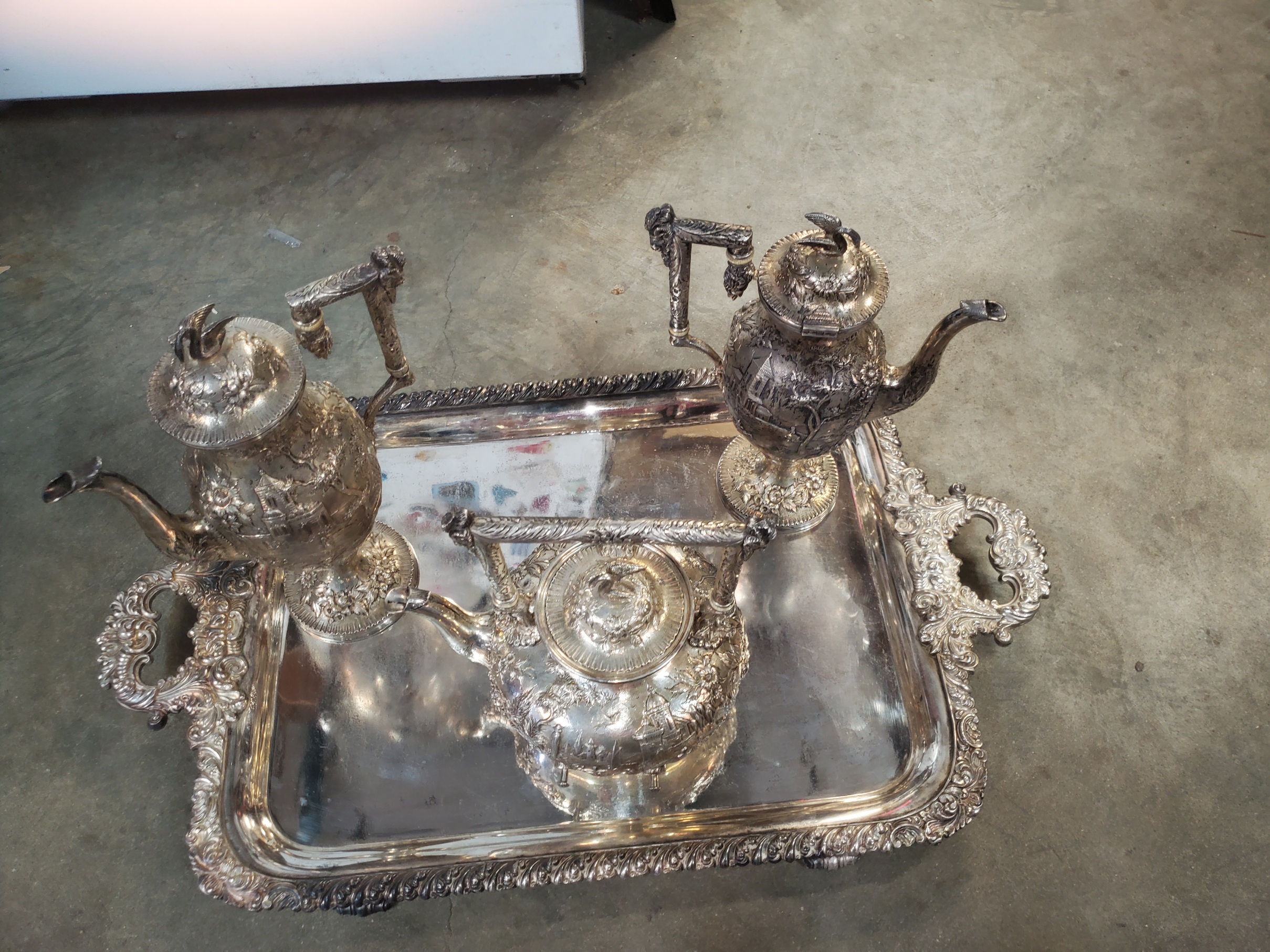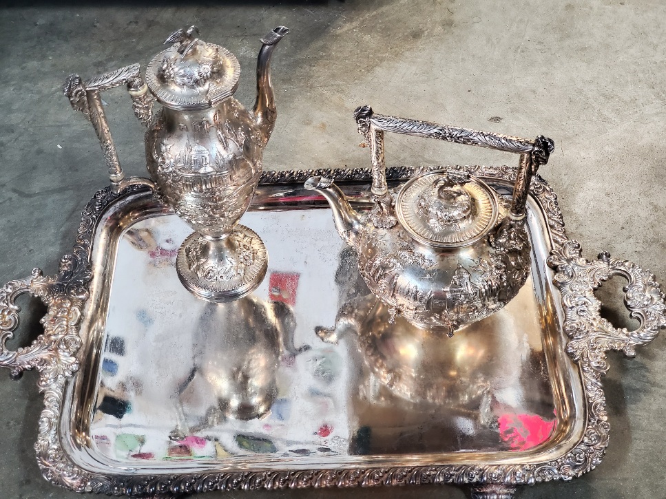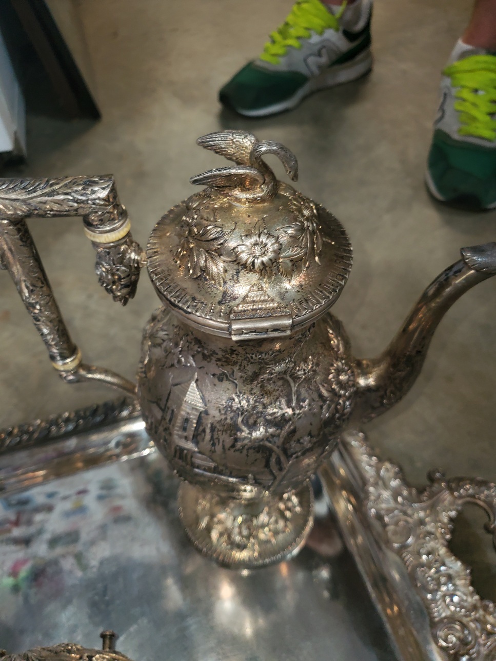 Ok S. Kirk and Sons around 1896 - 1914? Estrucan/castle/landscape pattern? With a swan finial? Teapot the does not have whatever it supposed to sit on, coffee pot and pitcher?