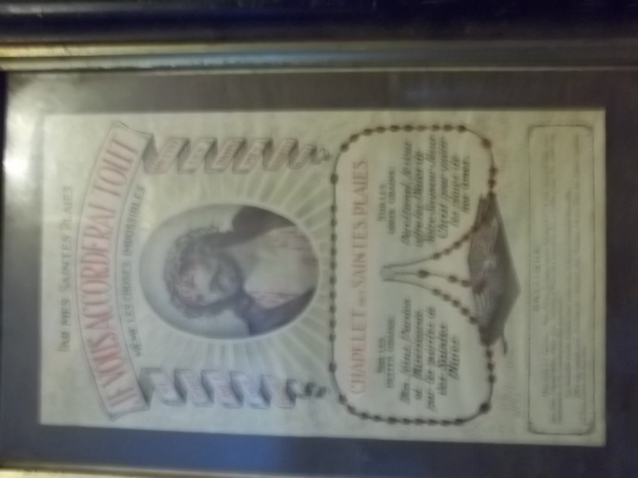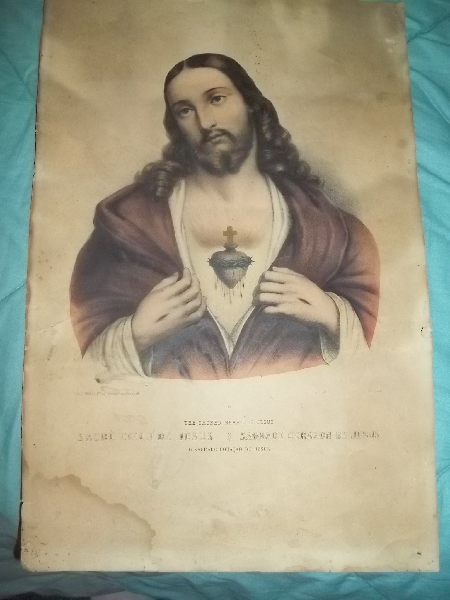 a lithograph by paris l turgis, the sacred heart of jesus. jesus with robe open showing the sacred heart, head tilted to his right shoulder, scare showing on the to of his hand, brown and white robe, fench writing "sacre coeur de jesus also sacrado corazon de jesus.