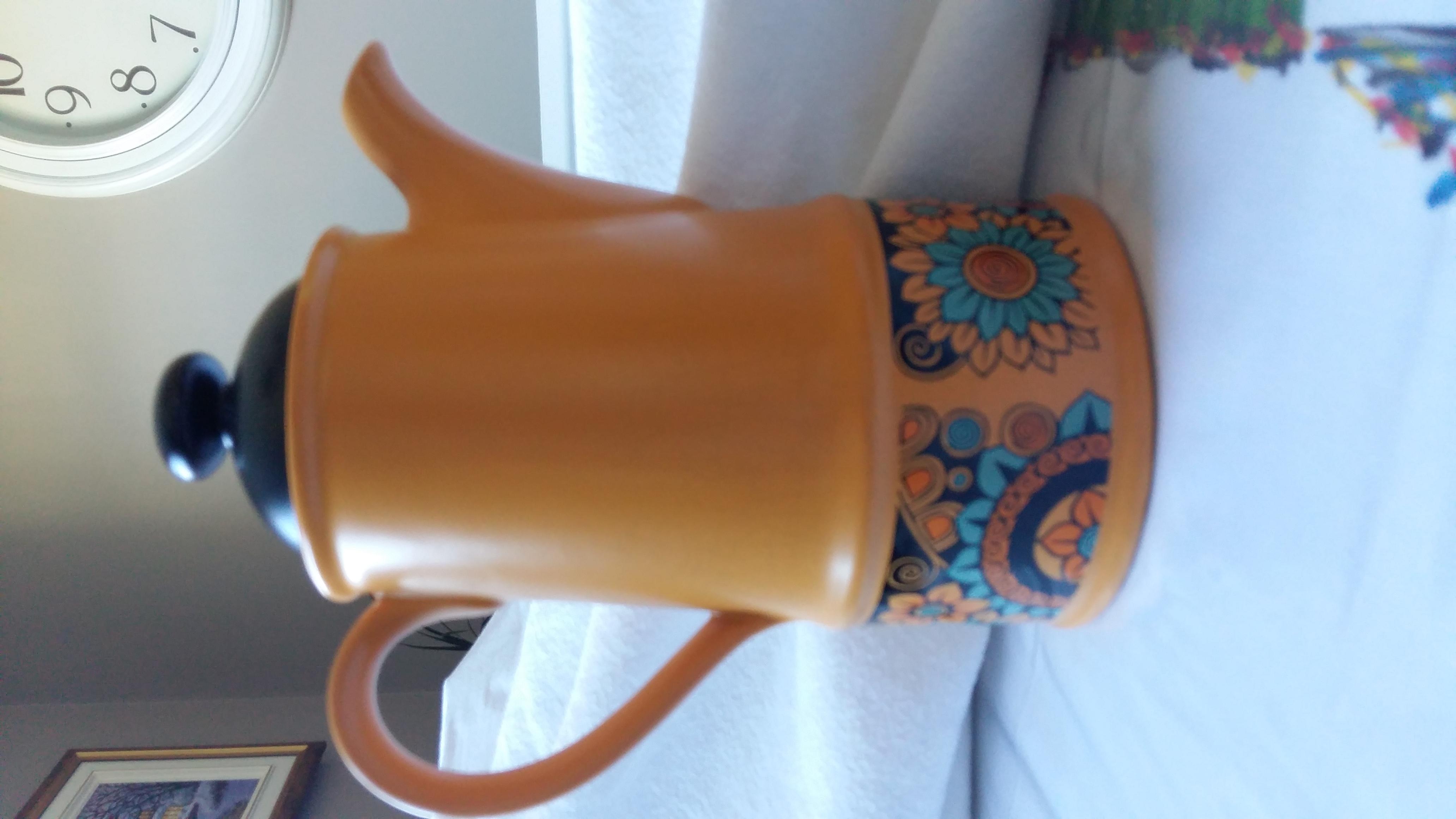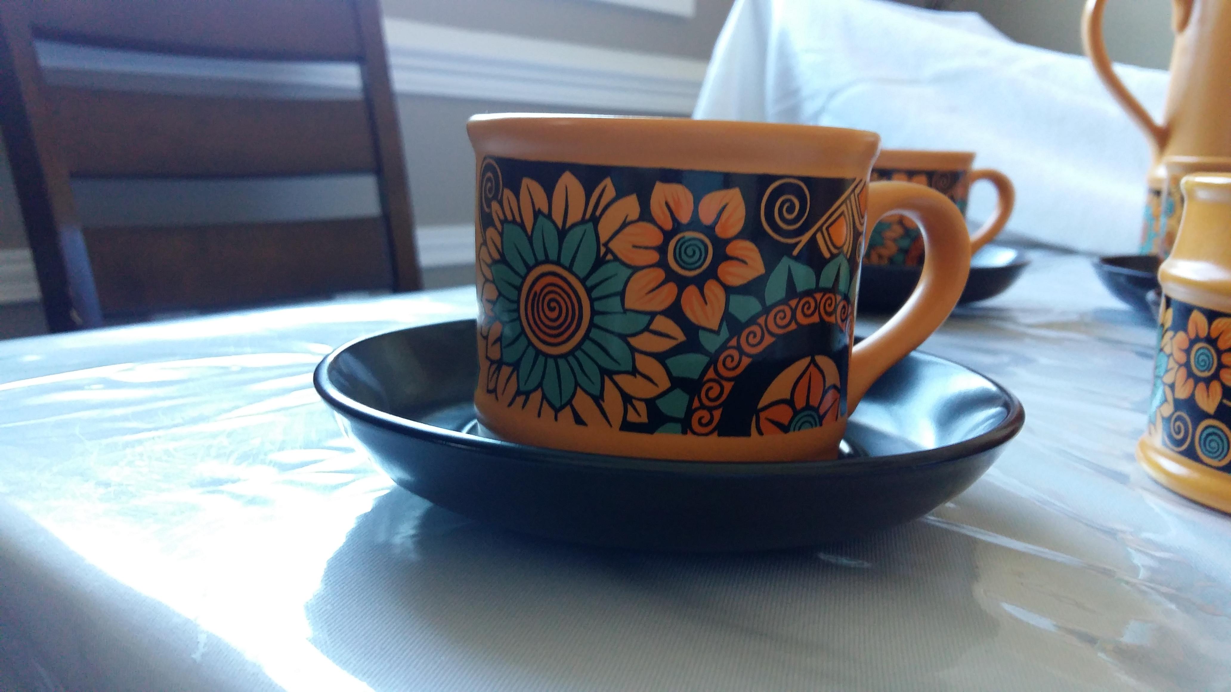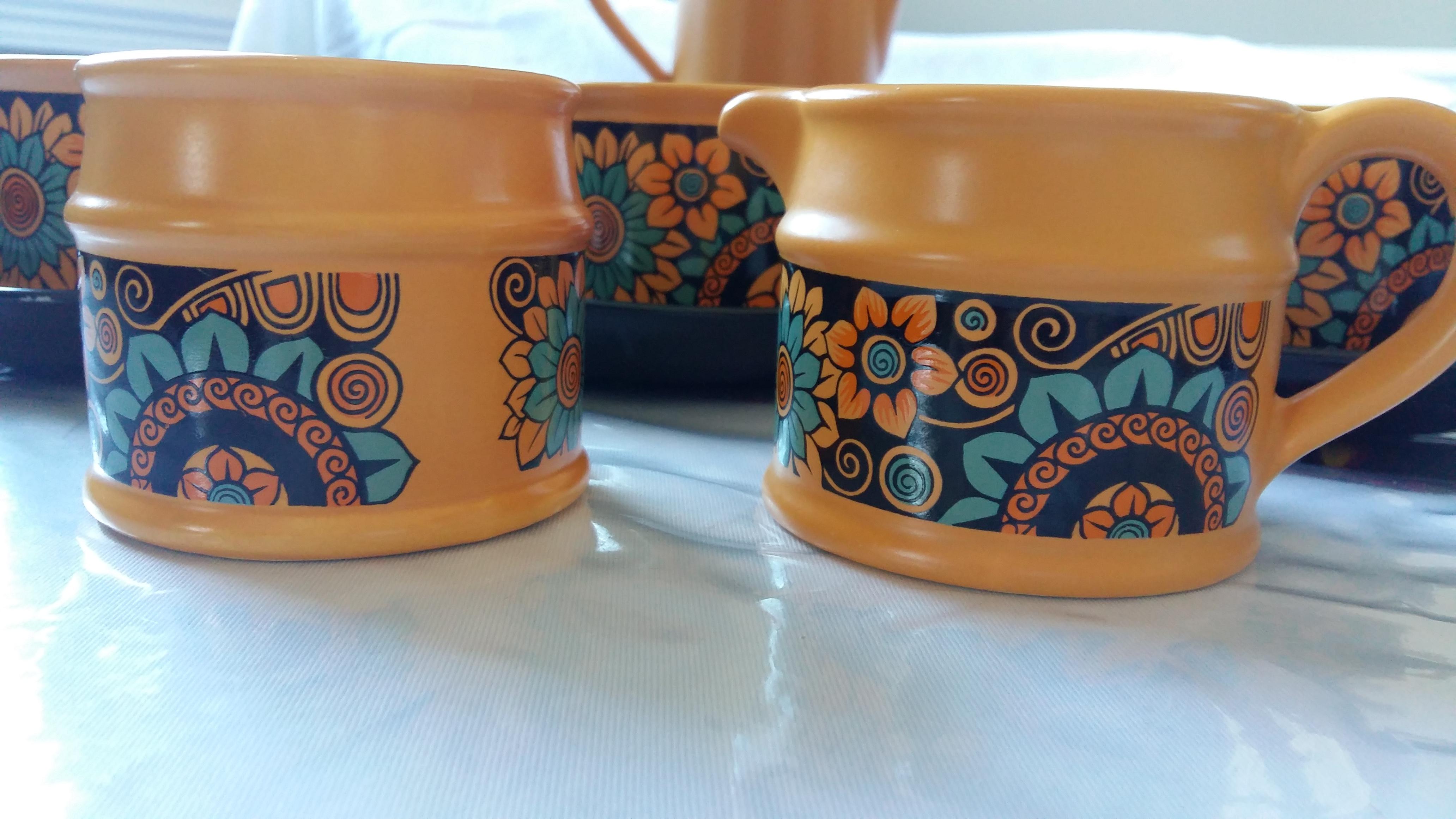 Sadler England complete tea set for 6. 6 cups, 6 plates, creamer and open sugar, tea pot. All in like new condition. Yellow, blue and black with flowers.