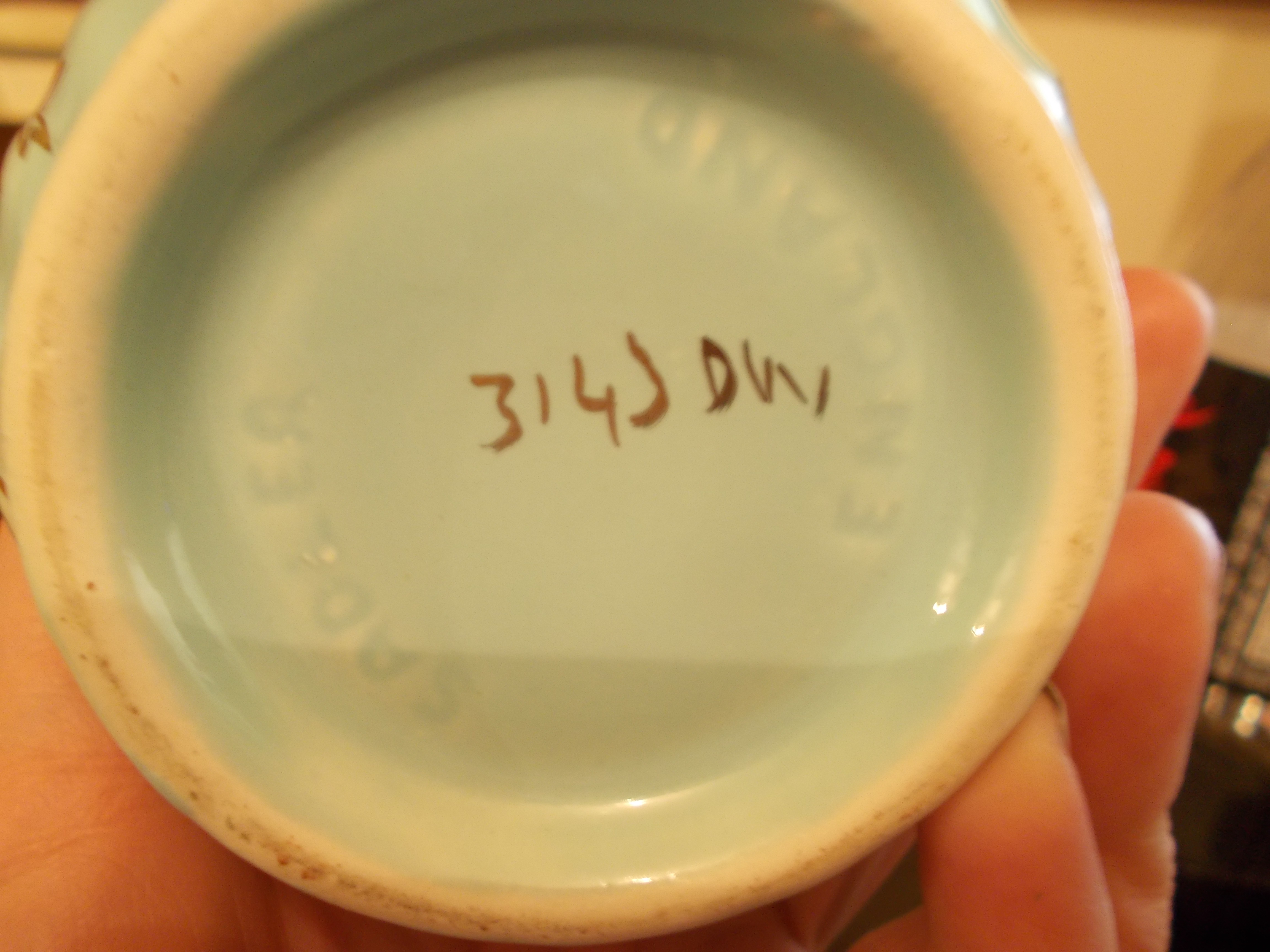 Sadler England sugar bowl marked what appears to be "3145 DW", I havent been able to find any informaiton on the 3145 pattern number but the writing isnt that clear either. The bottom is embossed with Sadler England, unsure of the year as well. All trim and decoration is gold. I have seen a few other bowls or sets that are very simular but nothing exactly the same, maybe its rare. The color can also be interpreted in a few ways, have seen same colored bowls named blue, greem. aquamarine, teal, turquoise, mint green, baby blue,,, its a light blueish green color. Its in almost perfect condition, the gold has some minor fading on the top and bottom trim and on the lip there is a section approx 1/4 in long where the gold been rubbed more to where the finish is slightly less shiny, was unable to capture the subtle imperfection on camera.
