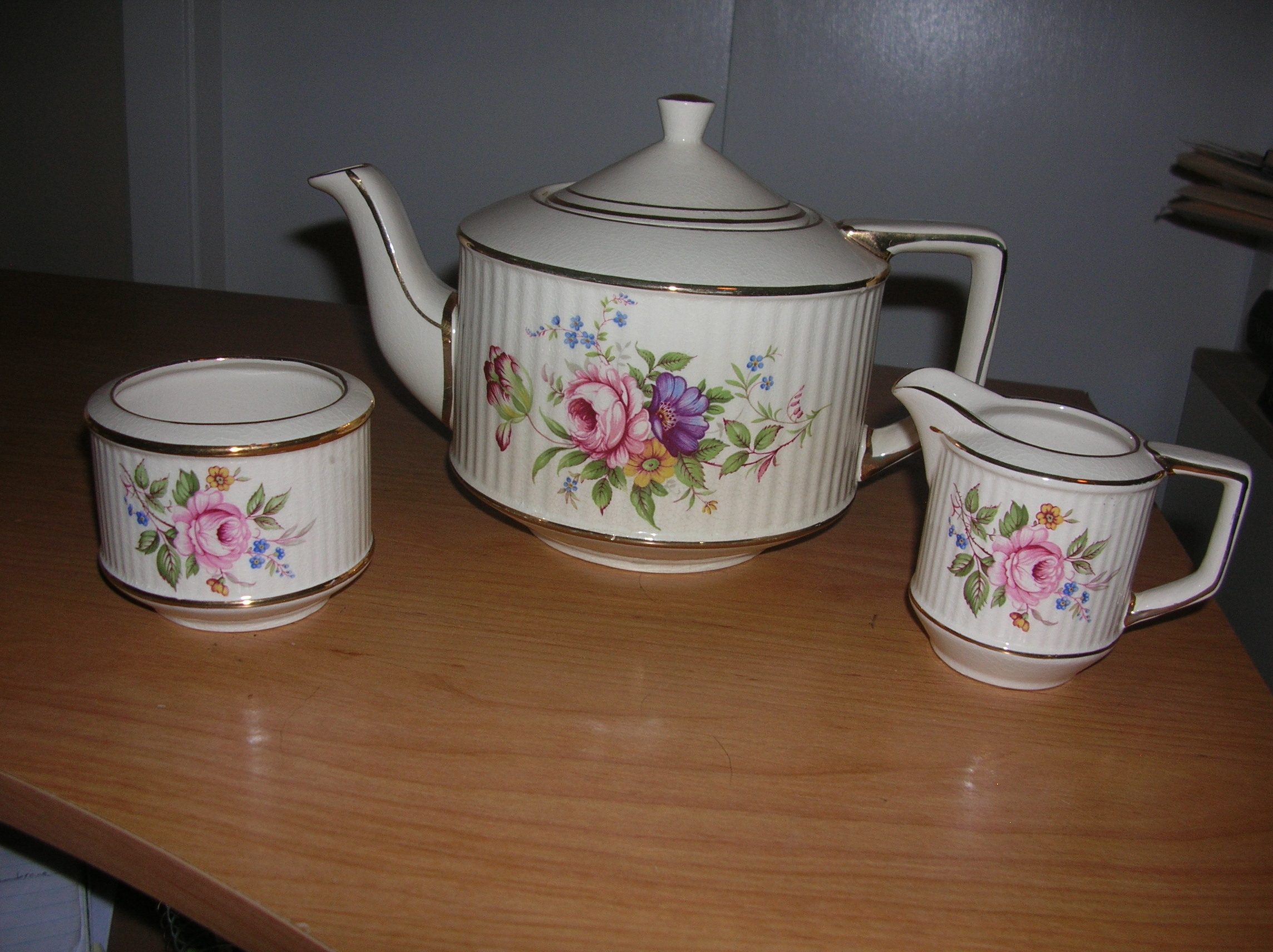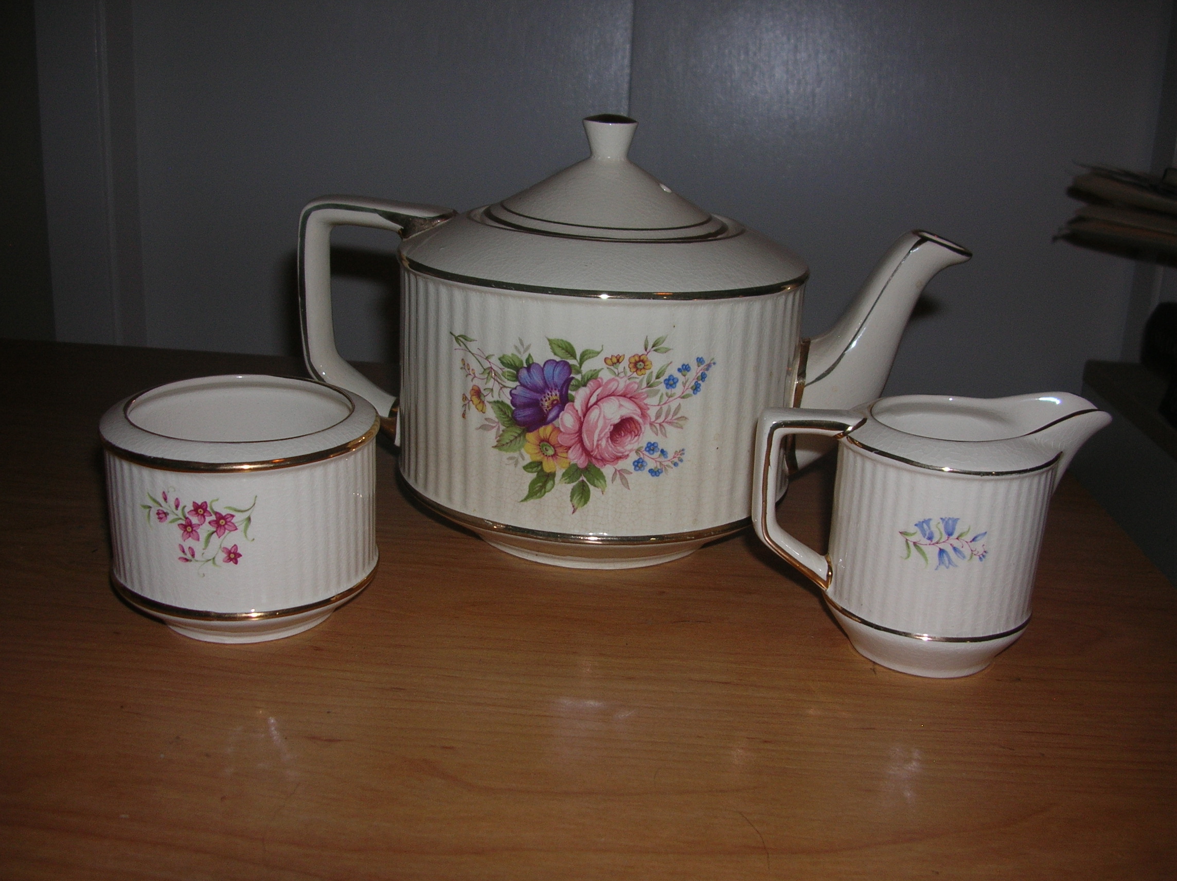 Sadler marked teapot made in Staffordshire England, marking 3158 on the teapot and cream, marking 3058 on the sugar bowl