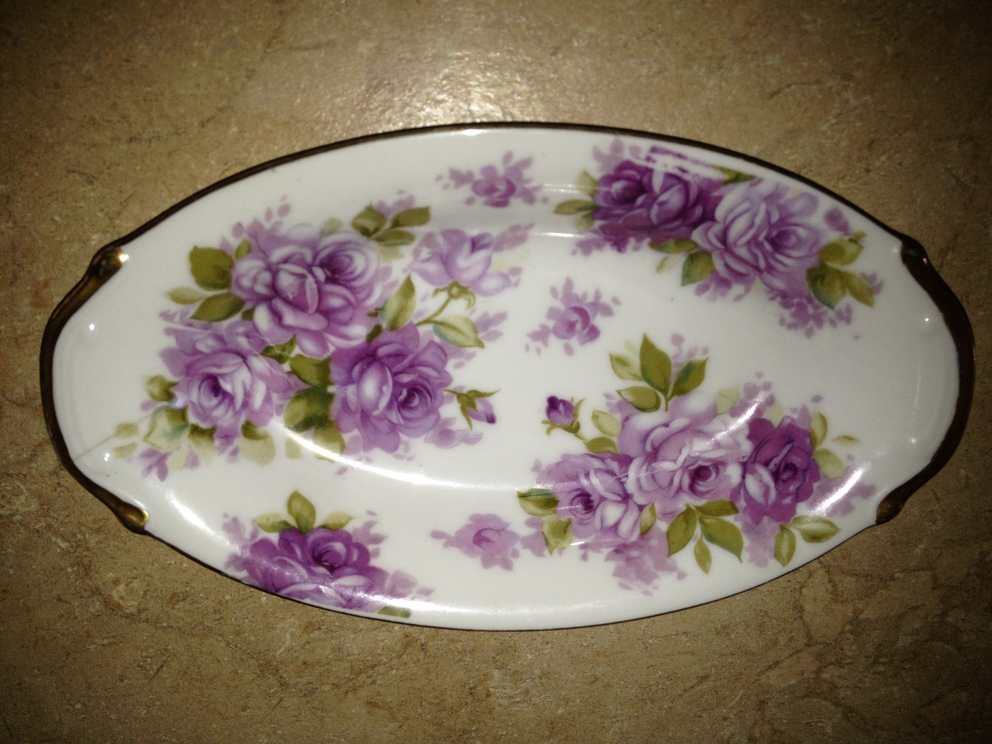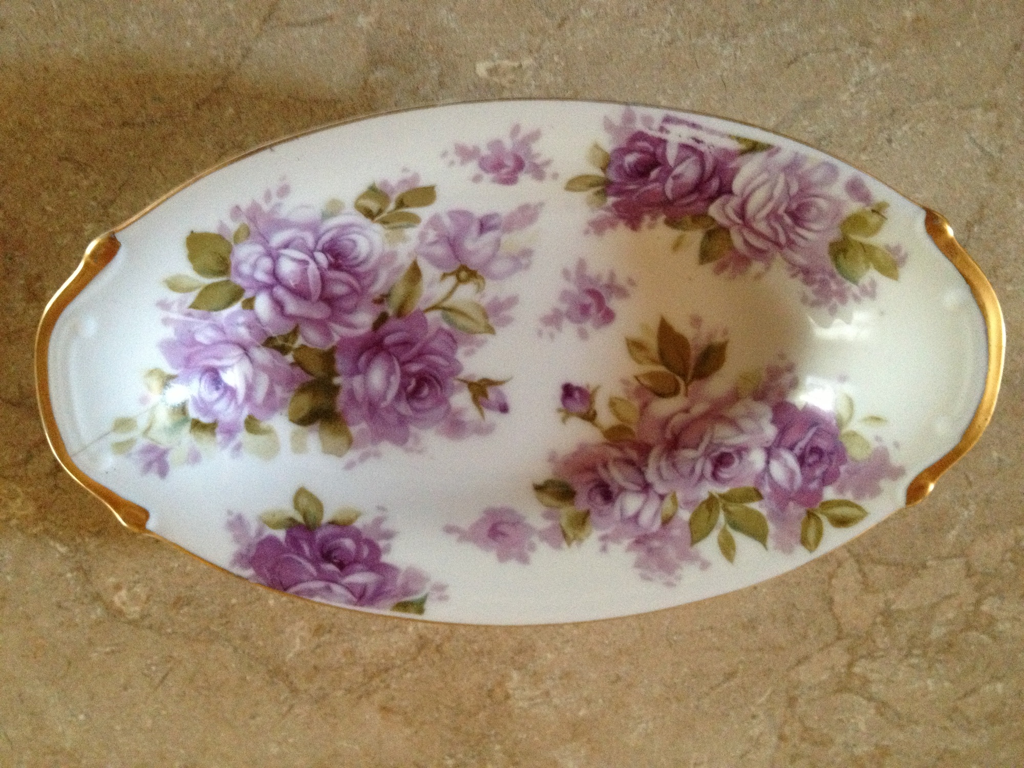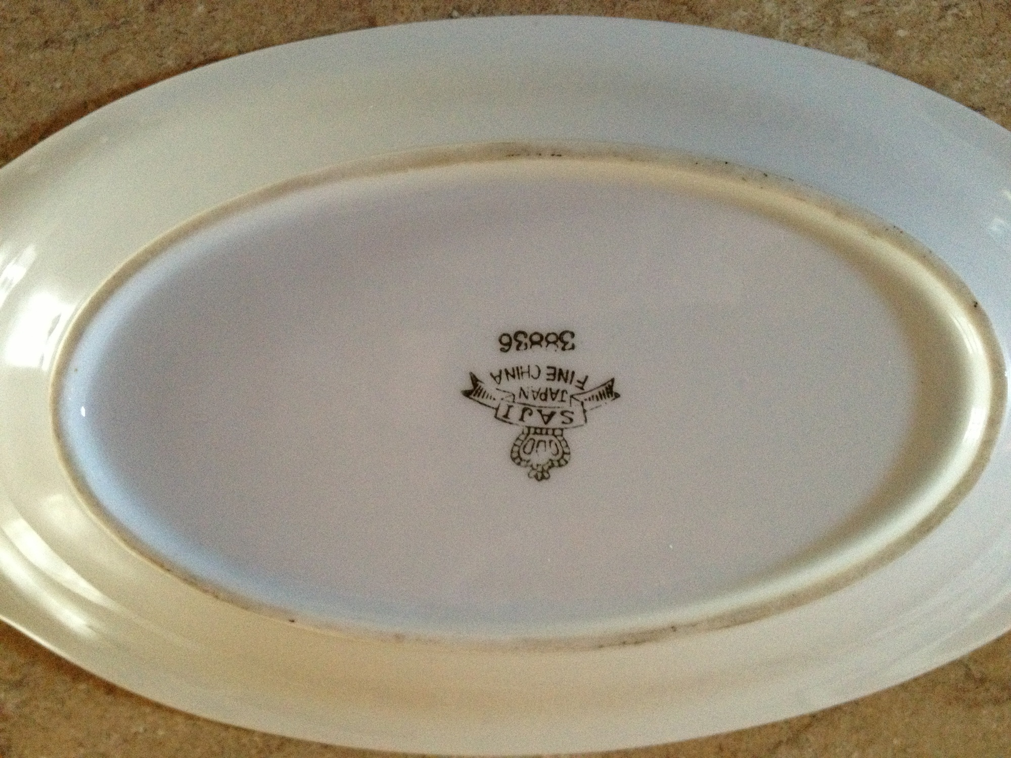 I have an item marked SAJI Japan on it. It looks like a candy dish. It has purple fowers and gold leaf on the rim.
