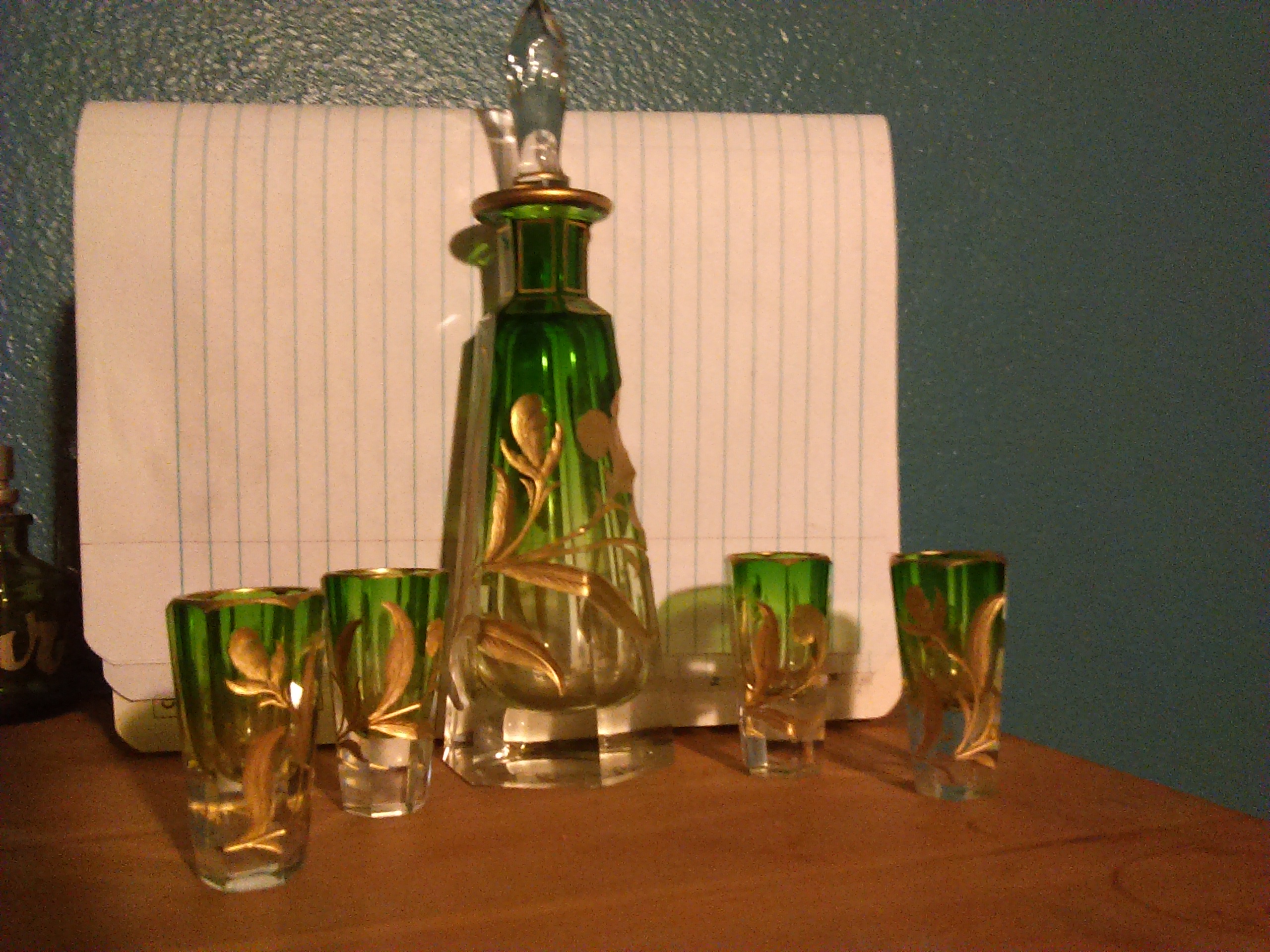 Sake decanter with 4 sake glasses. Glass fades from green on top to clear on bottom on each piece. Flower design hand painted gold. When held up to a light the flowers show great detail in the paint.