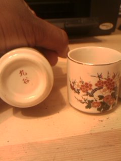 I have three saki or tea cups with paintings of flowers in different colors. All are outlned in gold and the rims of each are in gold as well. There are markings on the bottom, my grandmother got them in Japan or China.