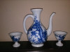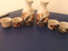 Green transparent bottle with Gold on top of Stopper. Gold design w/ white flower on front. Glasses are same design.