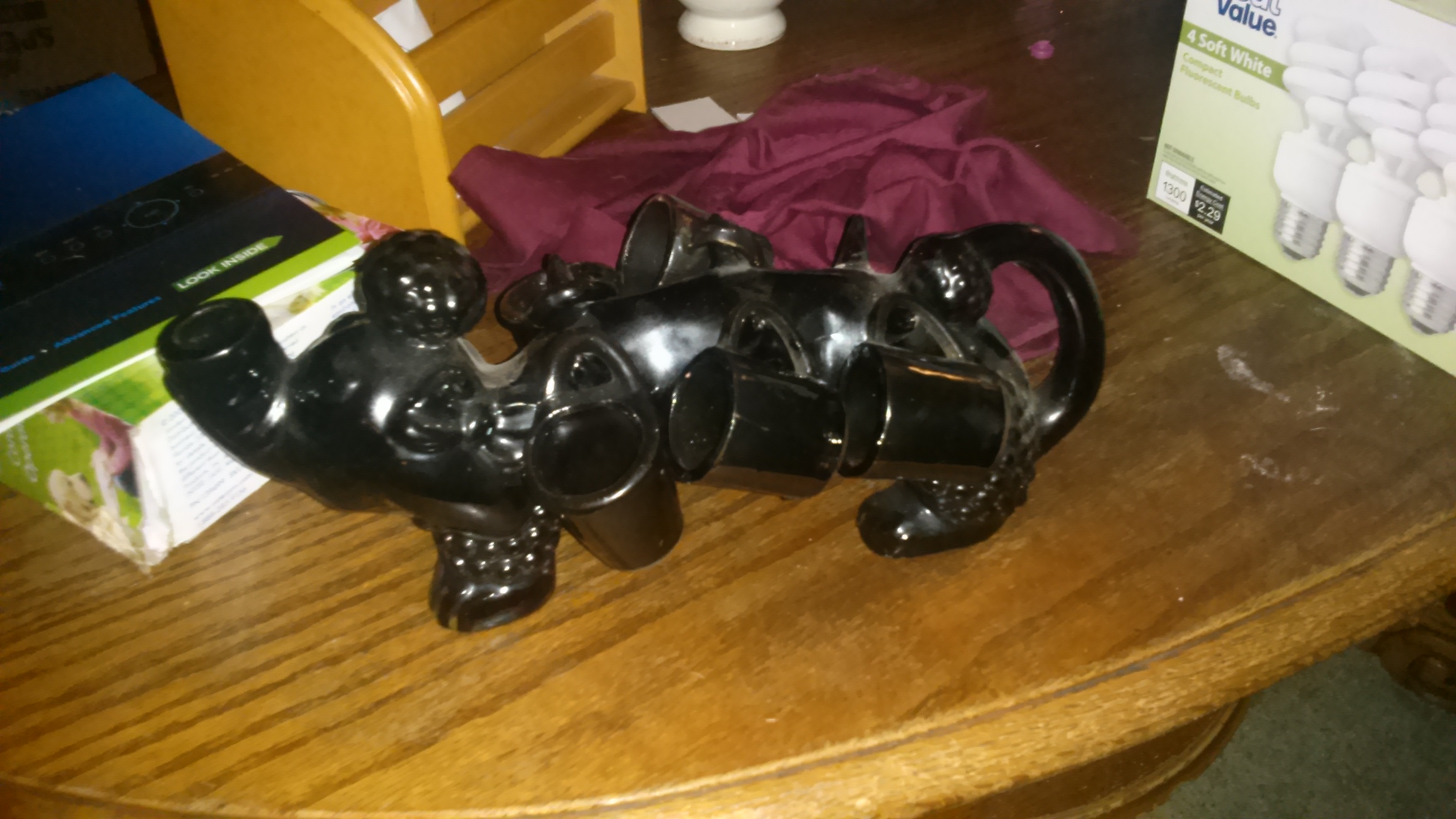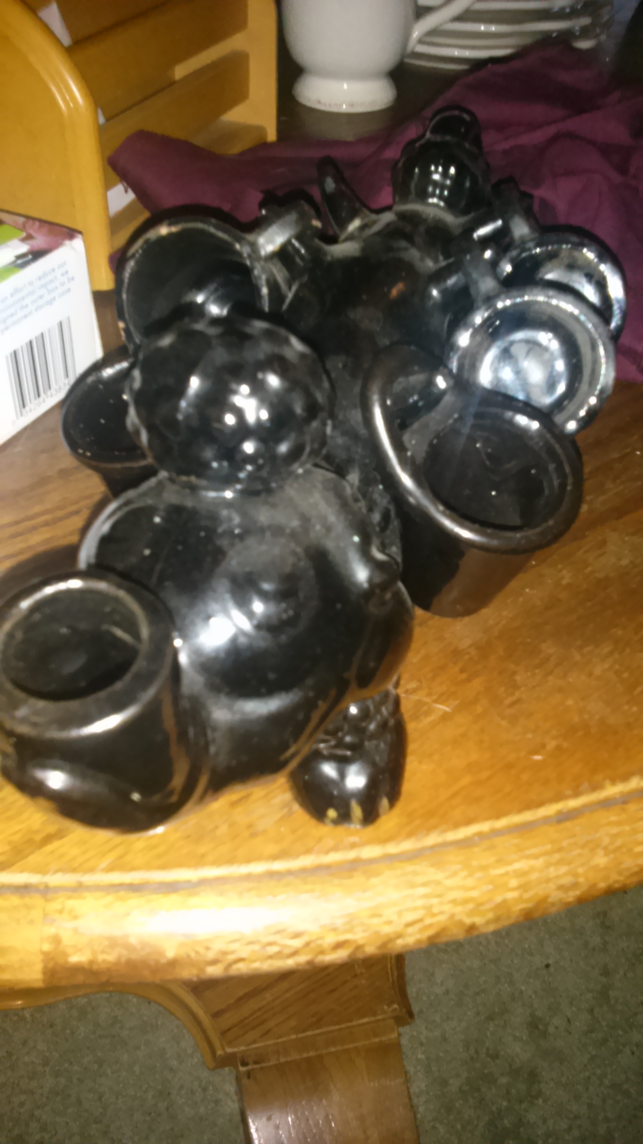 I have a saki set im not totally sure how to describe it looks half elephant half poodle it has cups that hang off spikes on its back all stamped japan i have attatched pictures for a better description trying to figure out if its worth anything missing one cup