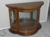 The cabinet has a very heavy base which opens as a separate storage cabinet. It has three adjustable cut glass shelves in a shamrock shape. The shape of the piece is unusual, with beautiful custom curveed glass and an Asian motif in the relief molding. There is a light in the ceiling of the curio.