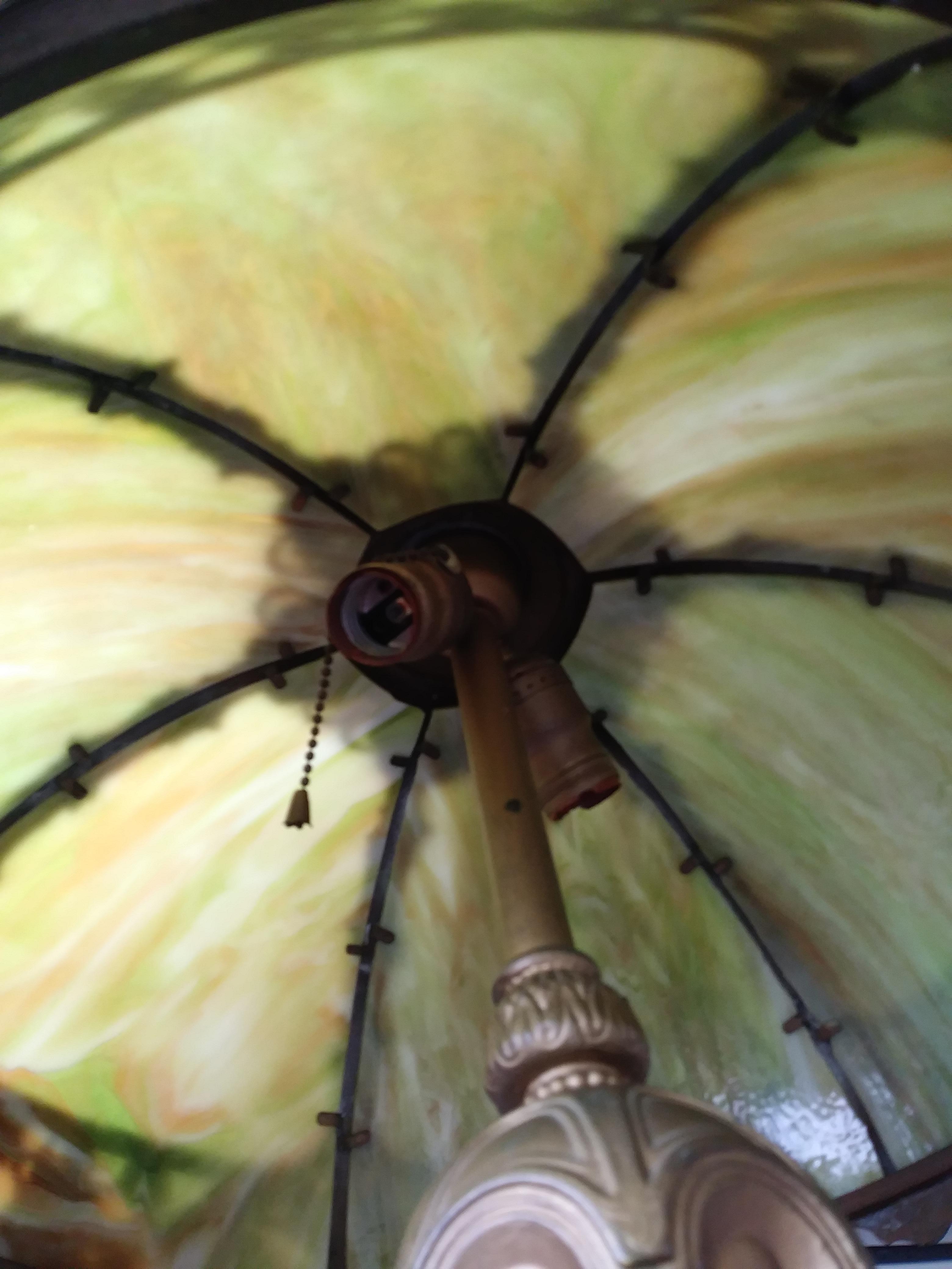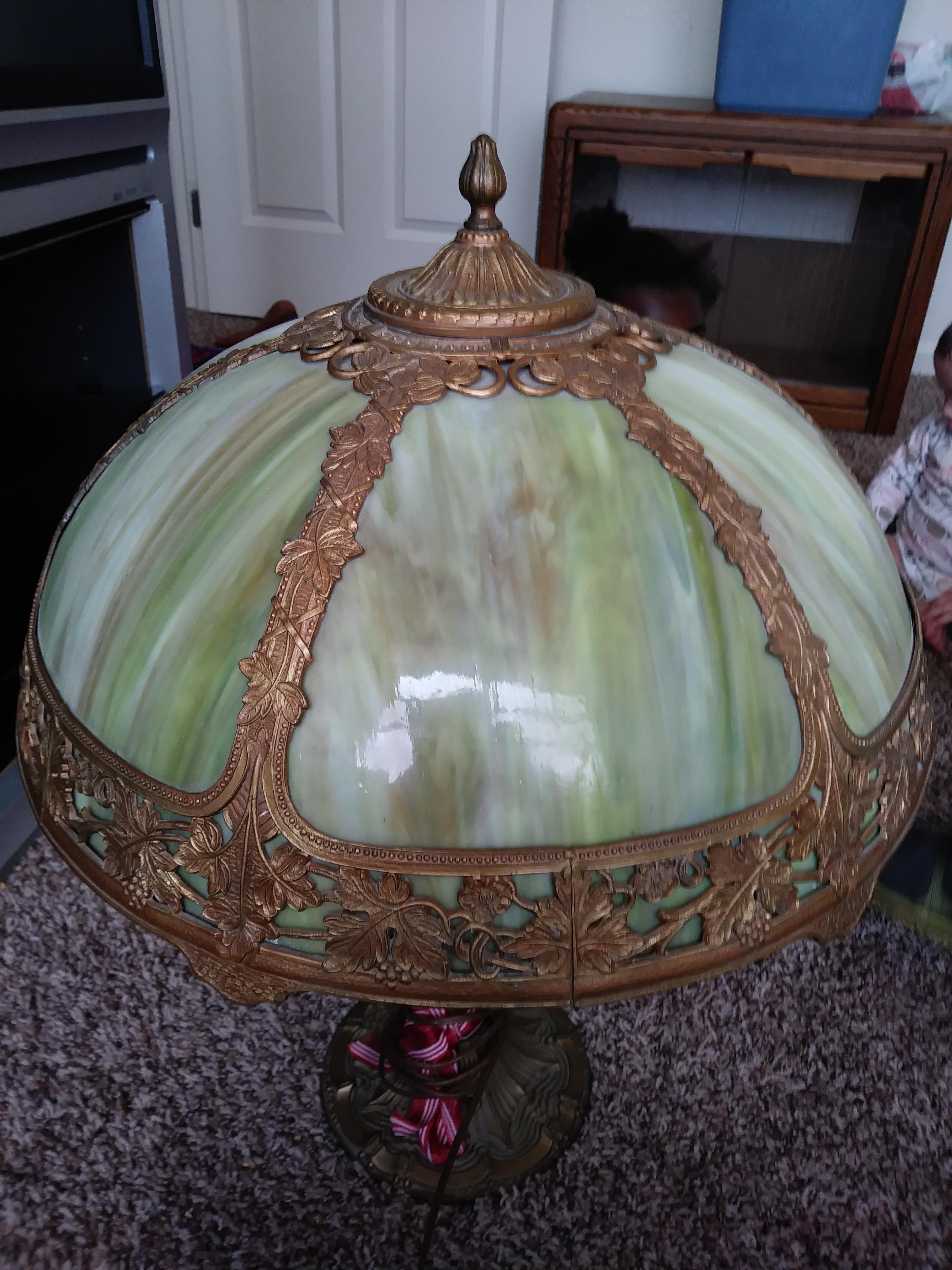 Green slag glass Salem Brothers lamp has the Salem Brothers logo and the number 13 on the bottom with I believe maple leaves and berries