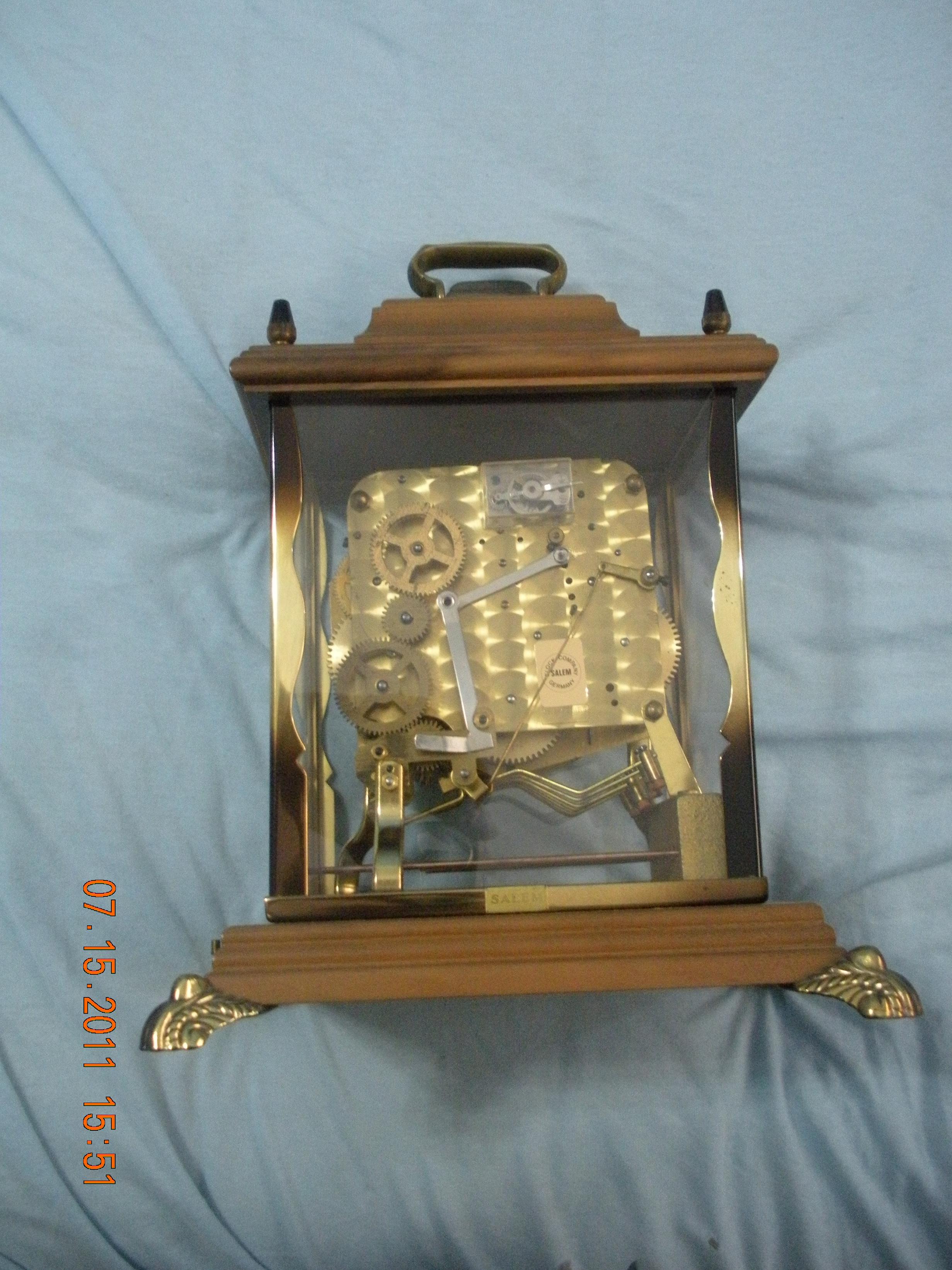 i dont know much ... its made of brass, wood and glass... The tag on the back says SALEM CLOCK GERMANY and inscribed below the tag in the brass is "Seven(7)Jewel"  its a musical clock with four settings.silent; St micel; whittingt; westm... im not even sure how to wind it up or anything