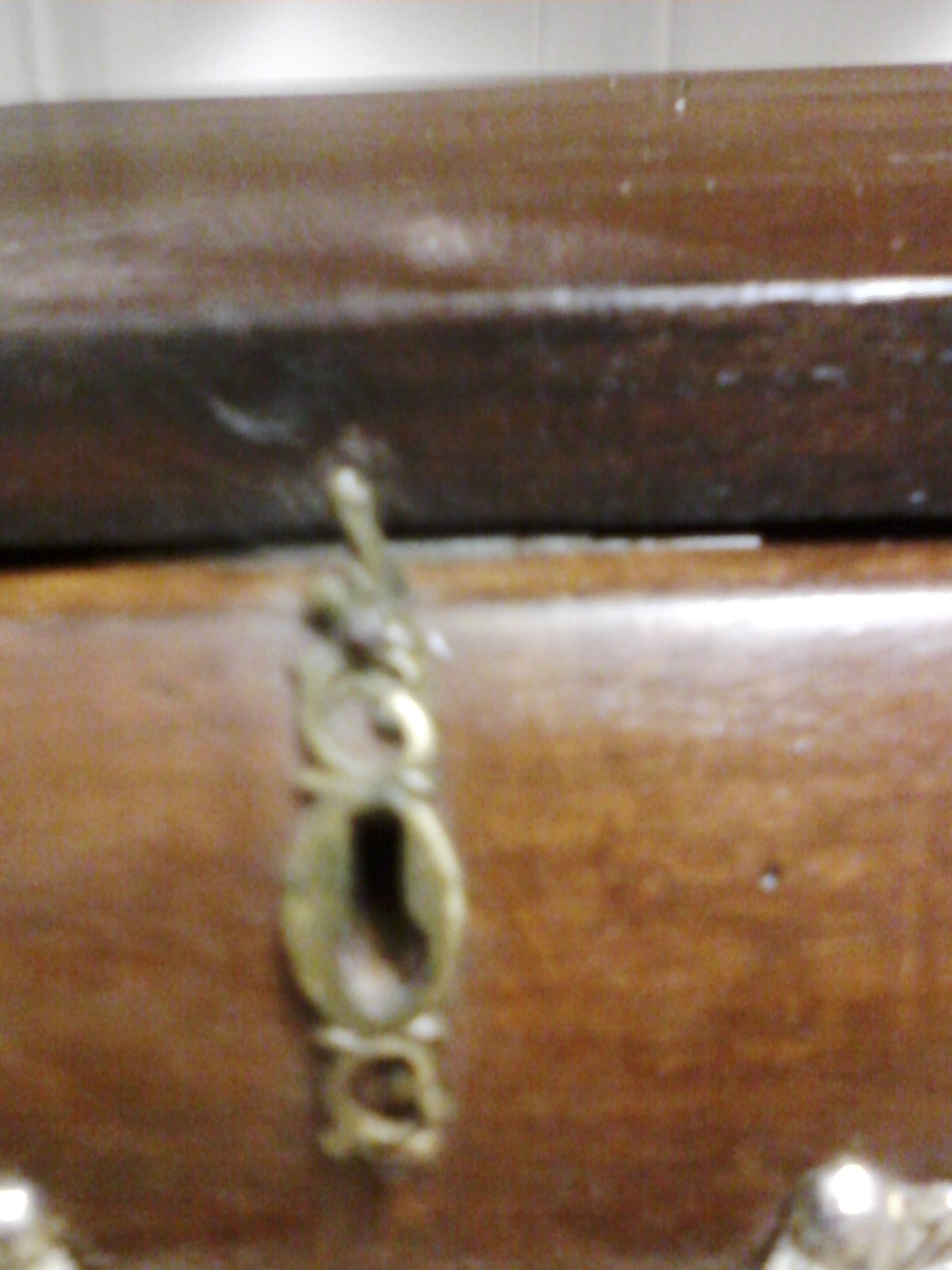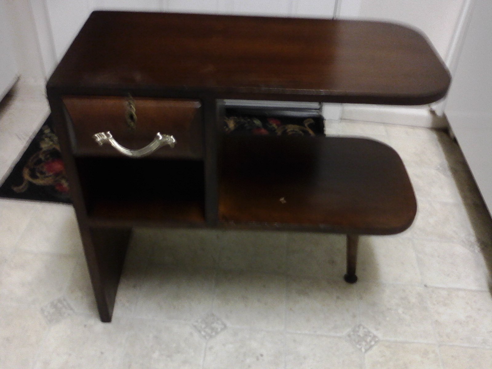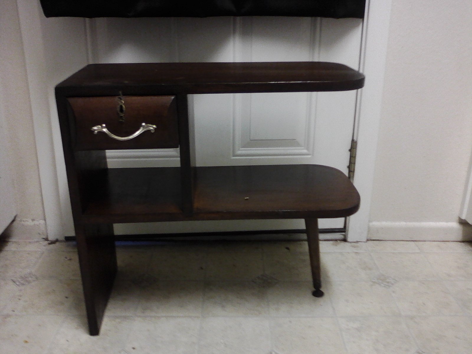 Small desk. peg leg. drawer has no rollers and is wood on wood. v.ery old looking lock, dark close grain wood. Heavy and thick wood. measures at 21" heighth, 221/2" length and 11" depth. Item was found in an old barn