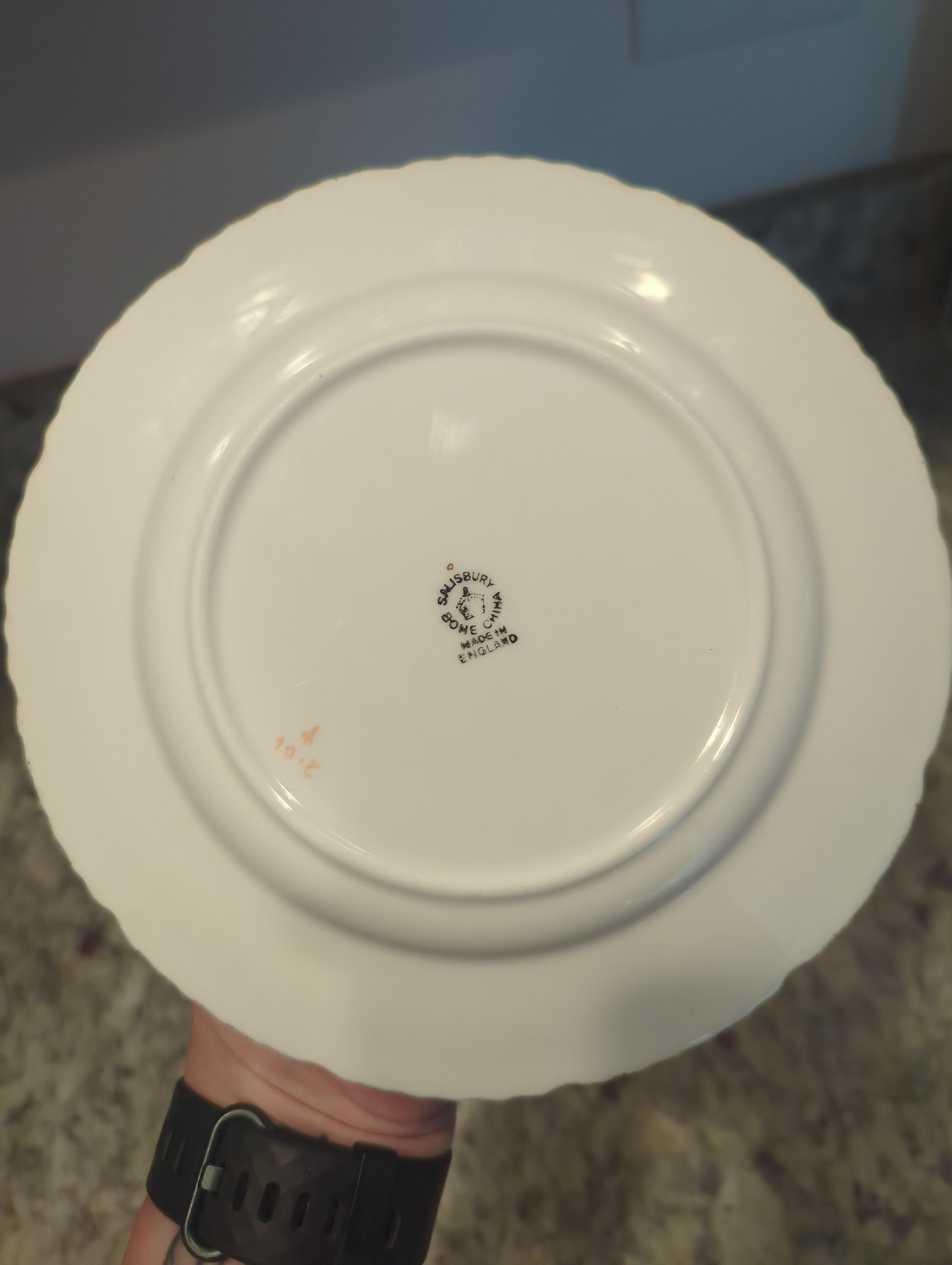 One plate with Salisbury bone China, made in England on the bottom, with the code 2106.