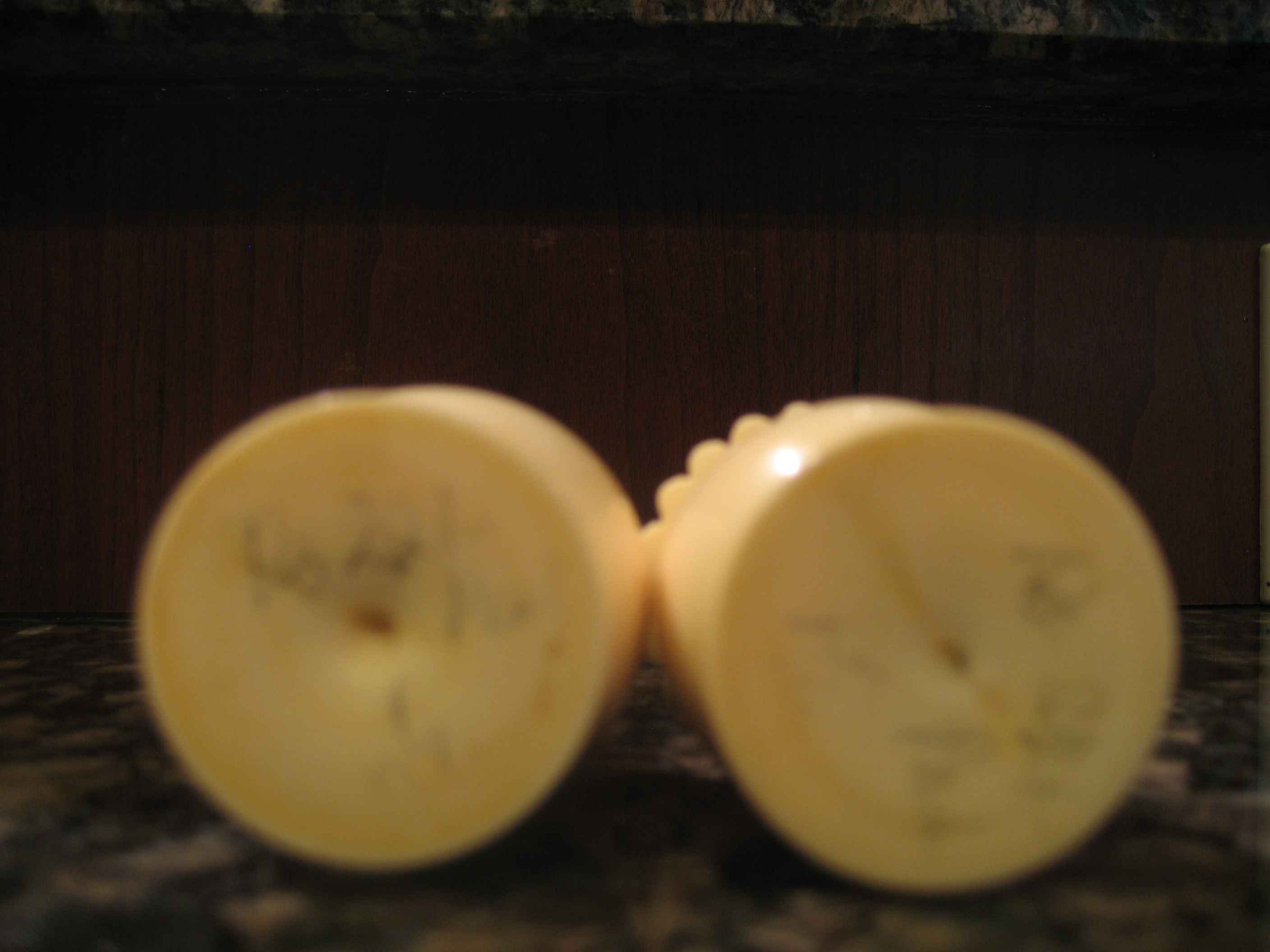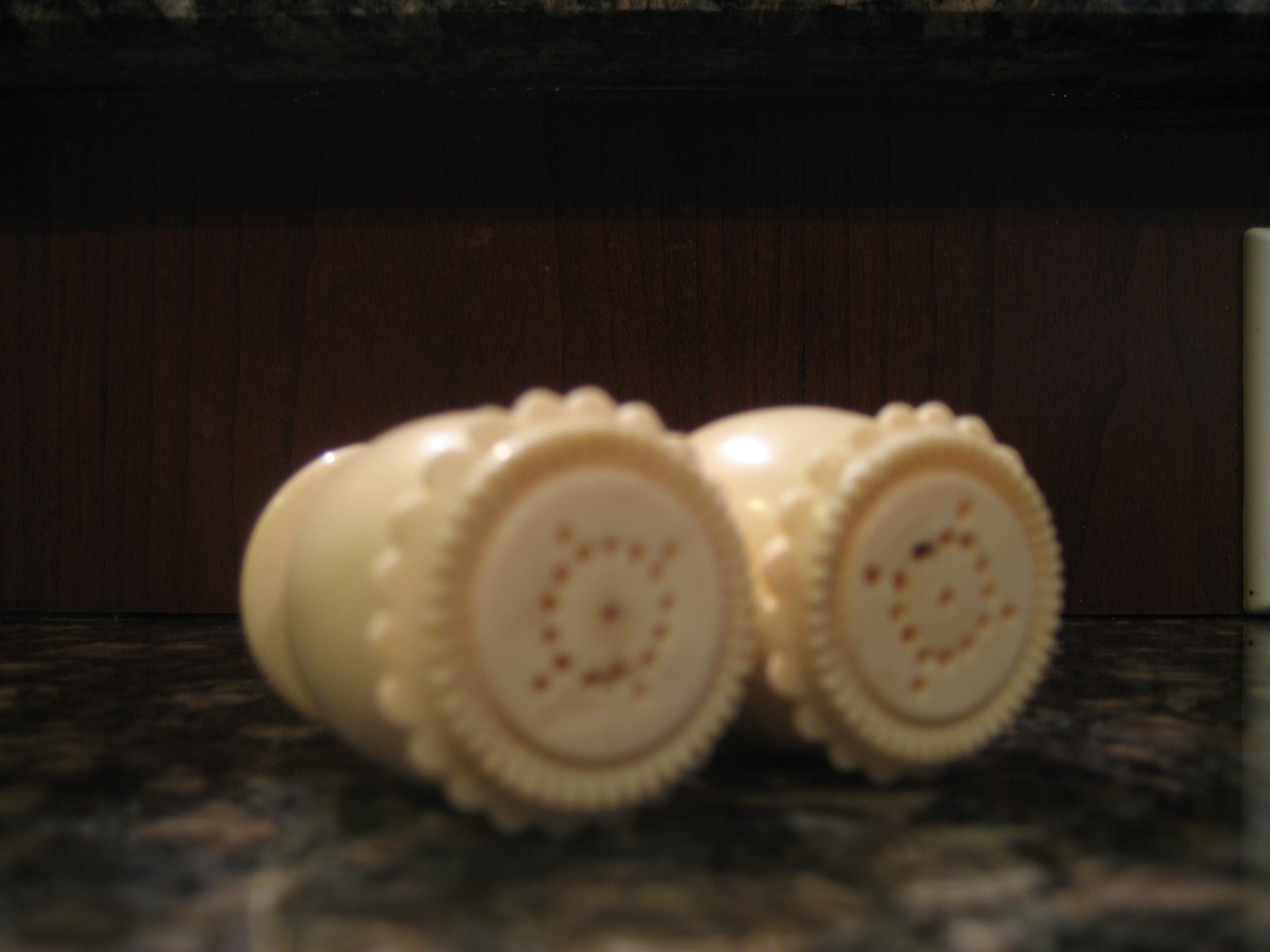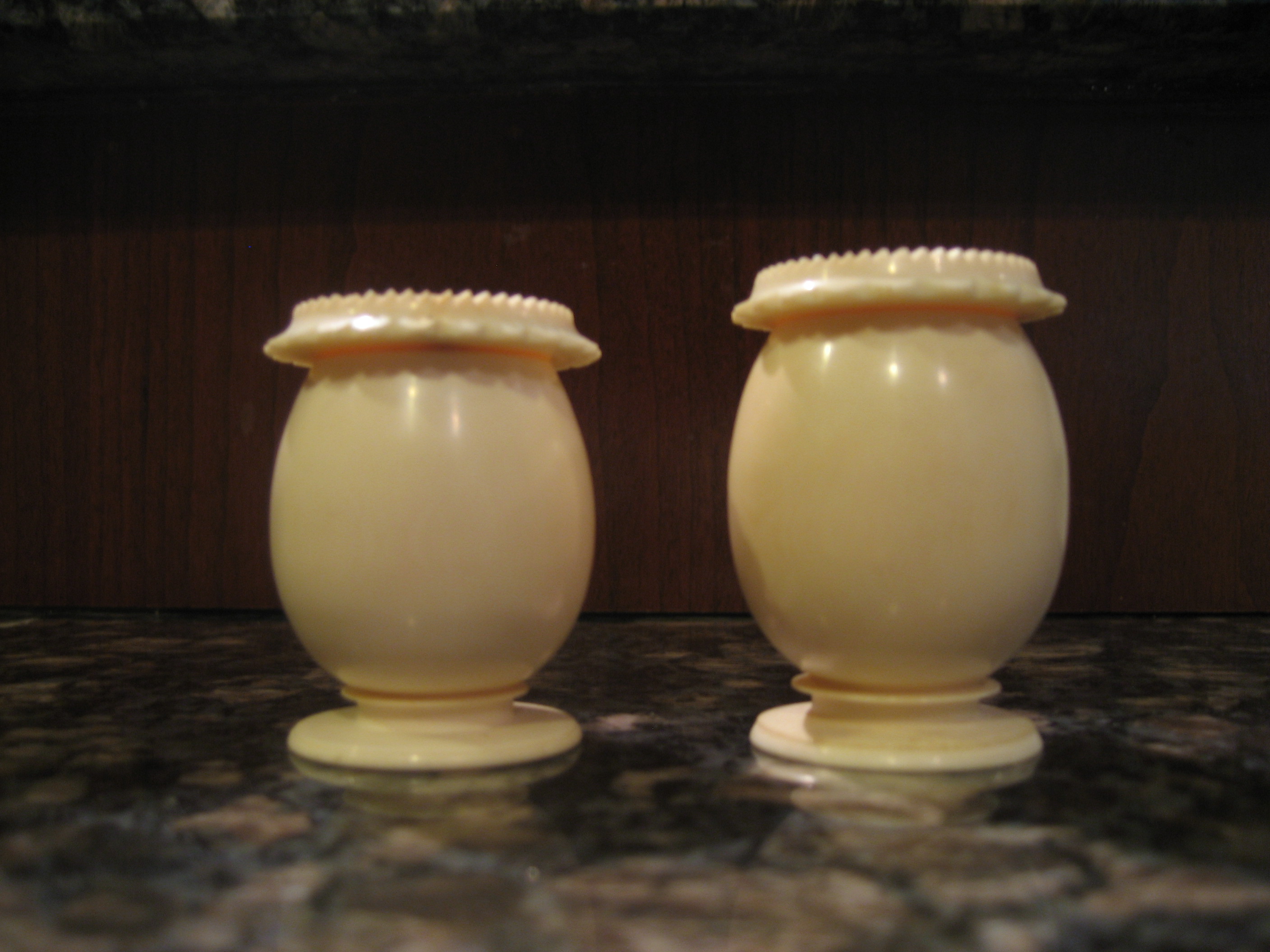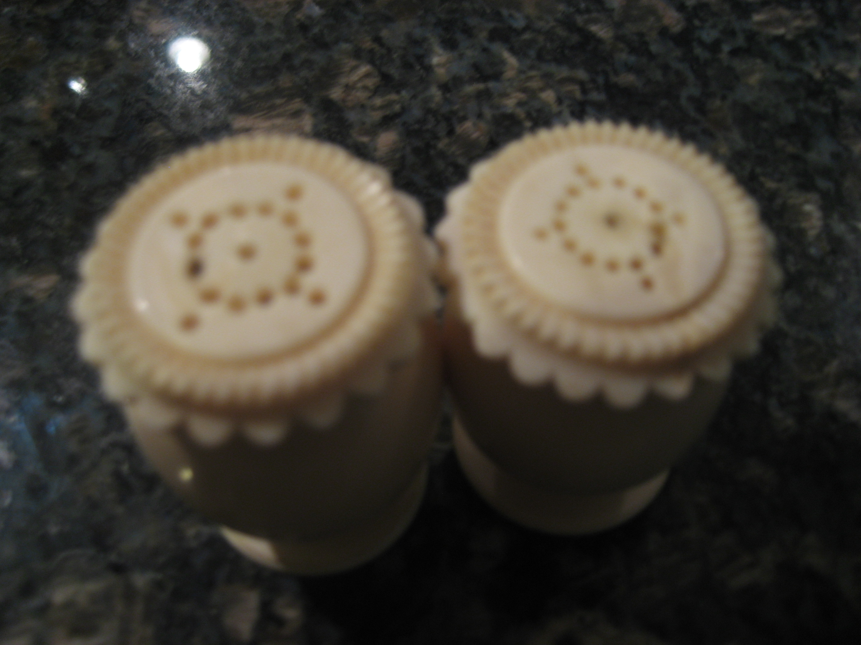 Salt and pepper shakers made of Ivory? Passed down from grandma. The marking on the bottom says Rs 221 Pad 34 on salt and Rs 221 34