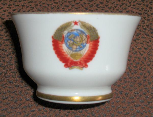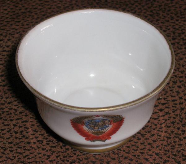 Small porcelain bowl that held salt, which is an official piece of USSR Kremlin dinnerware. This bowl was obtained during an official dinner at the Kremlin in 1987 that was hosted by Soviet Premier Mikhail Gorbachev. Provenance is a USSR itinerary of the official government visit (photo included).