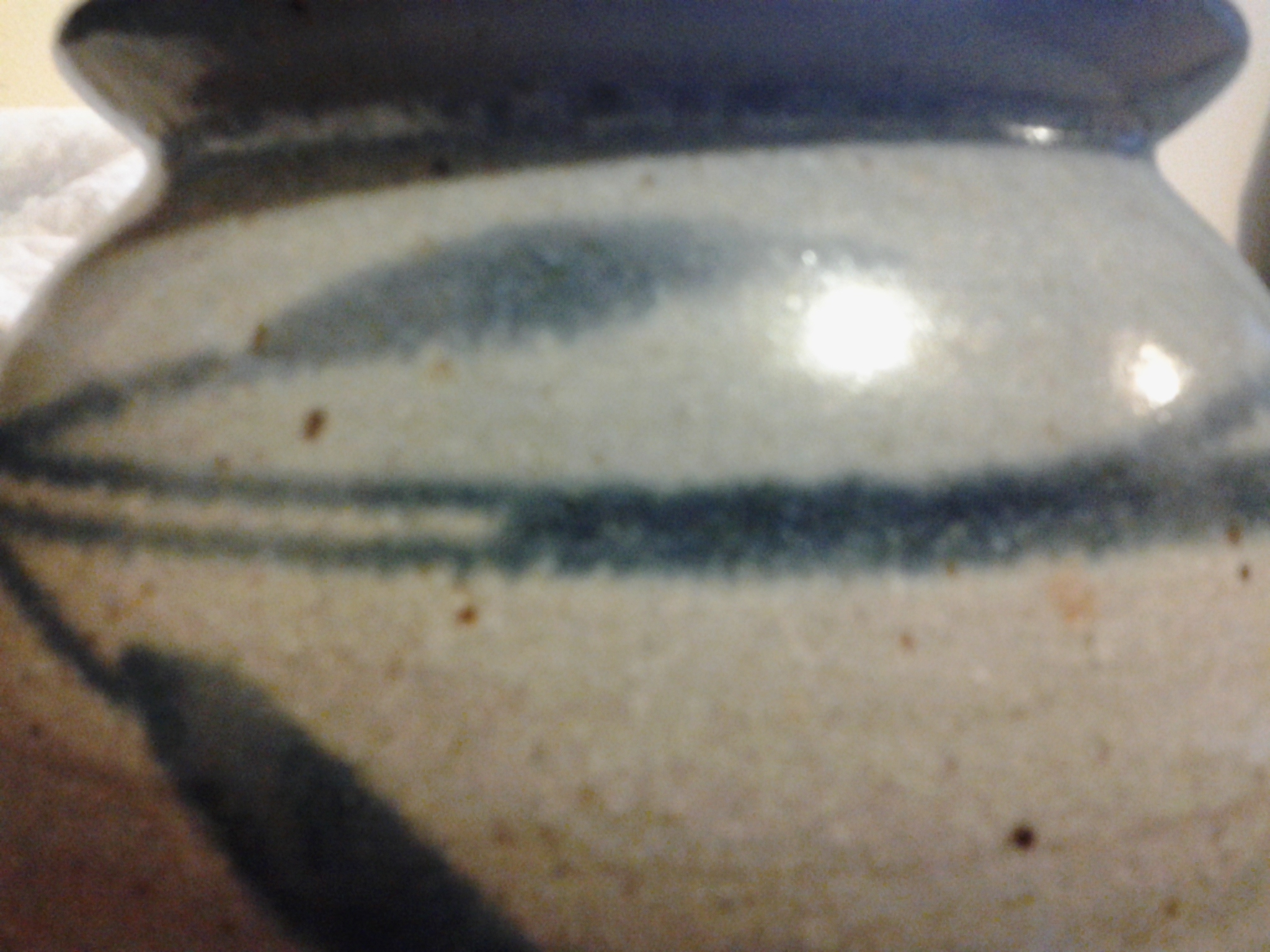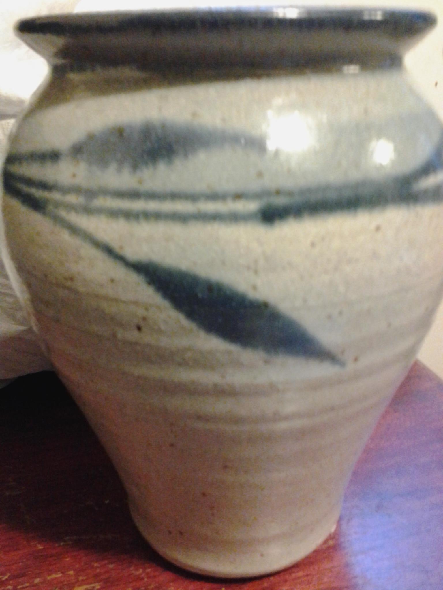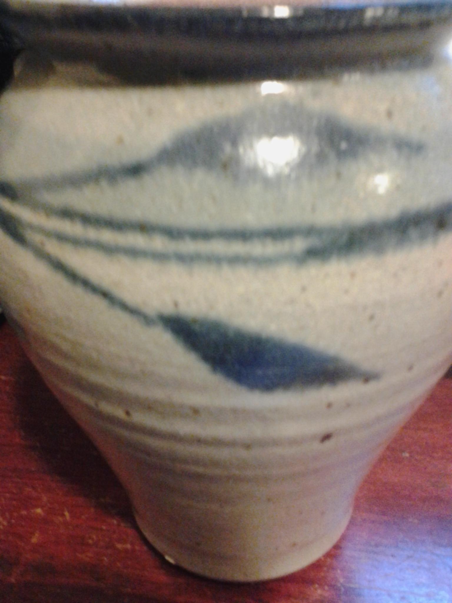 Hi! Any info would be wonderful on this vase. Looks to be stoneware salt glaze, speckled, slightly heavy, unglazed interior. Bought in California at a yard sale. Blue leaves scroll near the rim with diffused blue. Ribbed texture around the lowerbody. Perfect vintage condition. Bottom is unmarked or faded away. Measures about 7" tall. Appeears to be rowe, possibly Wisconsin stoneware. Thanks! :-)