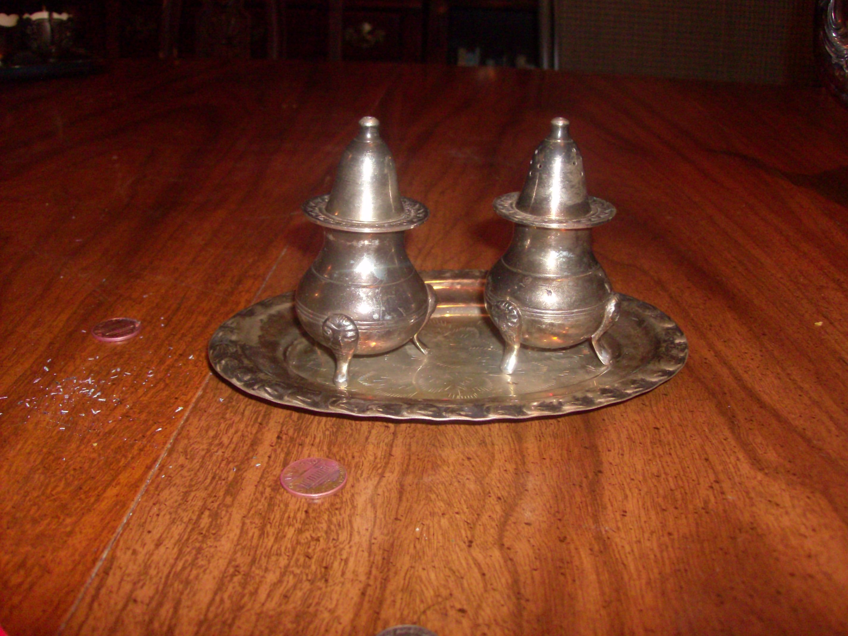 Silver plated salt and pepper shaker. It has the tray for them but i don't have the box.