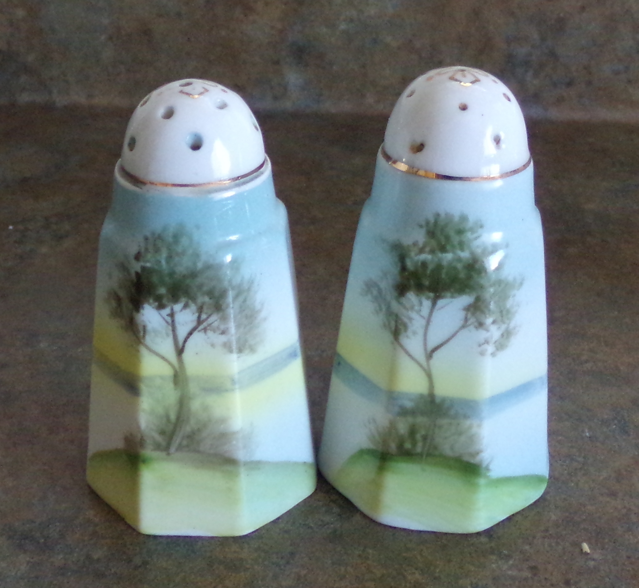 Porcelain or China Salt & Pepper Shakers, hand painted, gold trim