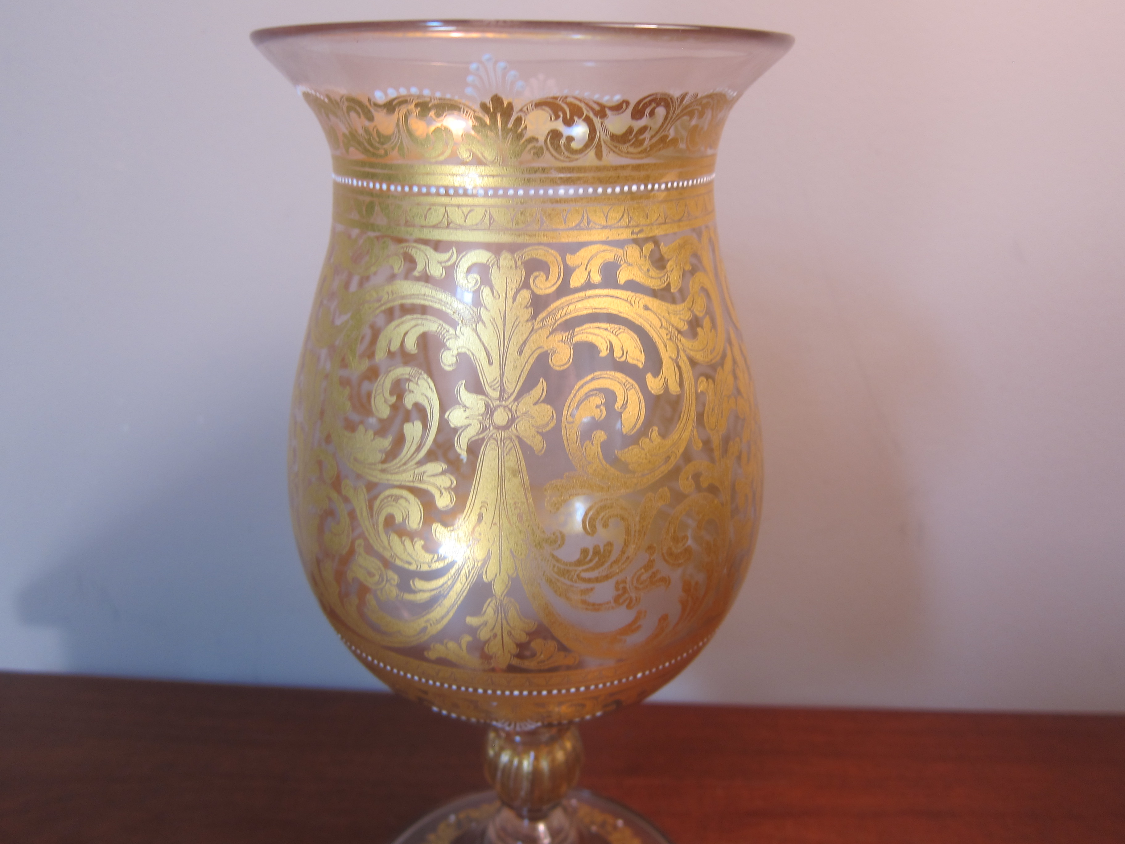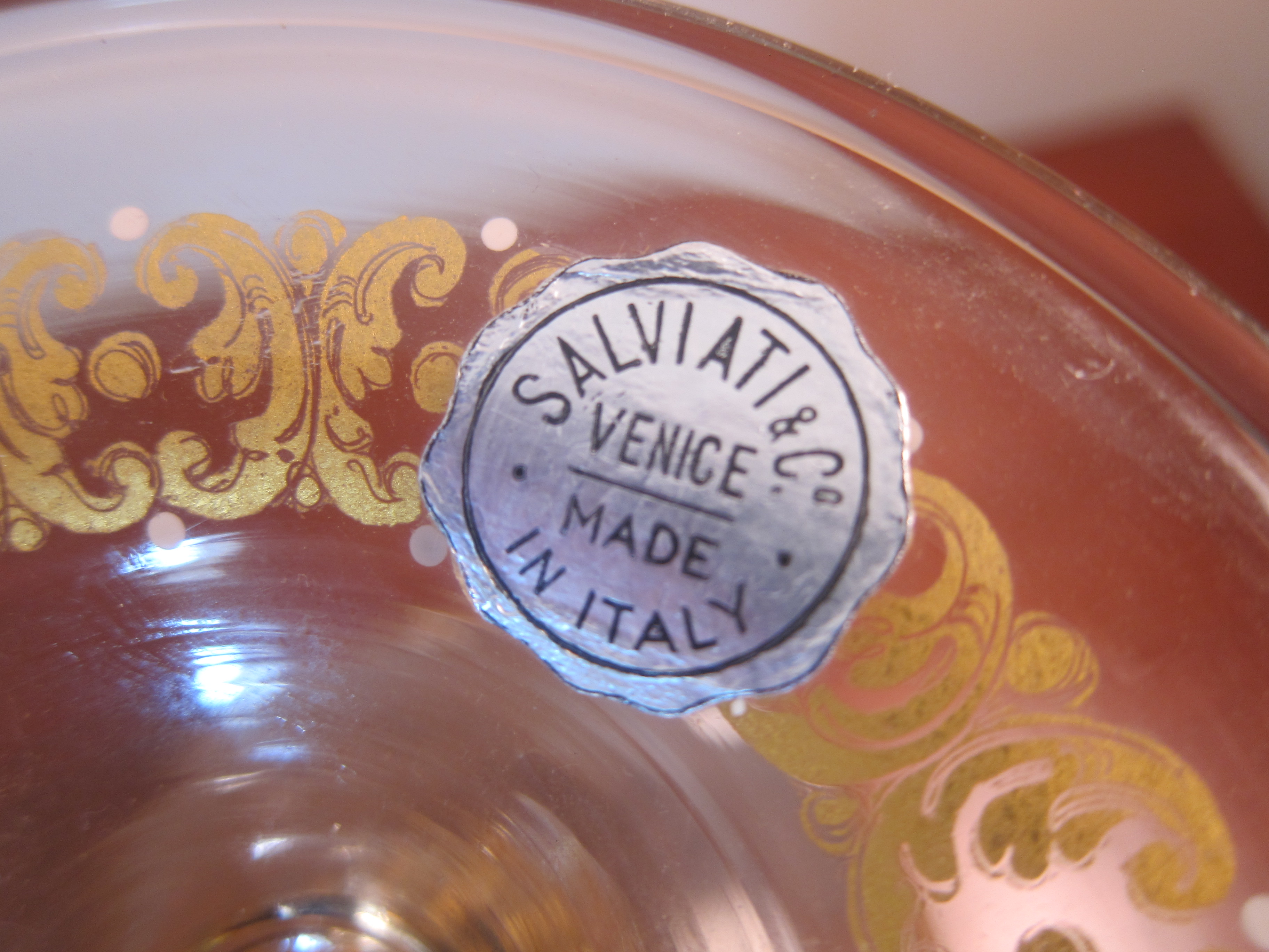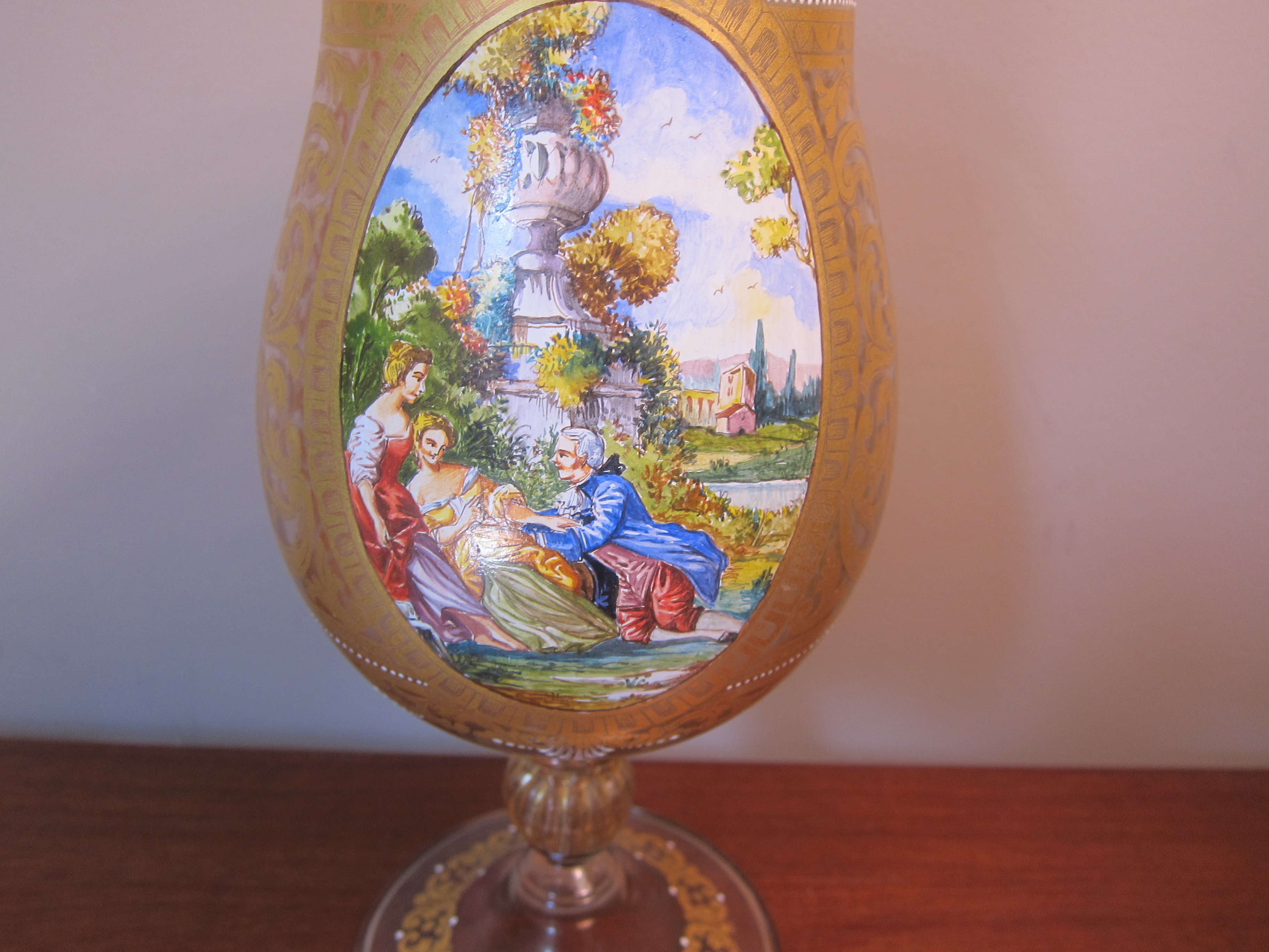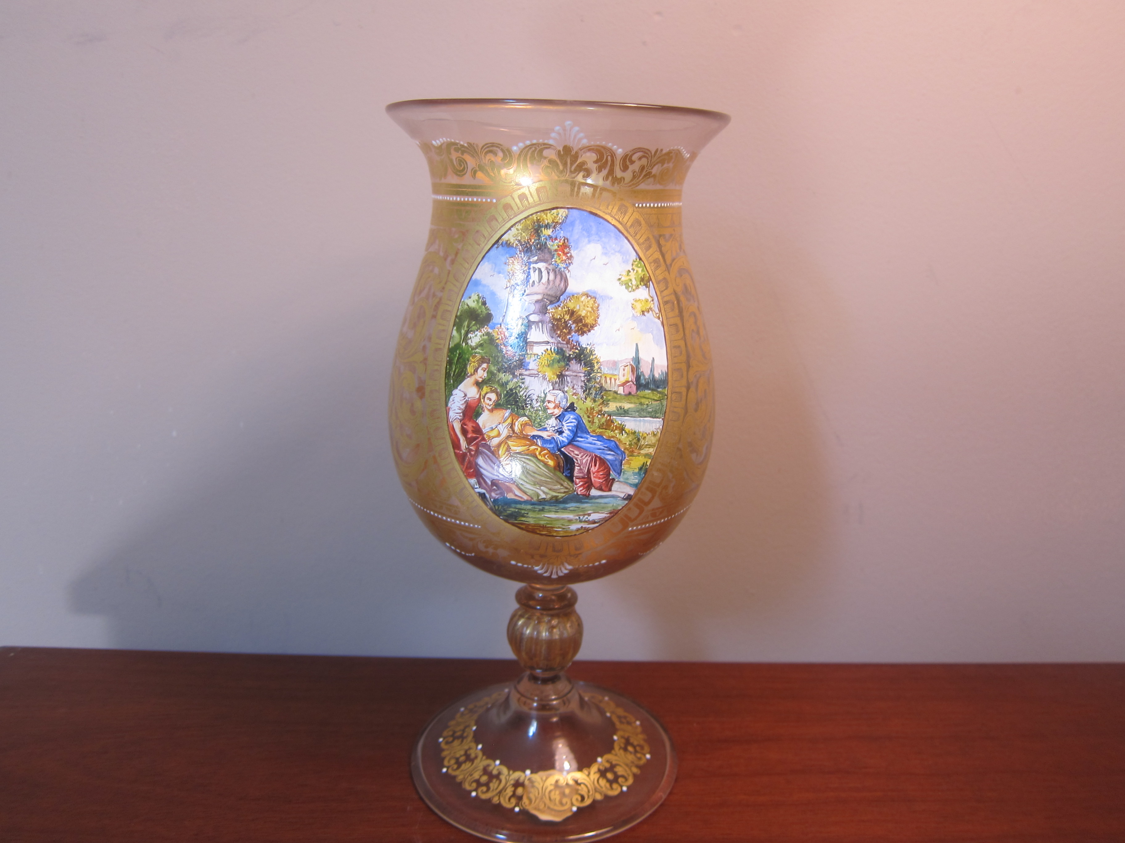 This has a sticker labeled Salviati & Co Venice Made in Italyand is gold gilded with a leaf scroll, enamal whte dots in the design (raised) and a painting of victorian people. This stands 10 inches tall; the base is 4 inches in diameter; and the opening at the top is 4.5 inches. Do not know any history of the item other than it came from an unclaimed storage facility with many high end antiques and sterling. I had two of these and one broke just under the cup so this is fragile. I would like to know more about the company; how old or new this piece may be and the value.