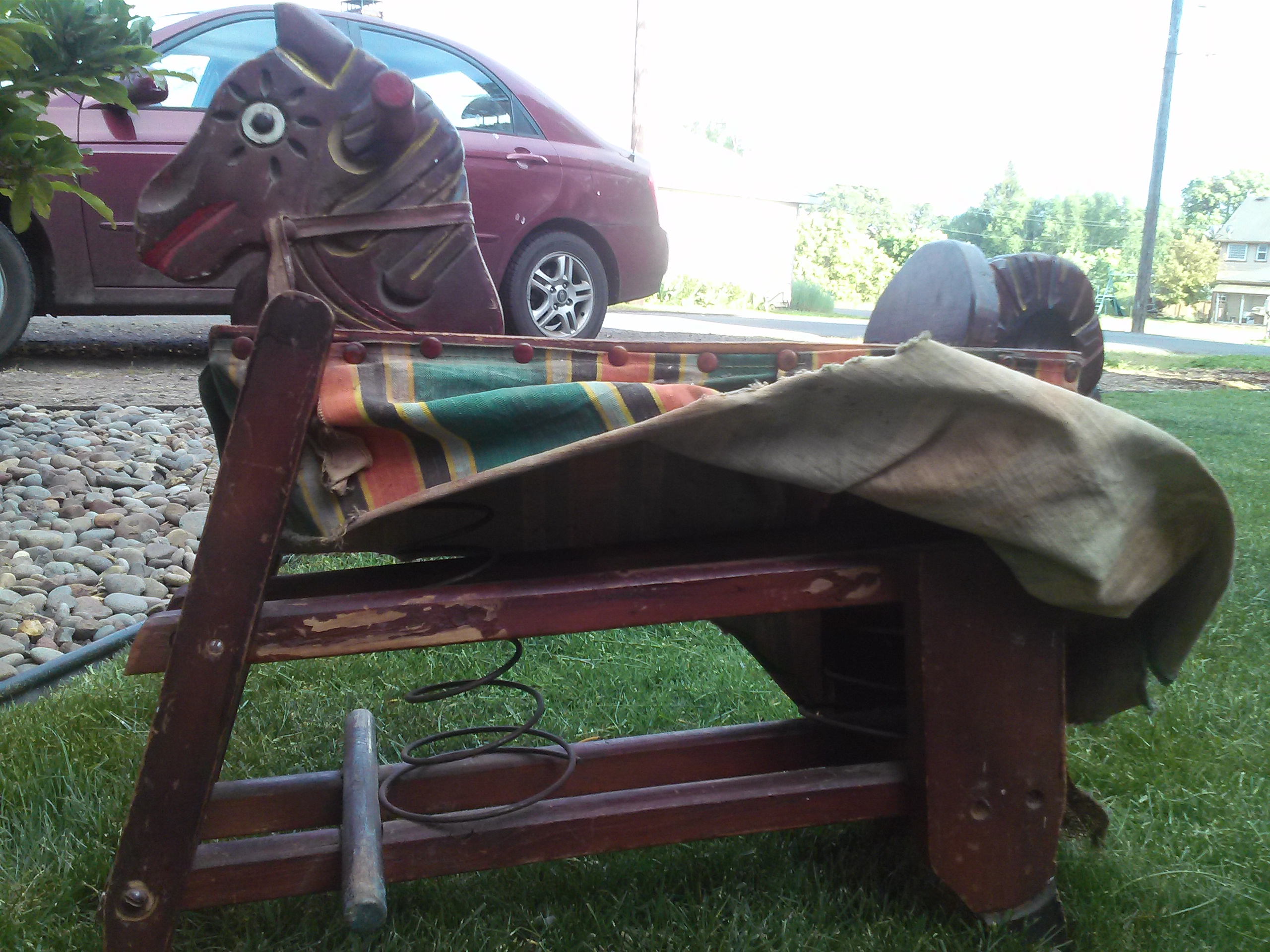 A very unique spring/coil bouncy horse with a stamp on the side that says "A Sam Belz Product - Memphis, Tenn."