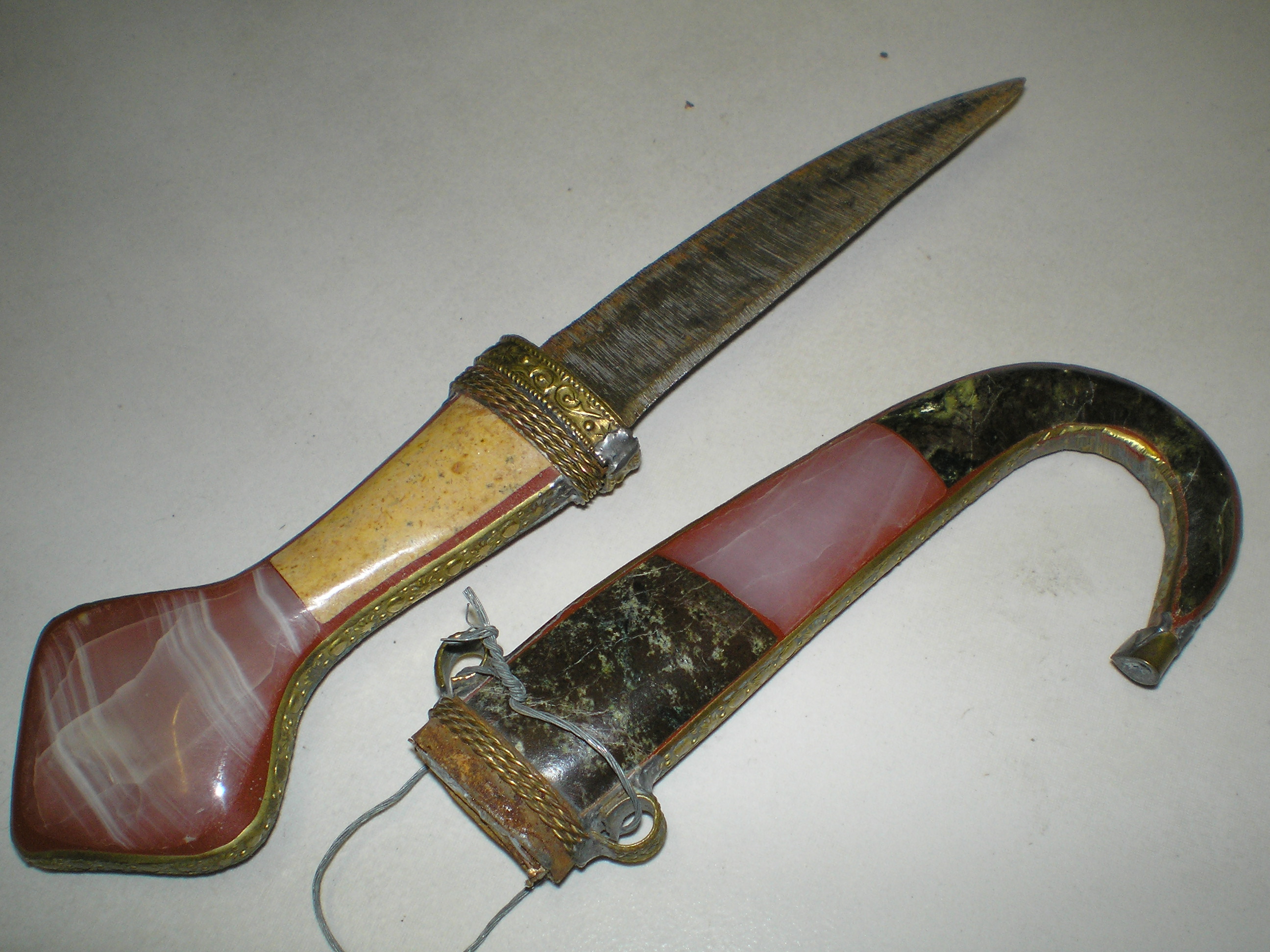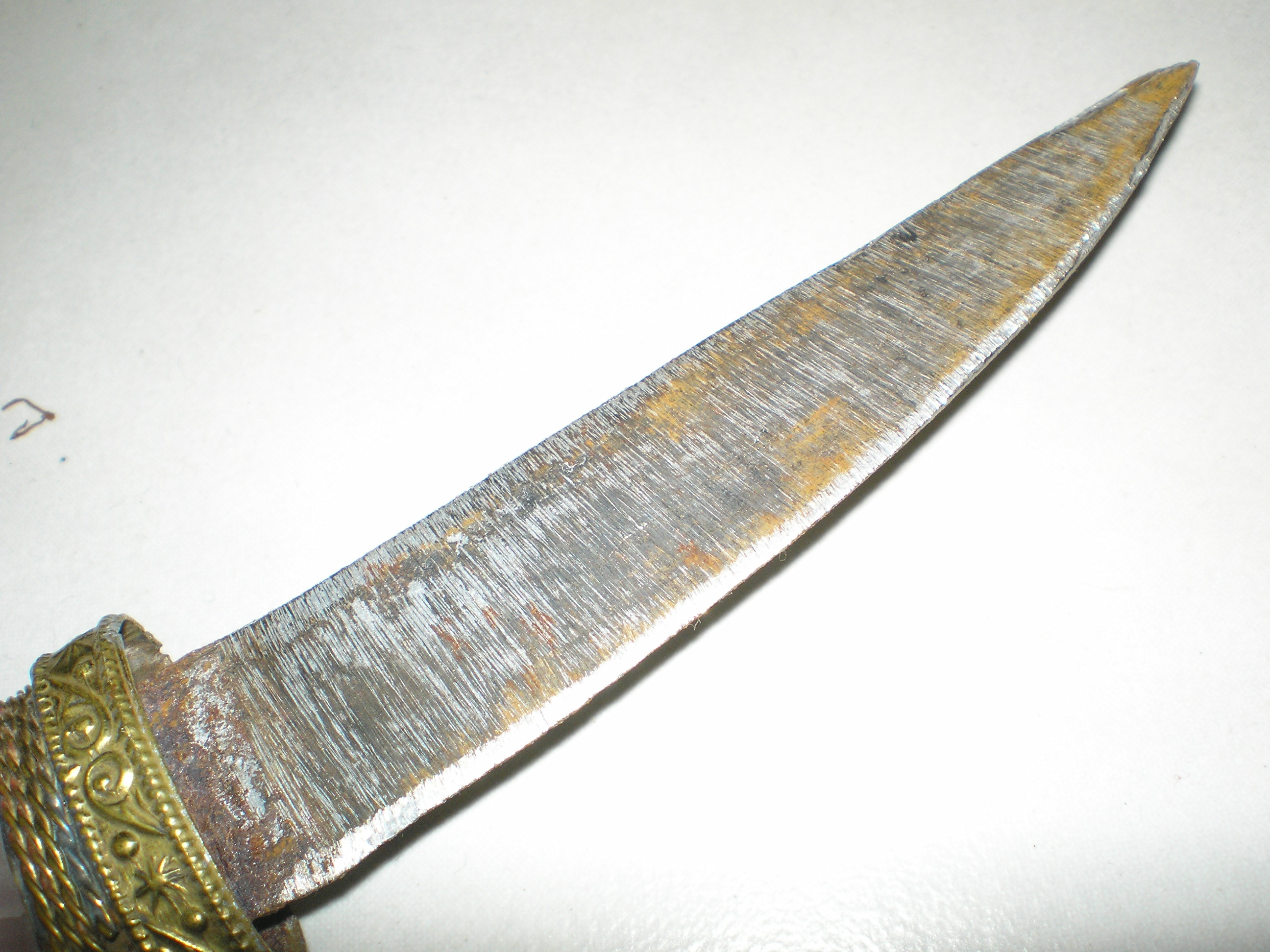 the handle on the blade is approx 2" across at the widest point, the inside where the blade joins the hilt is rusty as is inside the scabbard. there appears to be some restorative work on the hilt and the end, the blade has areas of rust and has verticle lines possibly from being sharpened. I can't find any makers marks or signature.