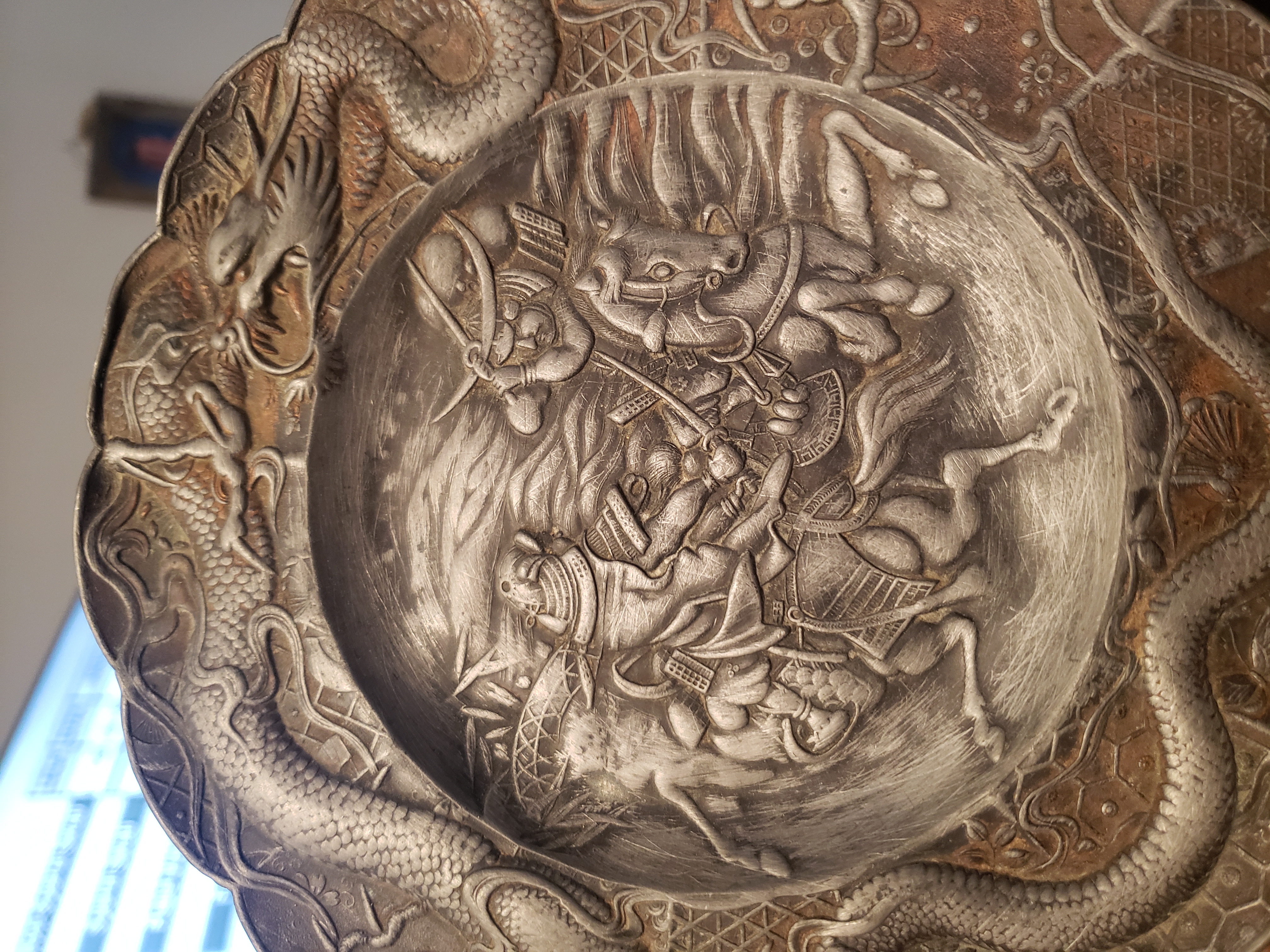 Has two samurais fighting in the middle and a dragon around the outside of the plate