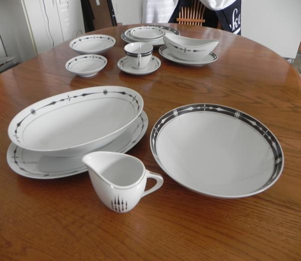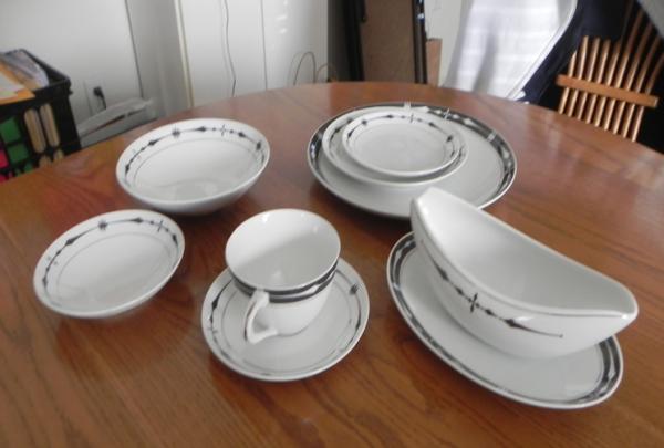 Sango 1965 NeoClassic Charcoal with Silver Trim. 10 pc place settings. Place setting includes: Plate, salad plate, bread plate, bowl, desert bowl, cup and saucer. It also has complete serving setting ware. Large round serving bowl, large oblong serving bowl, serving plater, gravy tureen, small platter, creamer