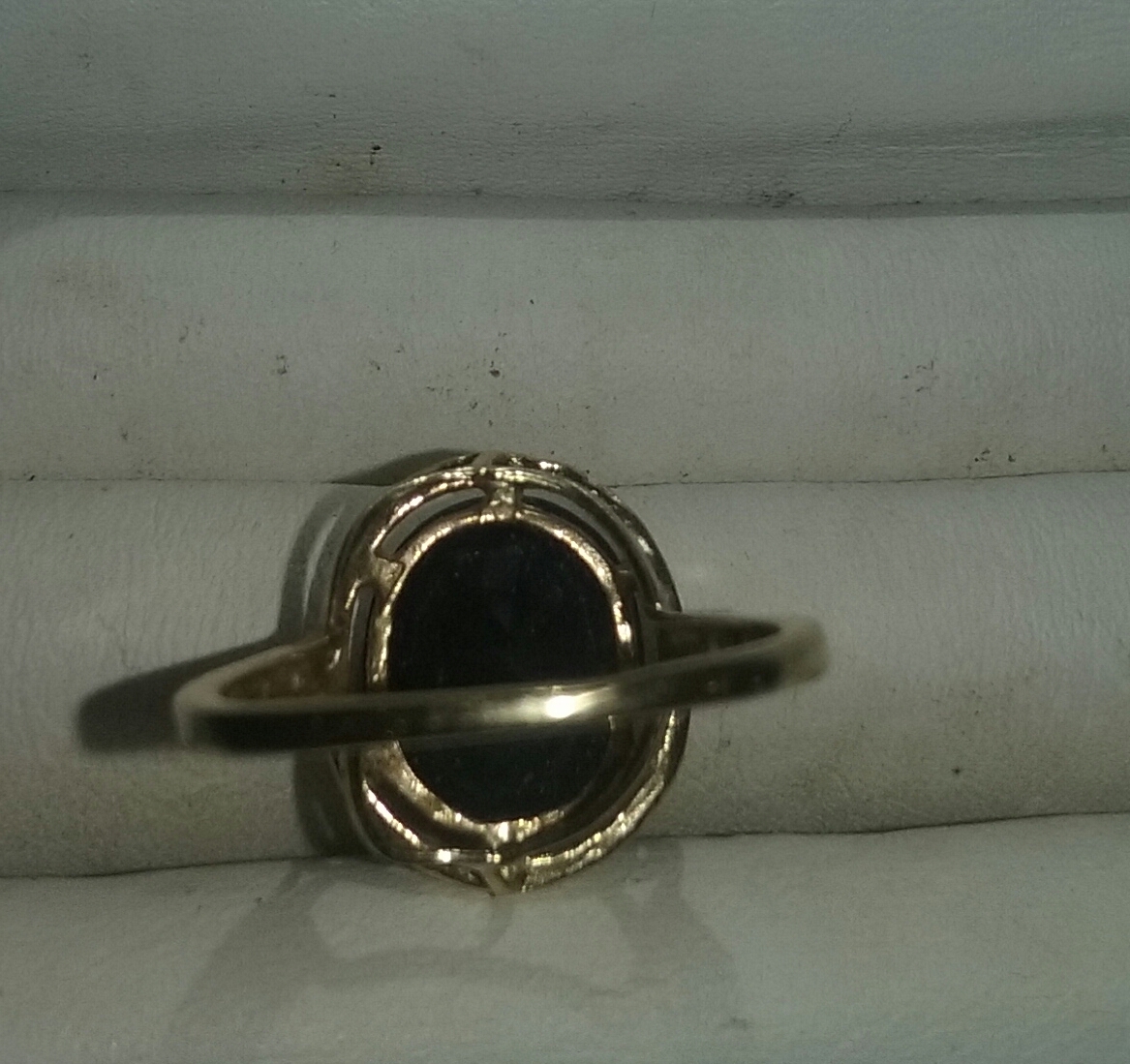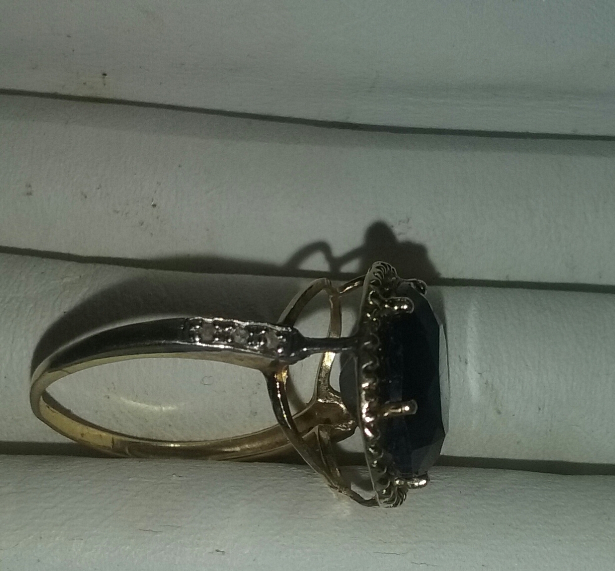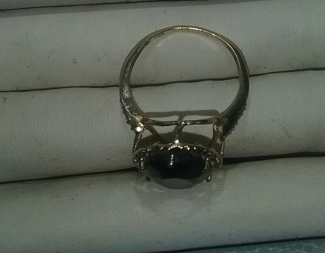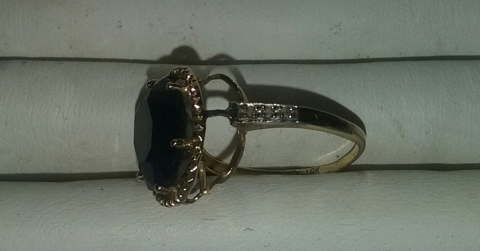 A big sapphire gem on a 10 karat yellow gold band with 4 diamonds on each side of sapphire in the band.