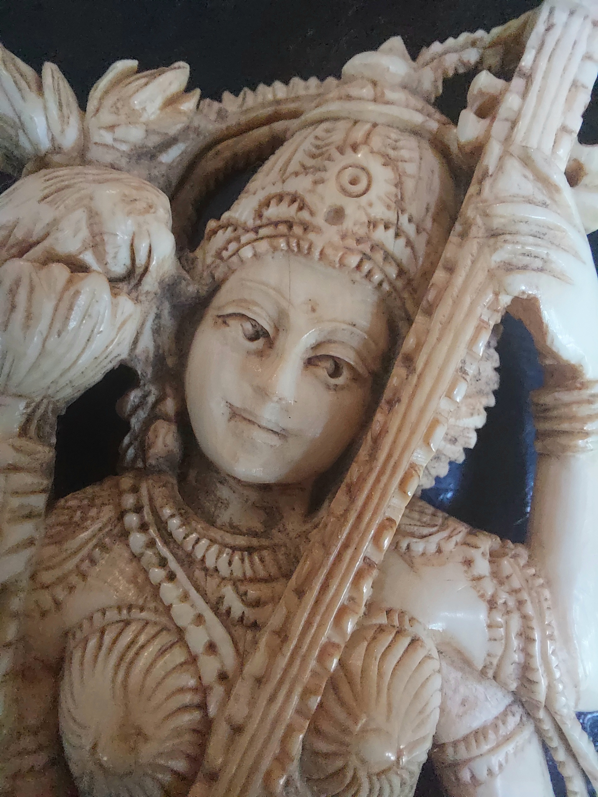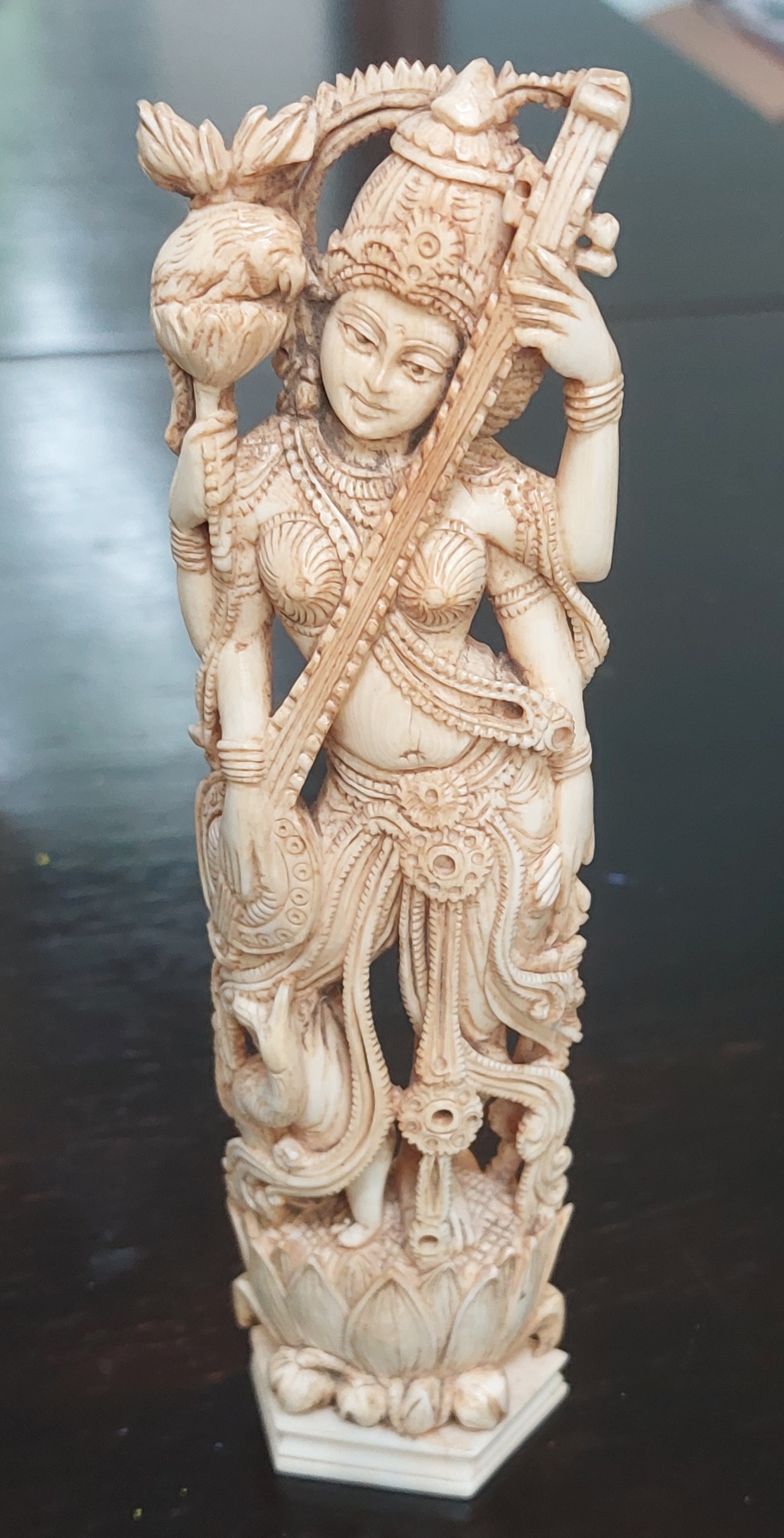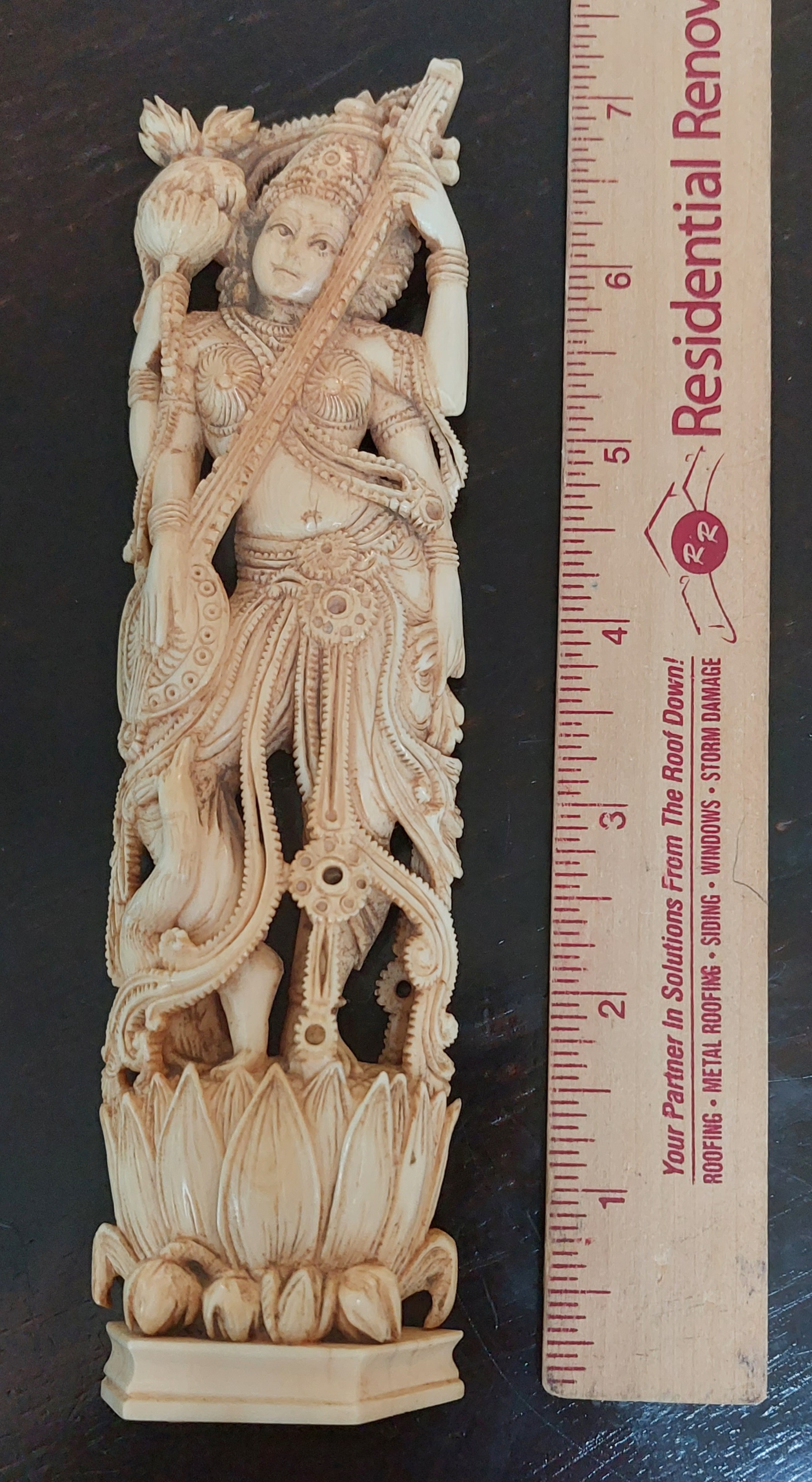This is a carving of the Indian goddess Saraswati. I believe it to be ivory from the hole through the bottom center as well as the irregular circular lines on her stomach and face, although I am not certain. Unfortunately, I have almost no information on it other than that. I actually purchased it from a Salvation Army a while back and assumed it was plastic, but I thought it was lovely. I didn't see its number marking or the hole in the bottom until I peeled off the price tag. I was hoping that someone could give me a clue as to whether or not it is ivory and maybe a way to identify it?