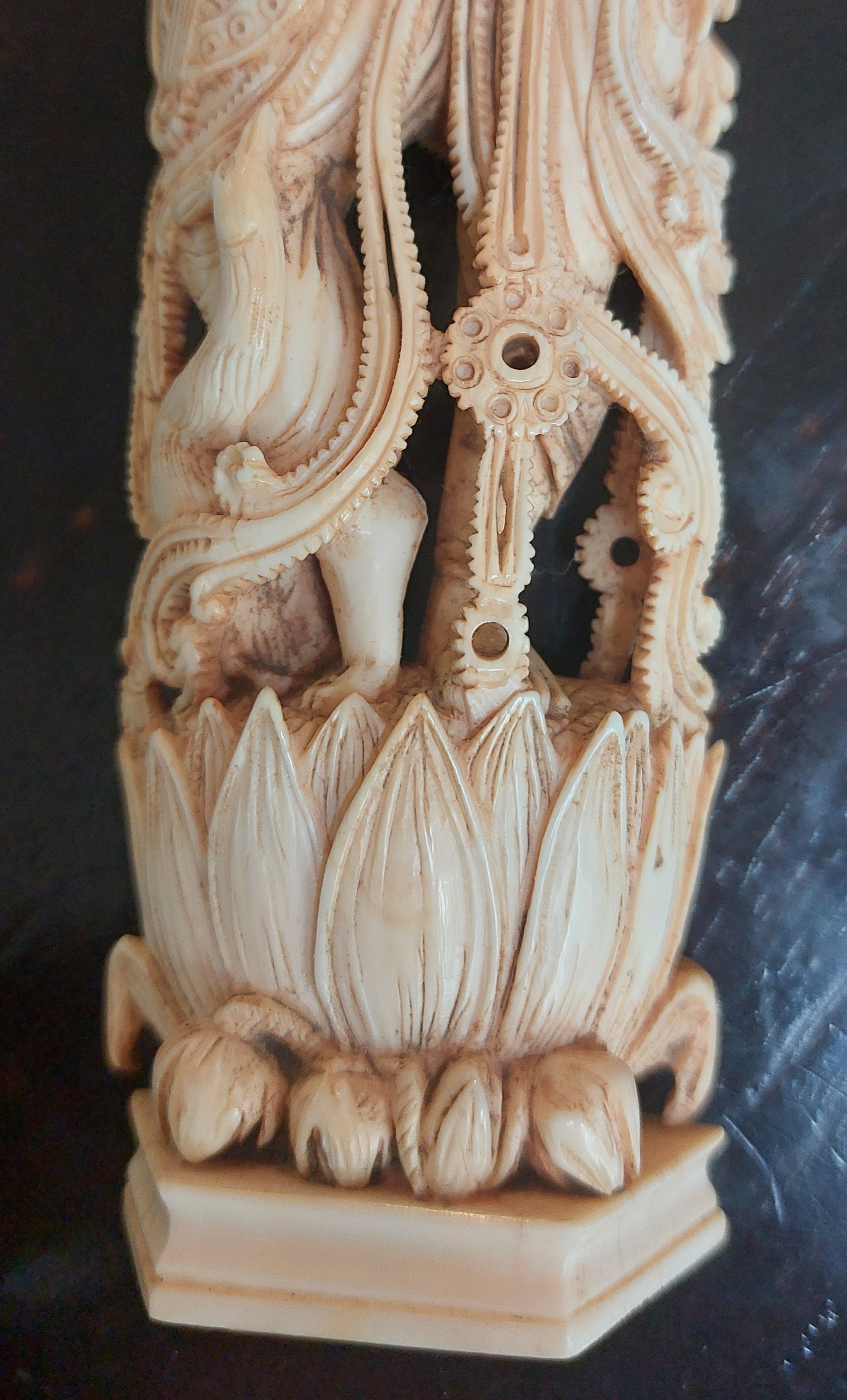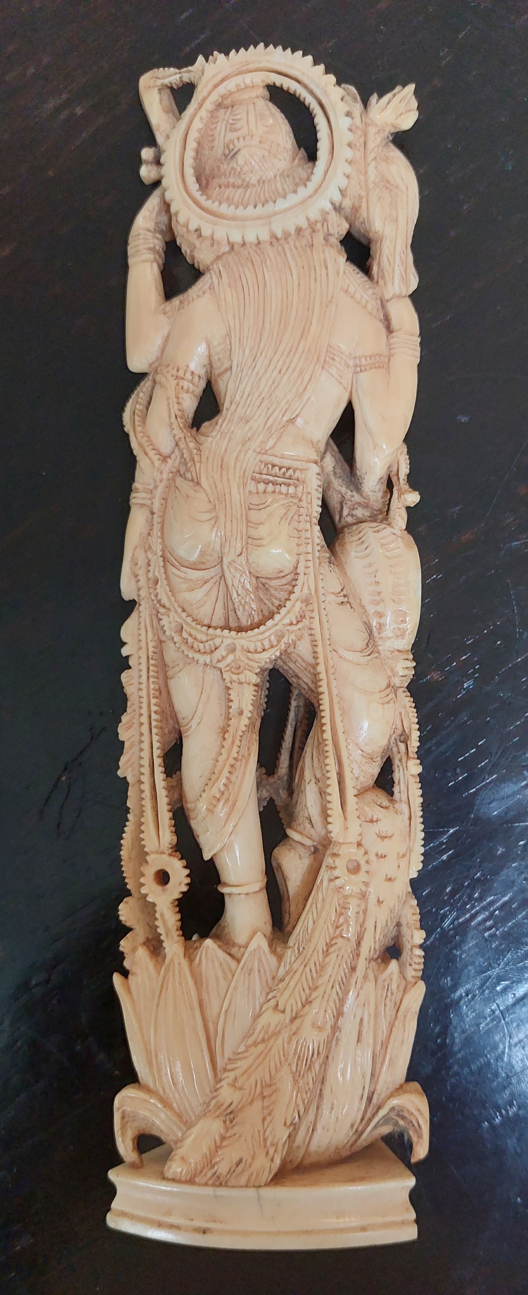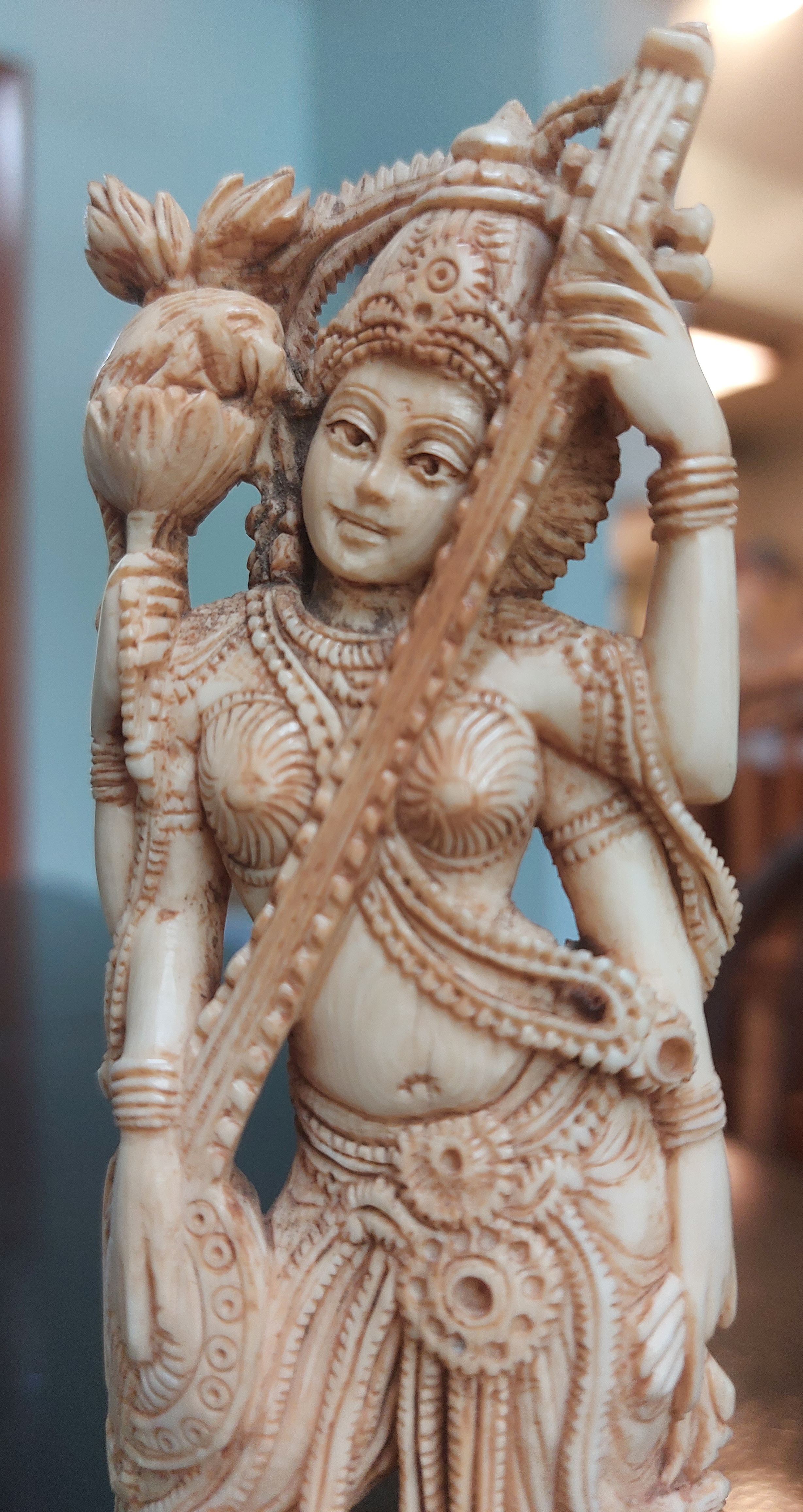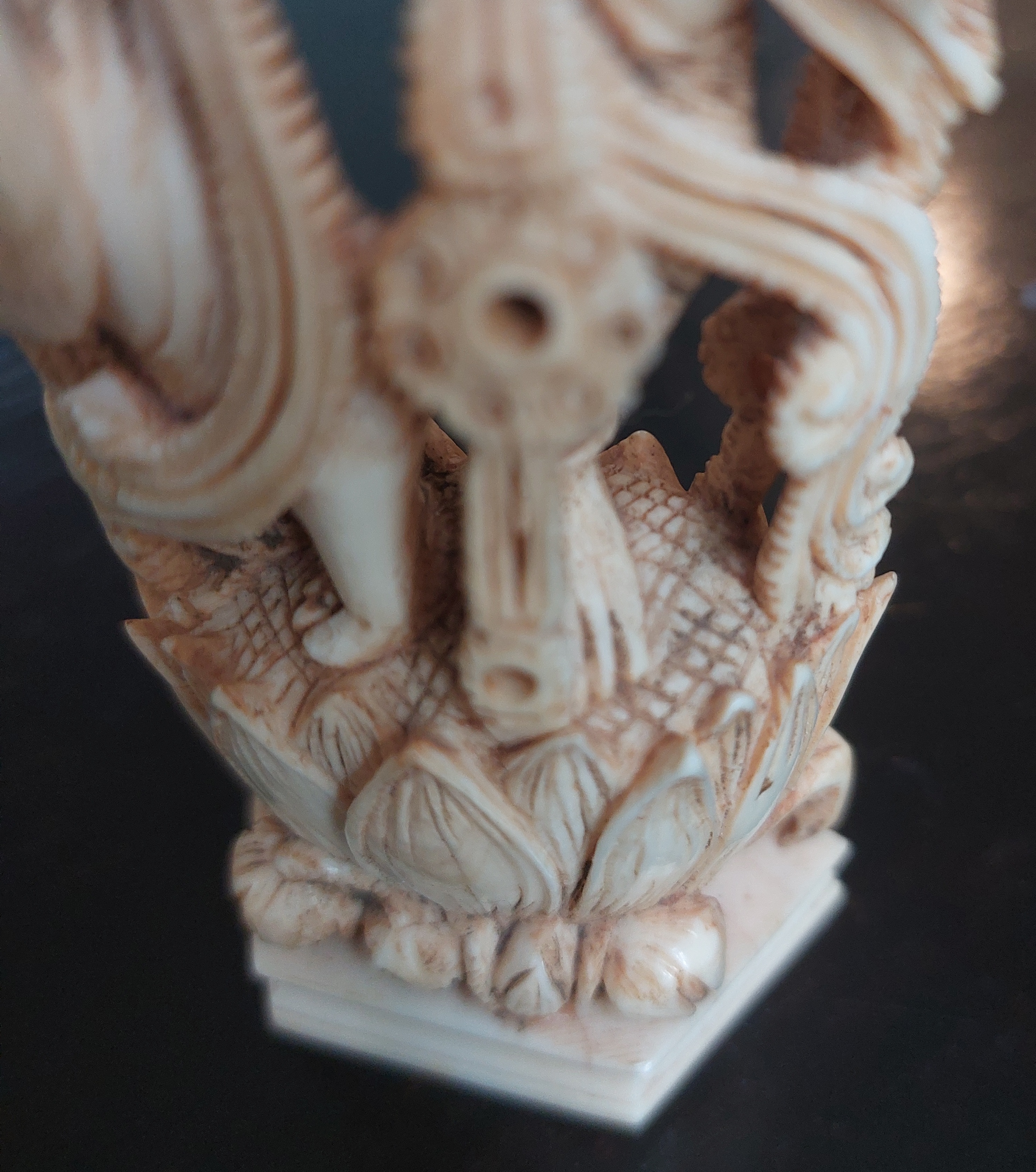 This is a carving of the Indian goddess Saraswati. I believe it to be ivory from the hole through the bottom center as well as the irregular circular lines on her stomach and face, although I am not certain. Unfortunately, I have almost no information on it other than that. I actually purchased it from a Salvation Army a while back and assumed it was plastic, but I thought it was lovely. I didn't see its number marking or the hole in the bottom until I peeled off the price tag. I was hoping that someone could give me a clue as to whether or not it is ivory and maybe a way to identify it?
